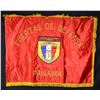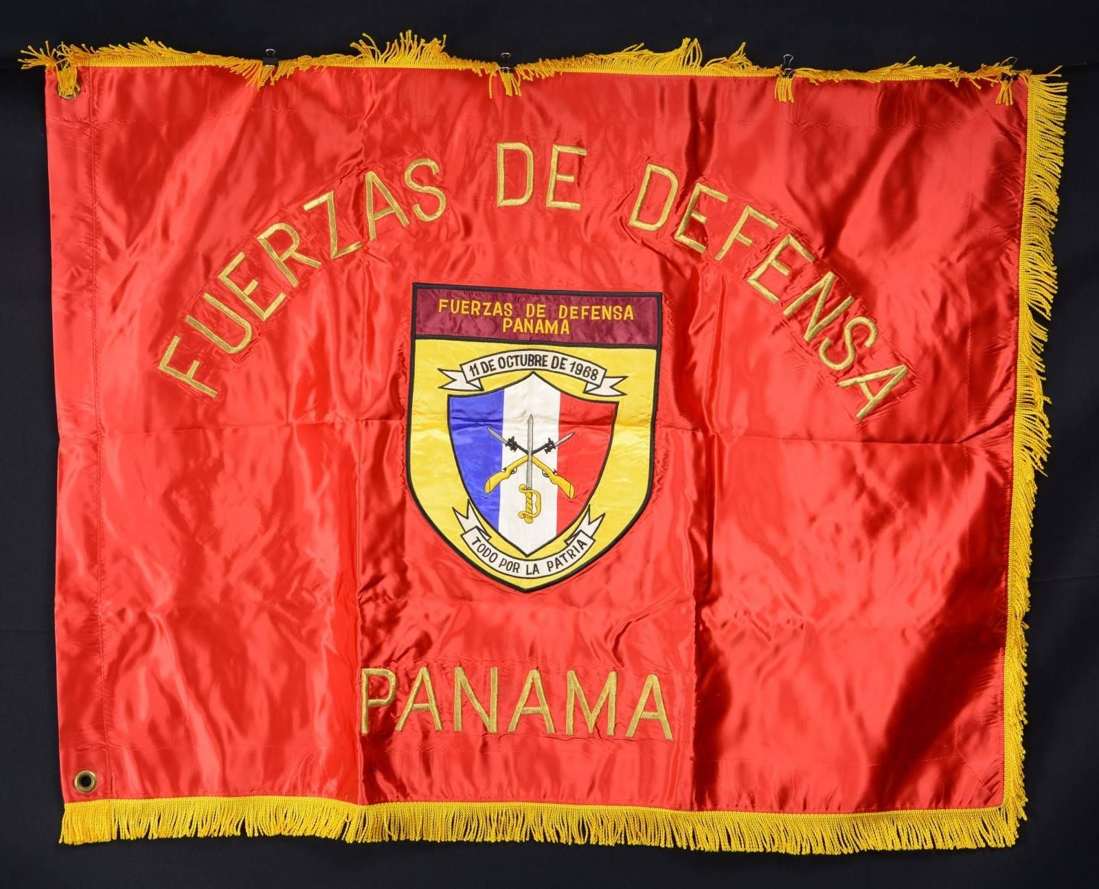 3x4' double applique insignia and gold letters on red field, gold fringe, 2 large brass grommets. Panamanian defense force ceased to exist after the 1989 American invasion of Panama in operation “Just Cause” to remove Manuel Noriega. This flag was probably a souvenir by American GI. The Panama Defense Forces (Fuerzas De Defensa Panama) were created in 1983 by General Manuel Noriega upon his promotion to that grade in August. The command had originally been the Panamanian National Guard which was largely a military police force. Noriega's original intent was to make them a professional military army to protect the Panama Canal along with the US Army units stationed in that nation. In October 1989, some units of the Defense Forces attempted a coup against Noriega and were defeated and Noriega turned against an election that was held to depose him. However, in December 1989, the US military invaded the nation due to Noriega being wanted for drug trafficking and other issues capturing Noriega and installing a more democratic government and constitution. The Panama Defense Forces were then disbanded. They were replaced by the National Police which remains today. The Panama Defense Forces had at its height of strength, four infantry battalions, eight infantry and military police companies as well as some support units including a civilian militia. Also, under control of the PDF were the Fuerza Policia (Police Force) which was charged with law enforcement and highway patrol plus transit police for the cities. The flag bears the Coat of Arms of the Panamanian military. The date October 11, 1968 relates to the Panama military coup that took place at that time. Then President Arnulfo Madrid angered his military through transfers and reorganizations causing some officers to consider deposing him. On October 11th, Major Boris Martinez and Lt. Colonel Omar Torrijos Herrera offered the presidency to two men, including the sitting Vice President Raul Arango. They declined so the coup set up a governing board, repealed all civil rights and the Constitution of 1946. Supporters of President Madrid took to the streets in small guerrilla formations attacking places in the country. In late February 1969, another coup led by Colonel Torrijos toppled the governing board with the support of then Major Manuel Noriega. Torrijos defeated all threats, was promoted to general and ruled Panama until he turned it over in 1978 (but he retained control of the National Guard). While ruling the nation, Torrijos sought to get control of the Panama Canal and negotiated with U.S. President Jimmy Carter finally signing a treaty in 1977. Torrijos died in a mysterious plane crash on July 31, 1981. In which the chief suspect for that remains the CIA. It had been intended for a series of fellow military officers to succeed him and Noriega was on that list. The Coat of Arms has the date of the 1968 coup and a slogan (“All For the Country” in Spanish) plus crossed rifles and a sword. The flag dates between 1983 and late 1989 when the force was disbanded. CONDITION: very good overall. (02-19982-7/JS). $200-300.