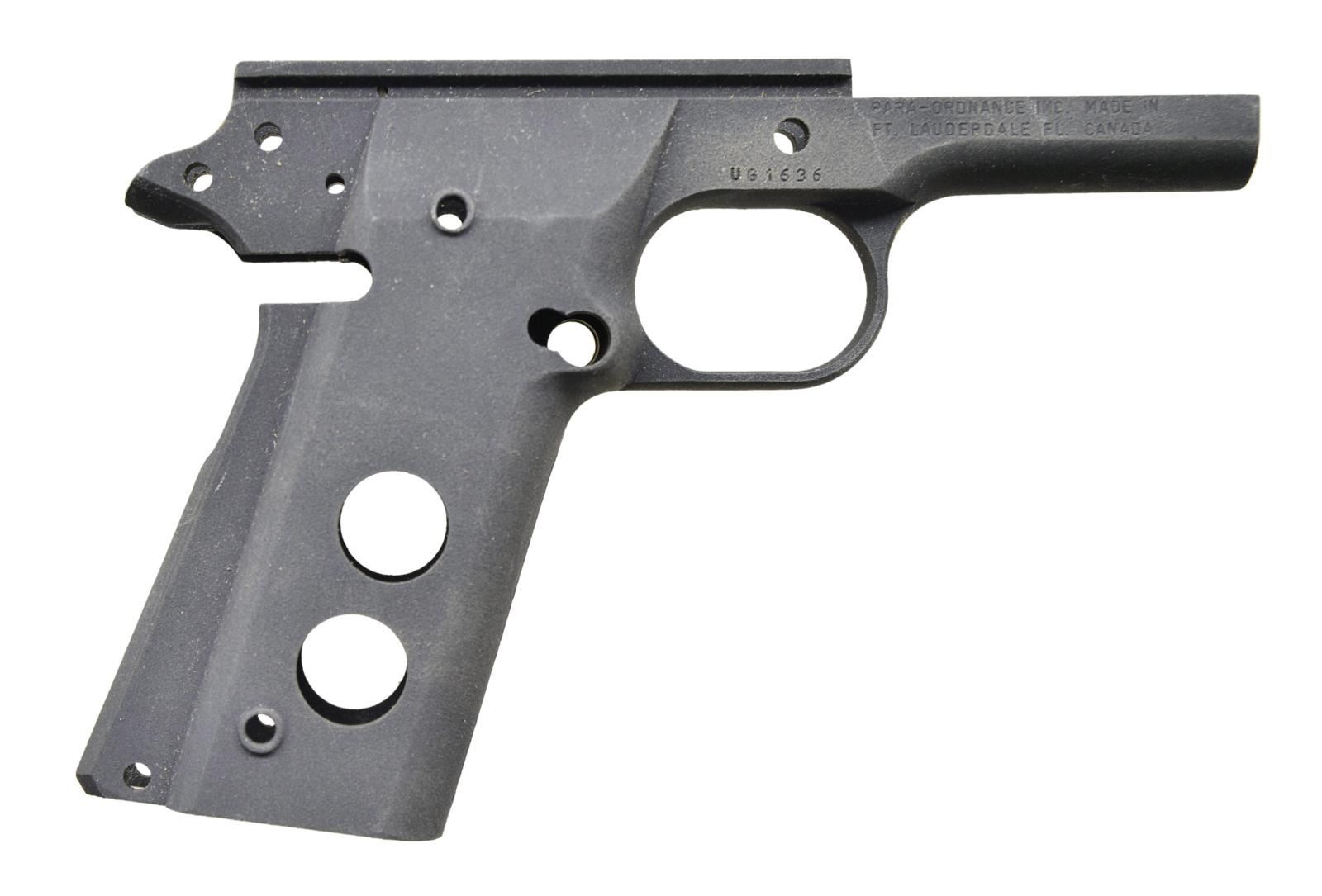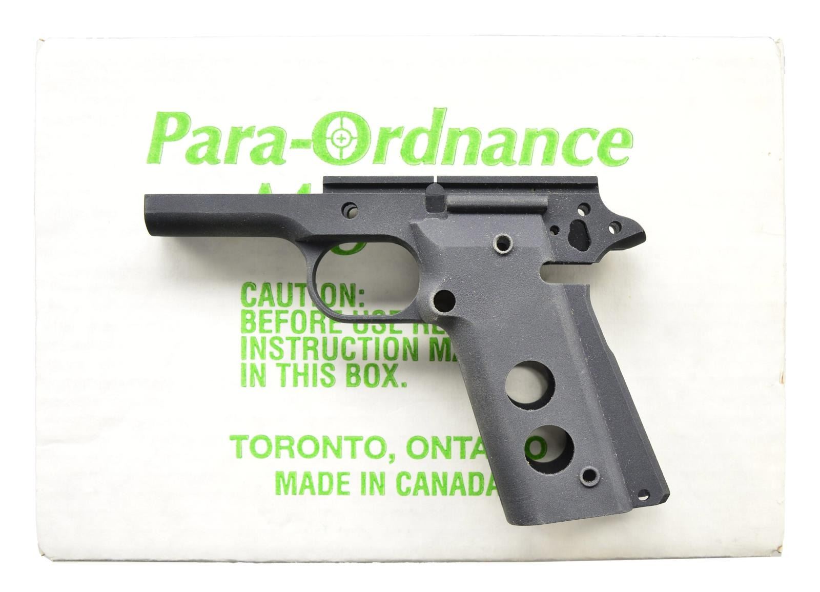 RECEIVER. Cal. 45 ACP. S# UG1636. Bbl. N/A. Para-Ordnance lightweight alloy frame to customize your Colt 1911 to utilize the 14 rd. staggered magazines. Matte black finish. MAGS: 1 factory 14 rd. UNATTACHED ACCESSORIES: factory box, grips, recoil spring, trigger, barrel bushing & paperwork. CONDITION: all aspects indicate it has never been completed. As new. (22-3417/JZ). MODERN. $200-300.