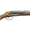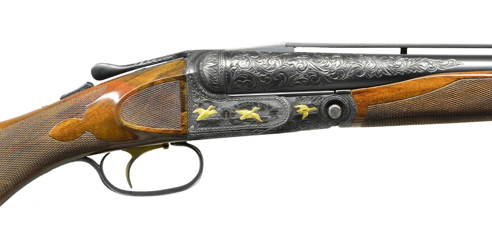 WITH GOLD INLAY. Cal. 12 Ga., 2 3/4". S# 121574. The 30" barrels are fitted with unmarked raised ventilated rib. Breech ends are deeply engraved with heavy scrolling acanthus for 6". There is 1 1/2" of matching engraving at muzzles. Barrel flats are stamped with S# & Remington repair code KZZ3 (May 1960). Side of lump is marked "A1S GRADE 12 GA." "FOR 2 3/4" SHELLS", bottom of lump is marked with frame size "1 1/2". Splinter is of reinforced type. Blued Parker action features non-automatic safety and gold plated Miller single selective trigger. Watertable has patent markings and has been remarked for grade. This guns S# is not listed in the ledger. Action is engraved with deep scroll matching barrels within geometric borders which surrounds game and dog scenes; major subjects in relief gold inlay. Left side depicts a pointer in open meadow with three flushing grouse, right side has a scene of three ducks flying over a marsh. Trigger plate depicts two flushing pheasant, and another duck is on trigger guard bow. Fences are relief engraved in foliate motif. Consignor states this is the work of Pachmayr, however there is no evidence of this on the gun. What appear to be engraver initials "FEW" are at bottom rear of dog scene. Capped pistol grip Monte Carlo buttstock of stump figured American walnut measures 14 1/8" over basketweave solid brown Pachmayr pad. Side panels are checkered and grip checkering is of semi-fancy pattern. Matching beaver tail ejector forend is braced in Model 21 manner. Patent date is on engraved Parker latch. MEASUREMENTS: BBLS: Bore Diameter: L .725. R .726. RESTRICTION L .030 (full). R .011 (mod). Wall thickness L .036 R .028. STOCK: DAH: 2 1/4". DA Rear of Monte Carlo: 1 13/16". DAC: 1 1/2"+. CAST: approx. 5/8" off. LOP: 14 1/8". WEIGHT: 8 lb. 3 oz. CONDITION: fine as custom finished, barrels and action show some light silvering to their blue. Stocks retain nearly all their original oil finish, with only a few minor handling marks. Bores are bright and shiny. Mechanically good. (22-5800/MGM) MODERN. $6,000-10,000.