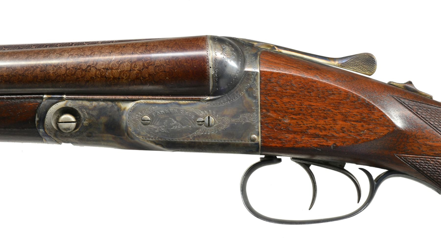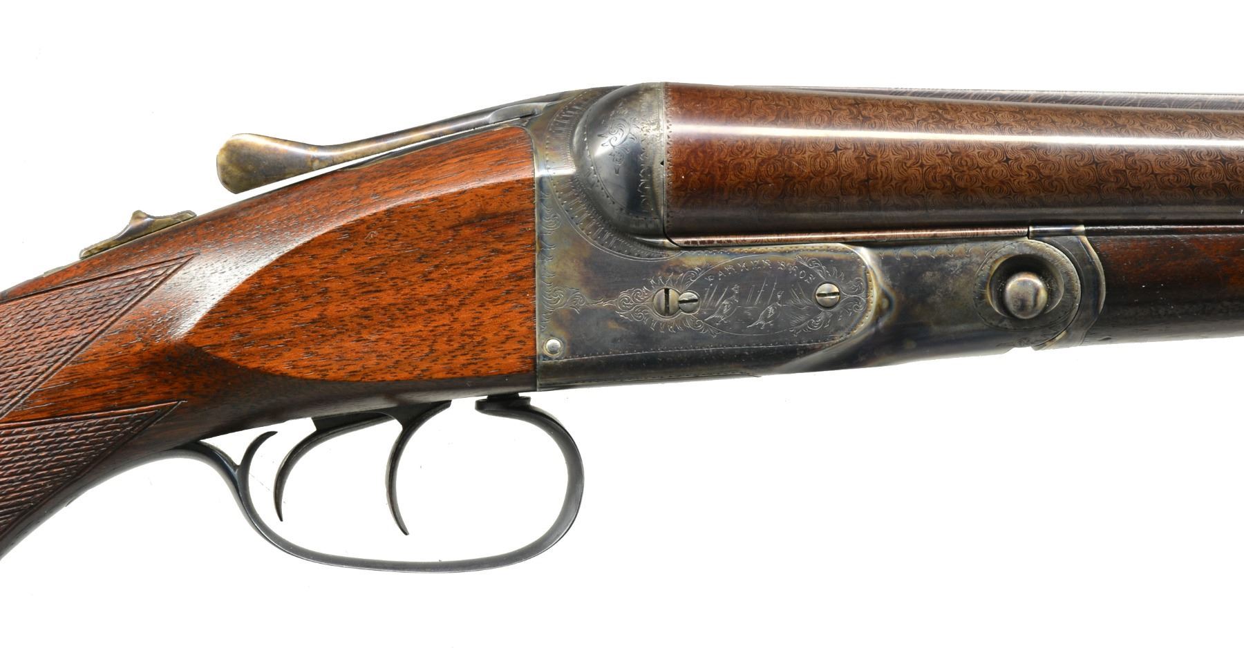 Cal. 12 Ga., 2 5/8". S# 81487. Bbls. 30" of Damascus Steel. Fixed Mod. & Full chokes. Lengthened forcing cones. No. 2 frame boxlock action w/ case colored finish. "G" Grade engraving features vignettes of fowl on sides of action & floorplate surrounded by scroll highlights & fancy borders. Dbl. triggers. Extractors. Steel tipped splinter forearm & hard rubber capped pistol grip stock w/ hand checkering. LOP: 14 1/4" over dog's head buttplate. DAC: 1 7/8". DAH: 3 1/8". Stock has a slight cast off. Weight: 7 lbs., 15 oz. Mfg. 1895. CONDITION: beautifully restored shotgun. Bbls. retain 98% finely rebrowned finish. Action retains 98% restored case colors & trigger guard blue. Stocks have very good refinish showing a few scattered marks. Checkering is nicely recut. Bores are polished bright. (01-17423/DS). ANTIQUE. $1,500-2,000.