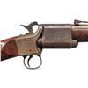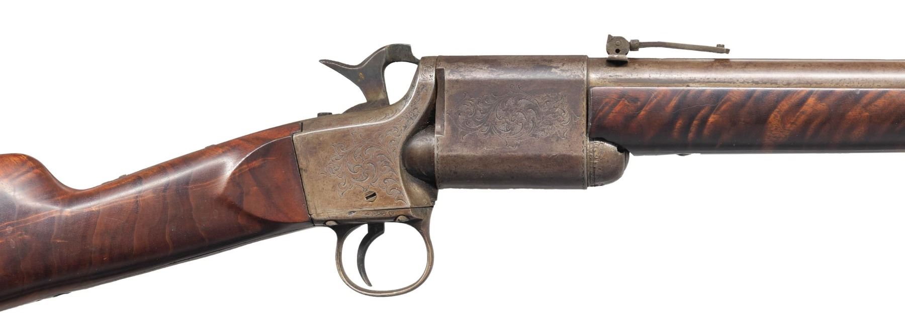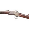 Cal. 44 Henry RF. The No. 2 marked on lower tang is evidently the Serial number. Bbl. 29 3/8" round is marked "Parker Snow & Brooks Co." Charles Parker of Parker Shotgun fame first venture into gunmaker was with Gamaliel F. Snow and Brooks (first name unknown). Under the name of Parker Snow & Co., Meriden CT.,15,000 Model 1861 muskets were mfg. under contract for the U.S. Government in 1863-1864. Charles Parker's second venture into gun making was as co-founder of the Meridan Manufacturing Co. Meridan produced 5,000 Triplett & Scott repeating carbines for the State of Kentucky during the Civil War. This rare rifle is a single shot version of the Triplett & Scott action. This rifle features 50% coverage of vine type foliate scroll engraving with punch dot backgrounds. The left is marked the apparent customer name "F. L. SMITH". The apparent replacement stock and forend of fancy walnut utilizes the original engraved crescent steel buttplate and pewter forend cap. CONDITION: metal has a mottled brown appearance. The replacement stock and forearm shows light scratches and marks. Forearm is broken and repaired behind the front attachment screw. Rear sight staff shows slight bend. Lightly pitted bore retains intact rifling. (01-26844/DS). ANTIQUE. $1,500-2,500.