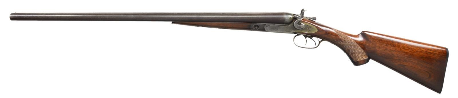 Cal. 12 Ga., 2 1/2". S# 66018. Bbls. 28" twist steel having matching number and open chokes of minimal restriction measuring more open than CYL. Mfg. 1891 with top lever, T shaped top barrel latch plus matching forend iron and trigger guard tang. Upper grade checkered pistol grip stock set having splinter forend with inletted metal tip plus hard rubber logo grip cap and checkered logo buttplate. CONDITION: very good overall appearance with original appearing finish of metal. Nice pattern to brown toned barrels with balance having grey toned patina; case colors only visible on interior of forend plus very faint traces on table. Near excellent refinished stock set having recut checkering; trigger guard tang slightly proud of stock. Extra finish onto action sides and trigger guard. Barrels have some very faint dents plus cleaned slightly frosted appearance along with traces of firing residue; left best appearing. (01-220555/NW). ANTIQUE. $600-900.