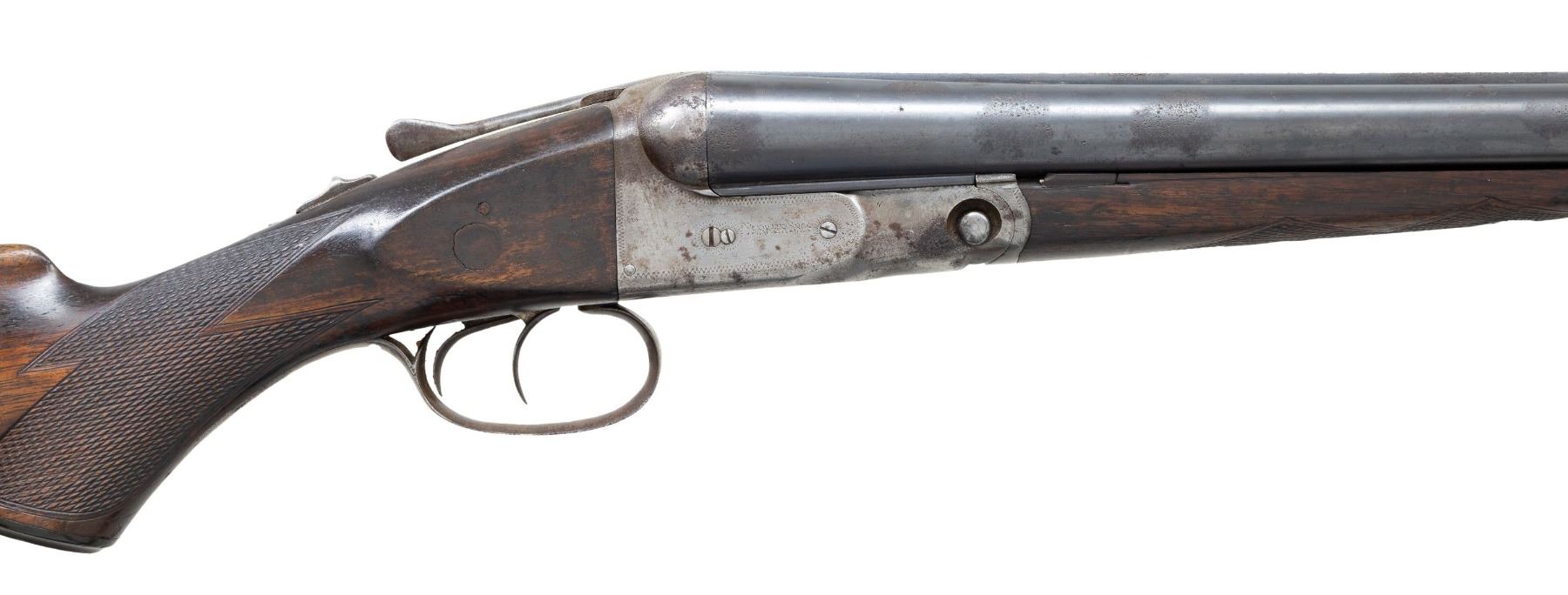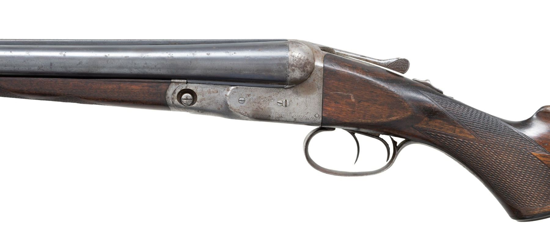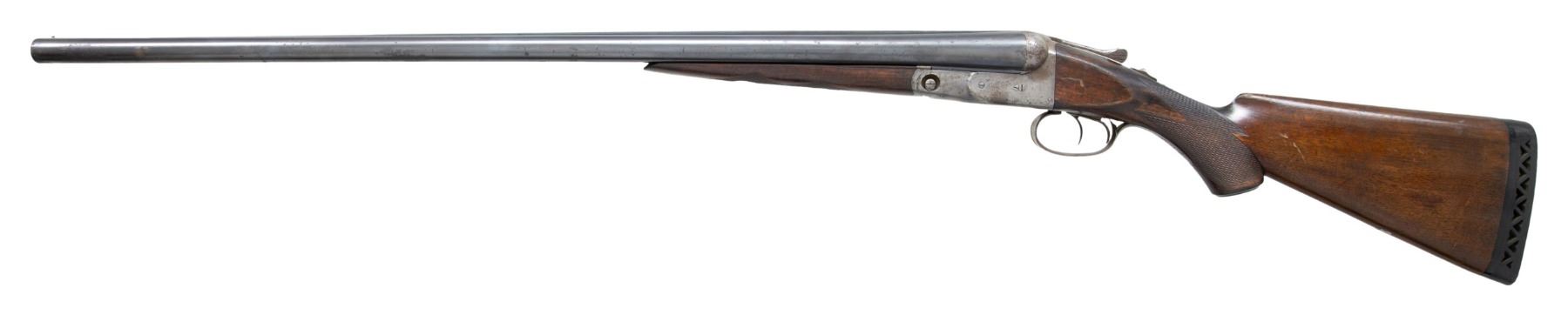 Cal. 12 ga. 2 5/8". S#. 100519. Bbls. 30" of Vulcan steel with fixed F&F chokes. Case colored No. 2 frame boxlock action has border line engraving that extends to the forend iron. Double triggers. Extractors. 2 position safety. Splinter forend & hard rubber capped pistol grip stock of checkered walnut with silver shield in the toe line. LOP: altered to 14 3/8" over an aftermarket leather faced black ventilated pad. Mfg. 1901. Weight 7 lbs., 12.6 oz. CONDITION: bbls have 60% blue with scattered spots of moderate to deep pitting. Action has faded to gray shows spots of pitting. The stock shows light wear & marks with plug type repairs at the head. The forend shows light wear with chips along the right bbl. channel. Properly functioning action shows wear with the top lever sitting slightly left of center. Bores are generally bright showing spots of light pitting. (25-4533/DS). CURIO. $500-800.