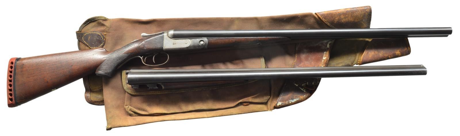 Cal. 16ga. S# 147062. Bbl. 26" (IC & Mod.); matching numbered bbl. & splinter forend each having "1" indicating primary assembly. Mfg. 1908 w/ extractor plus capped checkered pistol grip buttstock having initial shield & added Red Head ventilated pad. Matching numbered trigger guard w/ double triggers. 14-1/4" LOP, 1-1/2" DAC, & 2-1/4" DAH plus 6 lbs. 7.5 oz. UNATTACHED ACCESSORIES: spare matching numbered 28" bbl. assembly w/ forend also numbered "2" (secondary). Matching appearance to main bbl. assembly w/ near excellent bright bores. Fair, vintage canvas & leather carry pouch for set. CONDITION: good general appearance w/ peppery oxidation & beginning patina. Buttstock squared w/ widows peak remaining; repaired chip at toe. Hand worn stock set w/ occasional light marks. Near excellent bright bores. Opening lever not at all near center yet. (20-4250/NW). CURIO. $900-1400.