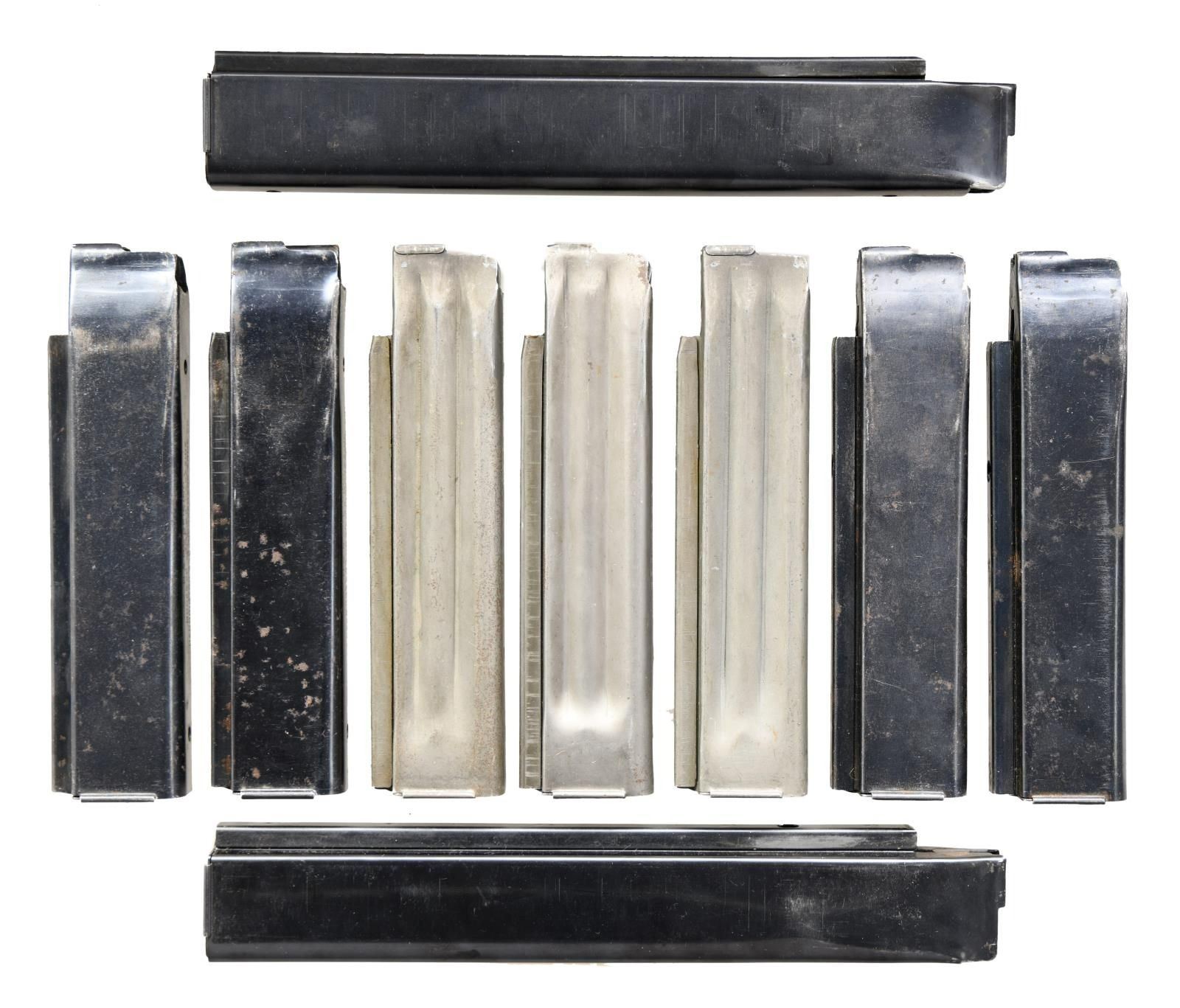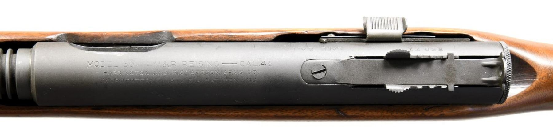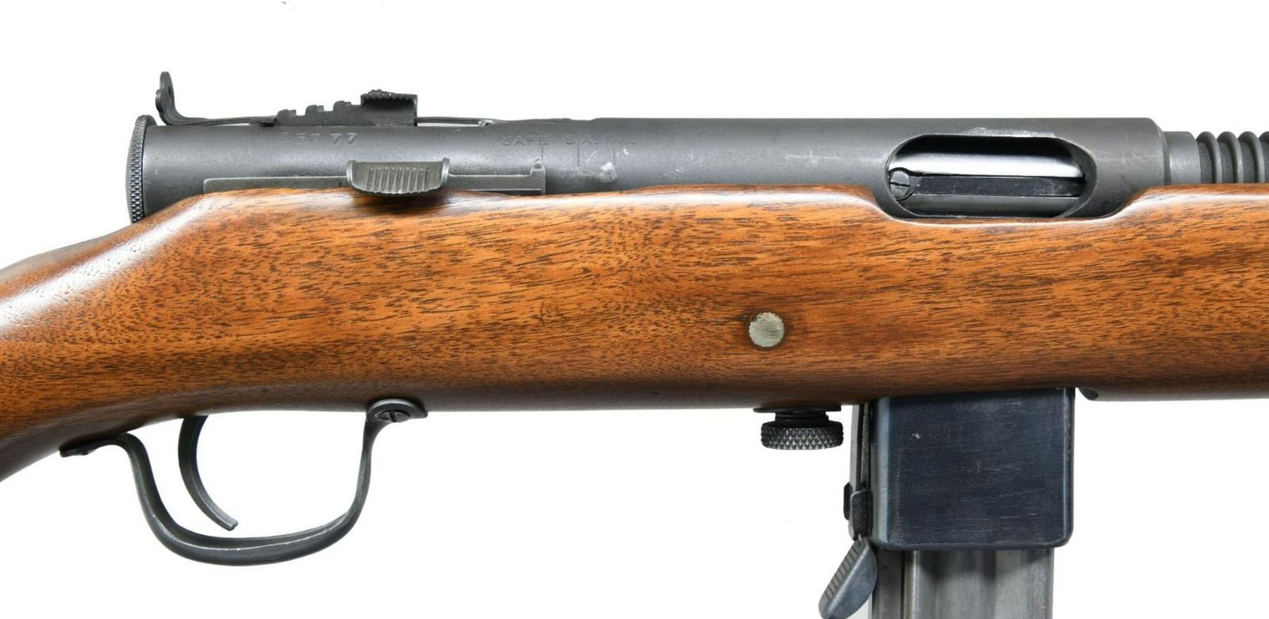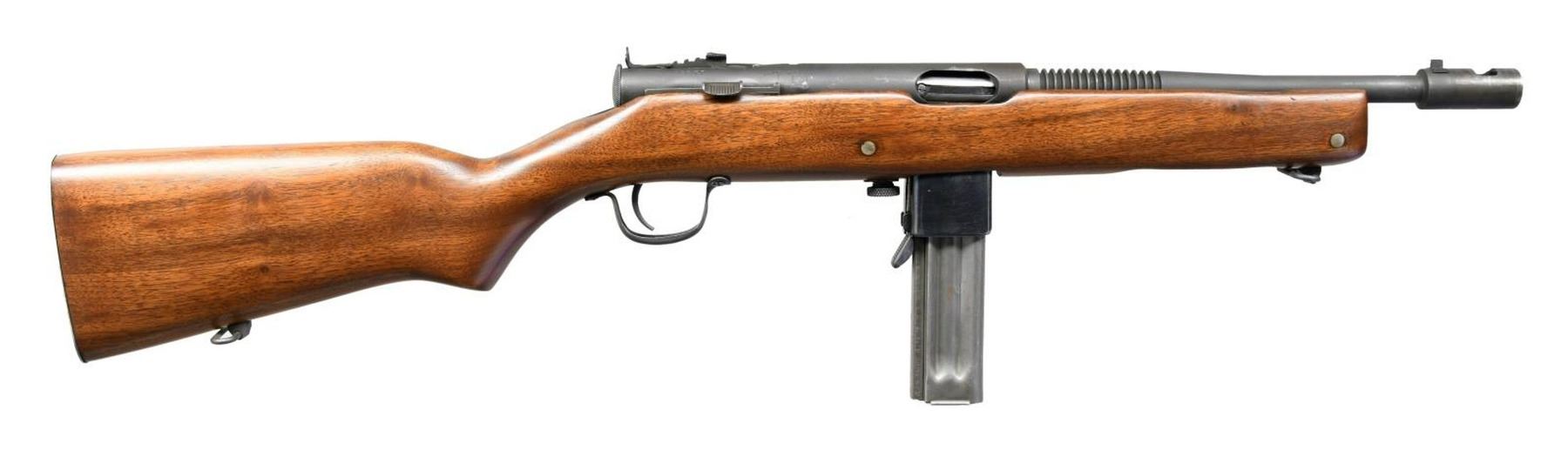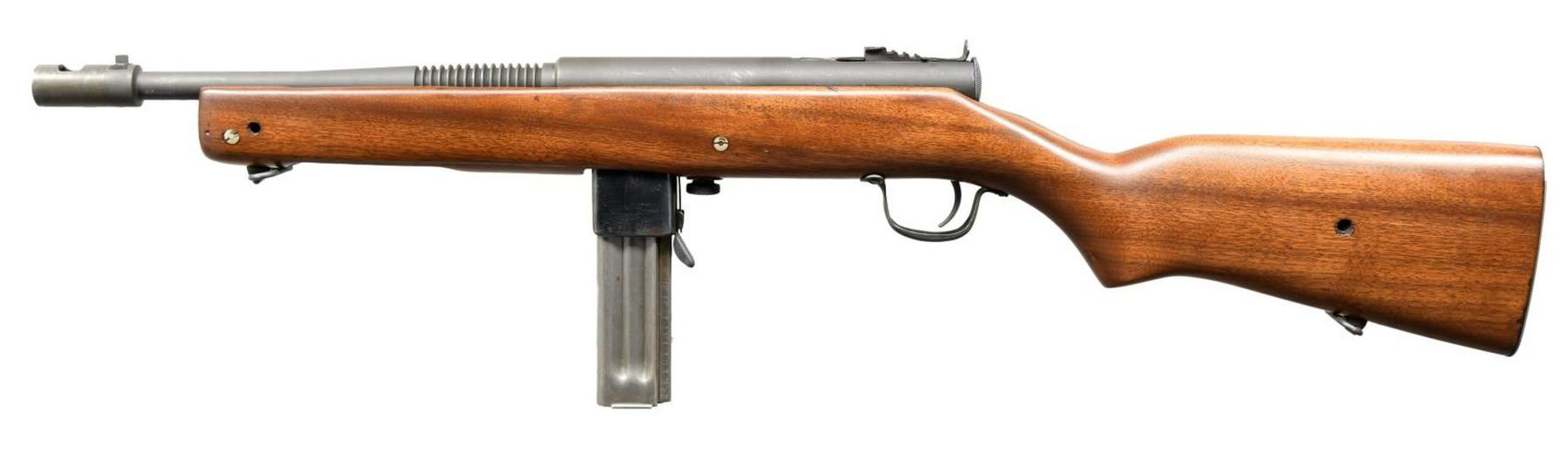 50 REISING SMG. Cal. 45 ACP. S# S5077. Bbl. 12" over comp. Barrel w/ 14 fins. In a search for another compact SMG as things were heating up in Europe in 1939, Eugene Reising went to work designing what we would eventually know as the Reising Model 50. He received a patent on his compact, closed bolt carbine, chambered in .45ACP in June of 1940, and entered into a manufacturing contract with Harrington & Richardson to facilitate production. It didn’t have many competitors, as the only similar firearm was the Thompson SMG, but the Reising Model 50 was extremely accurate since it fired from a closed bolt. After submission for testing with the US Army, it was not immediately accepted since its same closed bolt mechanism that provided superior accuracy had a tendency to malfunction when not cleaned and maintained regularly. Since the Thompson SMG faced a shortage, the United States Marine Corps adopted the Reising Model 50 with a parkerized finish, cooling fins, a muzzle device to assist with recoil and with select-fire capability. They then requested a modified version for the “Para Marines” that utilized a folding wire stock in a pistol grip design, and without the muzzle device. It was known as the Reising Model 55 and shared by the Tank crews. This example, the Model 50 is a select fire, closed bolt sub machine gun. It has a 20rd mag-well with 14 cooling fins and a single slot muzzle device. Exposed metal surfaces are finished in a matte parkerizing. Full length wooden stock. Graduated elevation adjustable rear peep sight & drift windage adjustable front post sight incorporated into the muzzle device. Receiver is stamped on top “MODEL 50 – H.&R. REISING – CAL .45 / HARRINGTON AND RICHARDSON ARMS CO. / WORCESTER, MASS. U.S.A. PAT PENDING”. Sling swivels, front & rear. MAGS: 10 total factory mags including 4 blued 20rd., 4 parkerized 12rd. & 2 blued 30rd. CONDITION: Parkerized finish complete & consistent w/ normal thinning in areas of mechanical intervention such as between safety / selector & receiver. Shoulder stock is in extremely nice condition w/ very few impressions or imperfections aside from 2 holes of unknown origin in the left side, above each sling swivel. Bore is bright w/ strong rifling. Fire control mechanism appears to function properly when cycled by hand. NATIONAL FIREARMS ACT MG REQUIRING BATF TRANSFER BEFORE TAKING POSSESSION. FULLY TRANSFERABLE. (03-1671/JZ). CLASS III CURIO. $7,000-9,000.