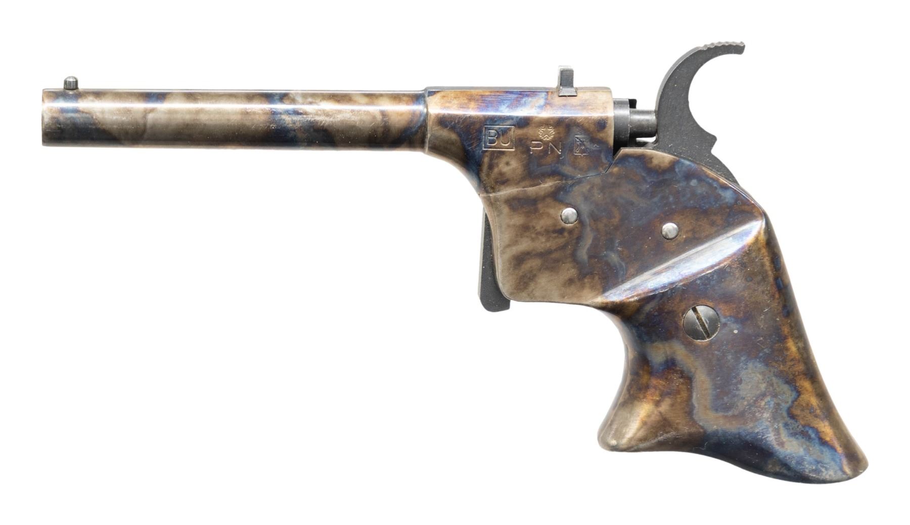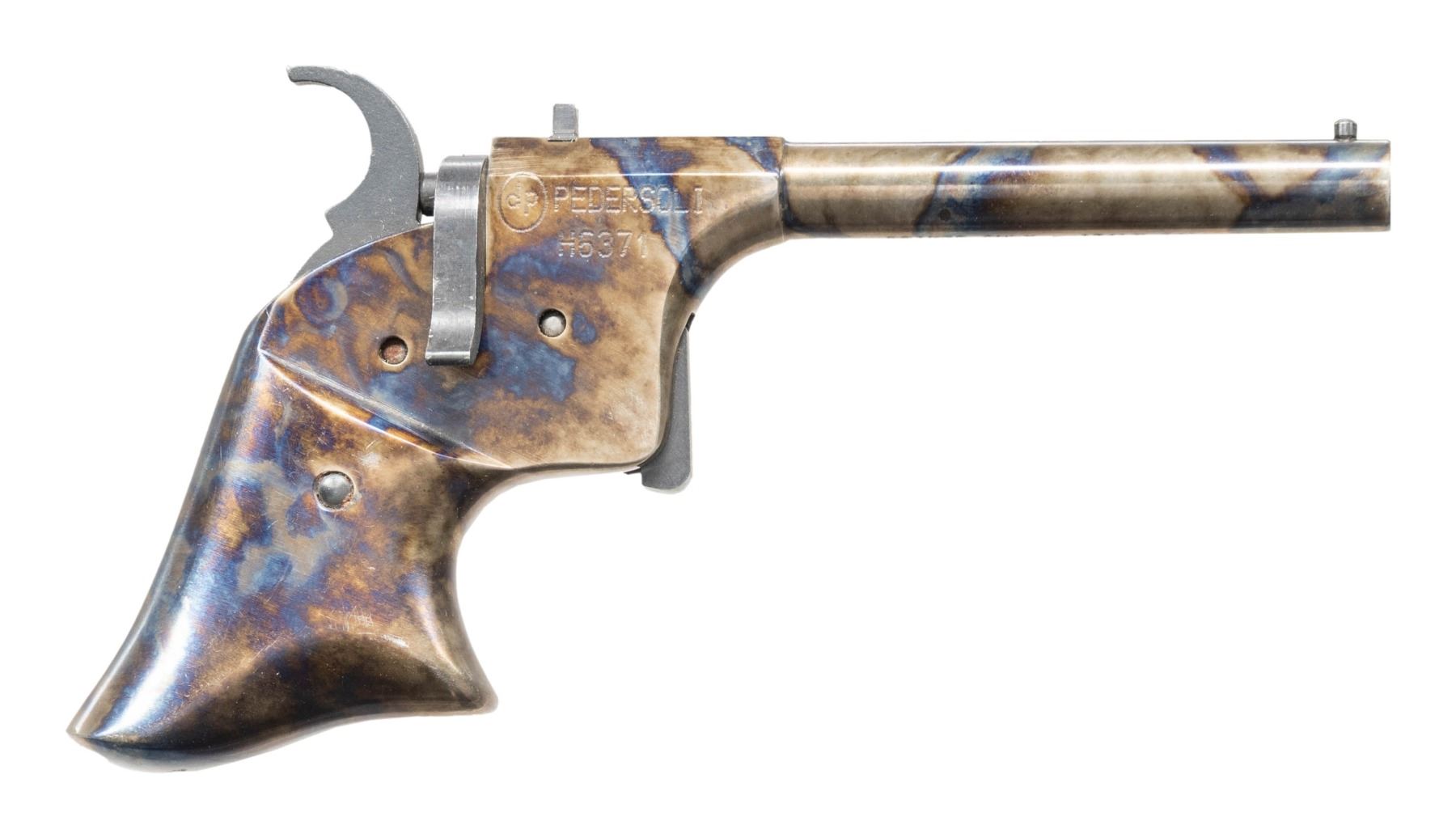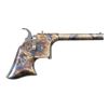 Cal. 17. S# H6371. Bbl. 2". Italian replica of the rare Remington Derringer pistol. Pistol fires a .17 cal lead ball with #11 cap & no black powder. Case colored finish. CONDITION: metal shows some handling marks & light scratches. Action functions properly when hand cycled. Bore is dirty but has strong rifling. (01-28299/MJC). ANTIQUE. $100-200.