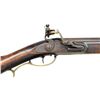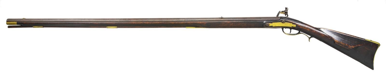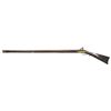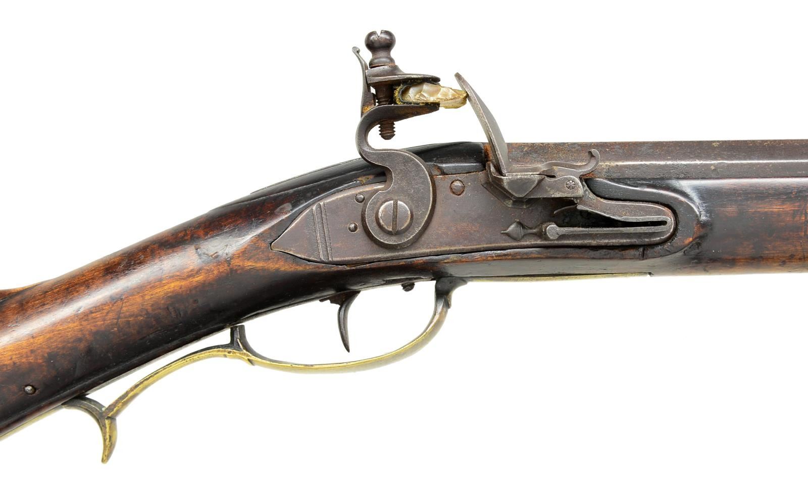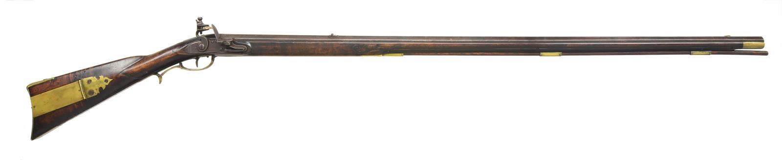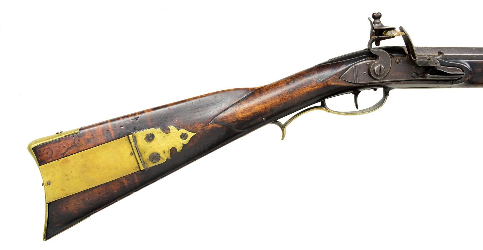 Cal. 50 smooth bore. NSN. 41 1/8" Slightly tapered oct. bbl. is unmarked & is fitted w/ U notch rear & German silver bead front sights. Hand made lock w/ slightly chamfered plate having file decorated tail is made w/ serpentine cock, inset faceted pan, bridled frizzen & feather spring w/ file decorated steeple type foliate finial. Bbl. & lock appear to be in original flint configuration. Full length stock of lightly fiddle figured hard maple extends to muzzle w/ brass cap & is pinned to bbl. Mts. are brass w/ simple patchbox w/ release in buttplate & has spear type finial. Buttplate has 2" brass return. Chamfered trigger guard has grip spur. Long squared sideplate is chamfered. Stock has incised carving behind & below sm. fluted cheekpiece. Grip area is slightly recessed leaving raised fields at transition to butt & around bbl. tang. Ramrod channel is lightly beaded terminating in more incise scroll at rear above oct. & beaded thimble. Old hickory ramrod mounts through 2 matching pipes. CONDITION: good. Bbl. & lock retaining brown patina w/ scattered pitting. Stock w/ what appears to be original finish w/ many minor marks. Has attractive wear at grip & forend. Brass toned to mustard brown. Rusted bore. Lock cocks but won't fire. (01-20142/MGM). ANTIQUE. $3,000-4,000.