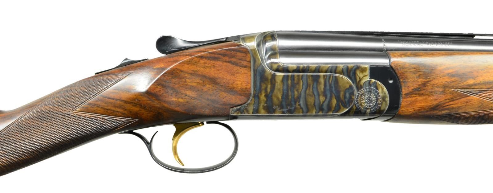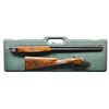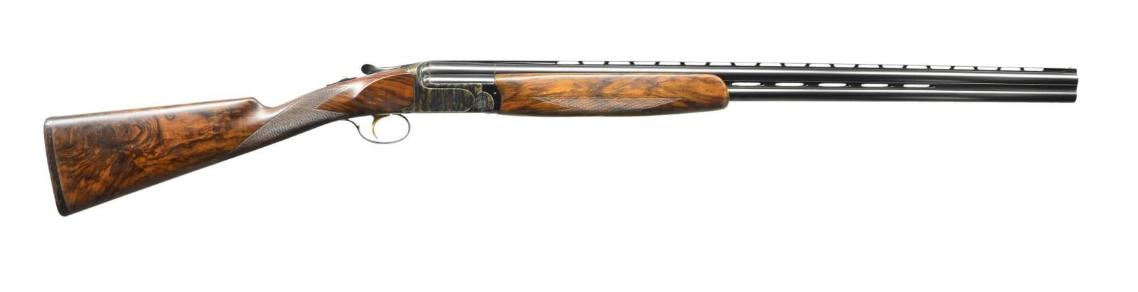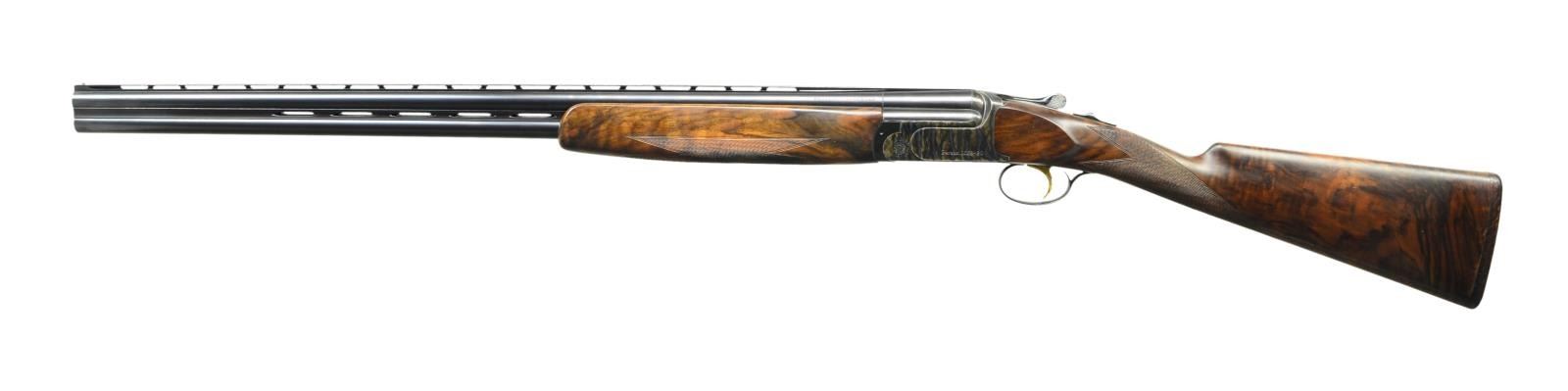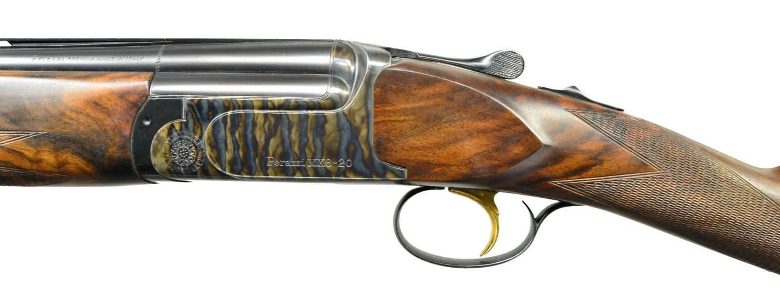 Cal. 20 Ga., 2 3/4". S# 90270. The 28 3/8" mono-bloc barrels with choke tubes and ventilated side ribs are marked with Perazzi information either side of flat matted ventilated top rib. Bottom of mono-bloc is stamped with 1994 Italian nitro proofs. Case hardened, small size, low profile O/U action is fitted with removable firing group with V springs and gold plated trigger. Left side of action is marked "Perazzi MX8-20". Straight grip buttstock of intricately marbled and lightly figured dark European walnut measures 14 5/8" over thin brown leather covered pad. Point pattern checkering is on slightly swan necked grip. Matching slim field forend has Deeley type release. MEASUREMENTS: STOCK: DAH: 2 5/16". DAC: 1 1/2". CAST: neutral. LOP: 14 5/8". WEIGHT: 6 lb. 13 oz. UNATTACHED ACCESSORIES: gun is housed in green ABS "Perazzi" embossed case lined in green checkered cloth marked "Perazzi" in lid. Case contains steel cleaning rod kit, stock removal tool, 5 choke tubes (2 in gun for a total of 7), choke wrench and bags for barrels and action. CONDITION: fine. Retaining nearly all original finishes on both wood and metal with a few minor handling and assembley marks. Bright shiny bores. Mechanically fine, some pitting is on knuckle that shows light wear but no galling. Case is good, cloth in lid has detached, foam backing is crumbling. (22-5608/MGM). MODERN. $5,000-8,000.