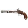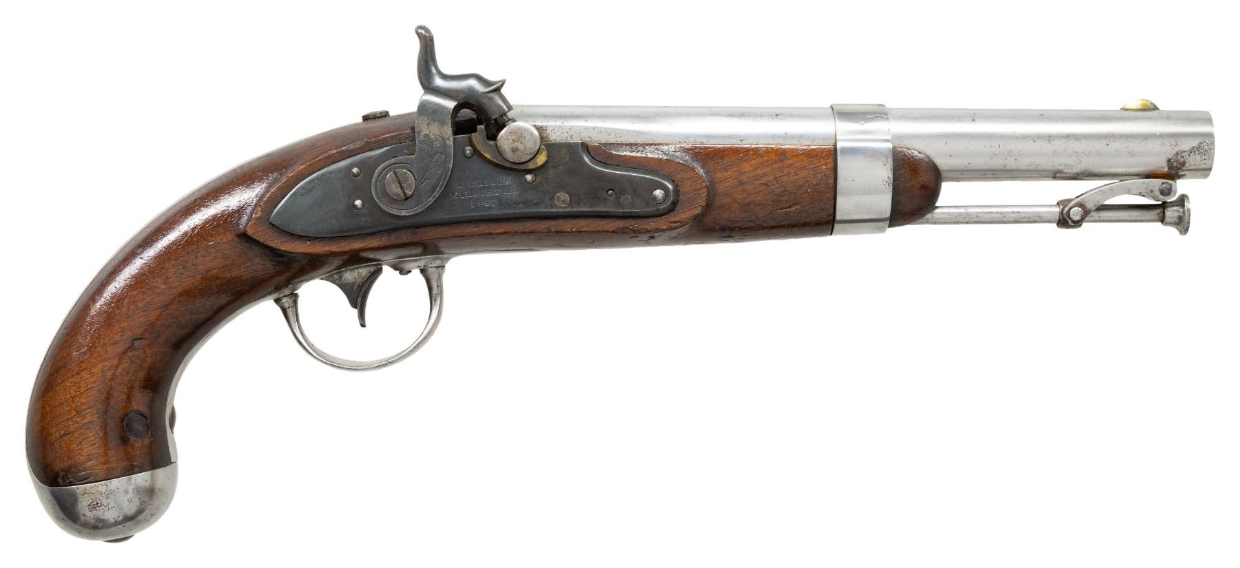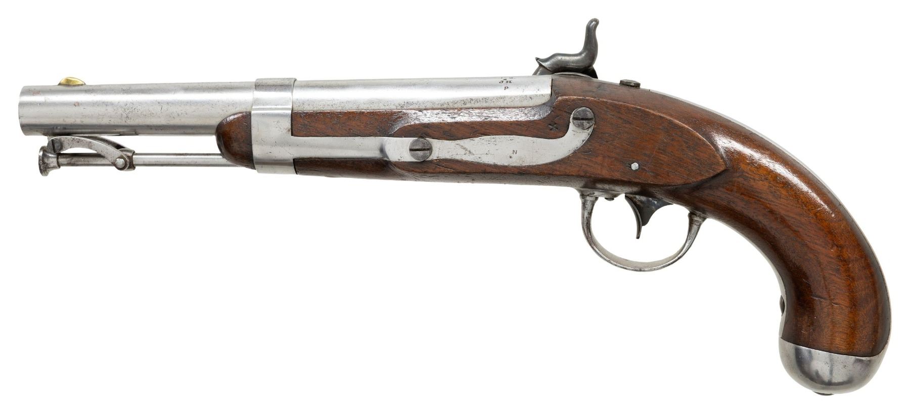 M1836 PISTOL. Cal. 54. NSN. Smoothbore 8.5" barrel w/ brass blade front sight, bolster percussion conversion & swivel ramrod. A Water lock converted to percussion having replacement hammer, & remnants of brass pan. Walnut stock w/ iron furniture & "X" stamp above sideplate. CONDITION: barrel & other iron components have cleaned bright appearance with prior pitting & scratches; sm. crack in barrel band. Lock has reblued finish. Wood has extra finish applied showing numerous marks. Bore show light pitting. PROVENANCE: Estate Collection of Nicholas Apergis. (01-27425/MD). ANTIQUE. $700-1,000.