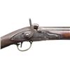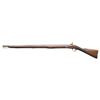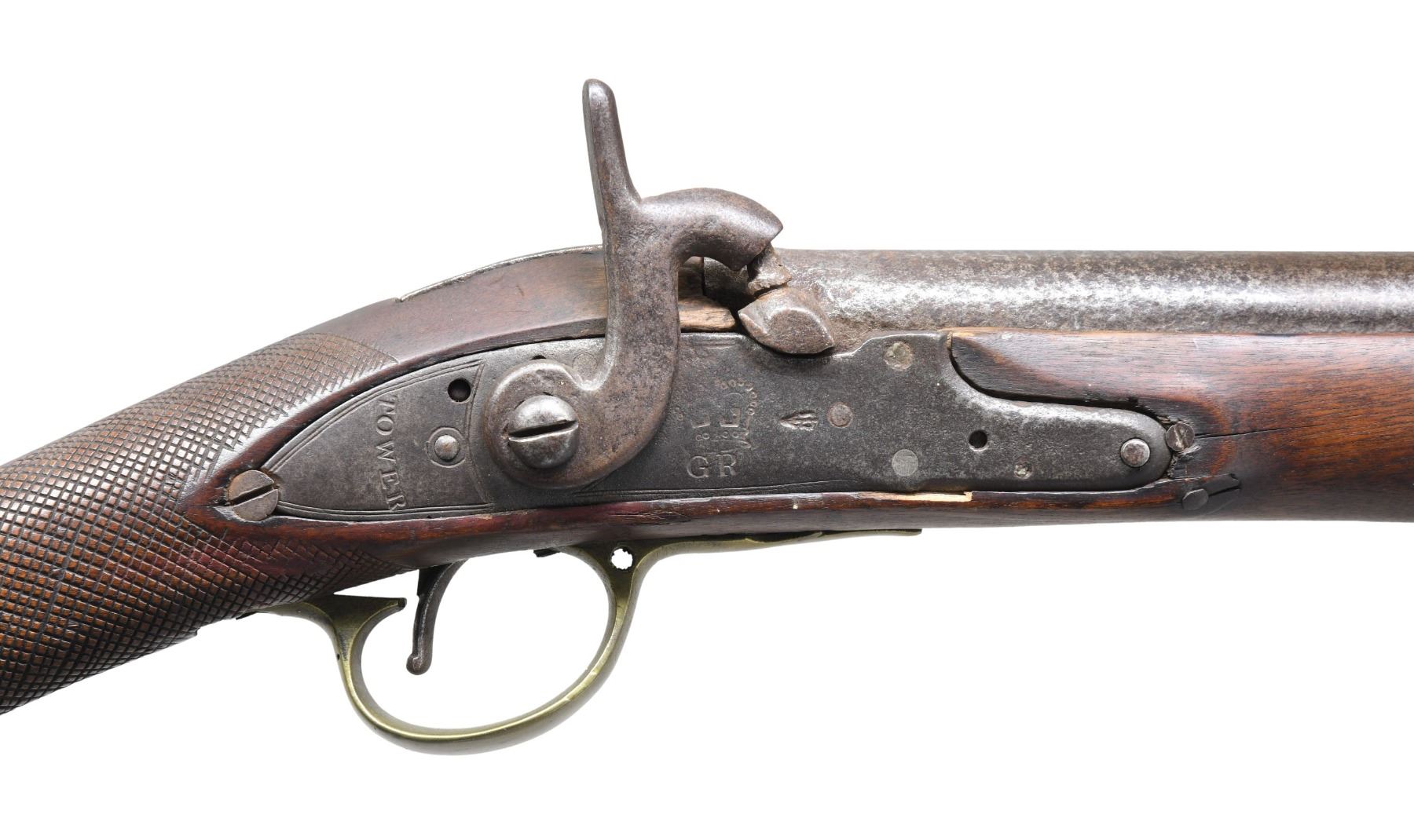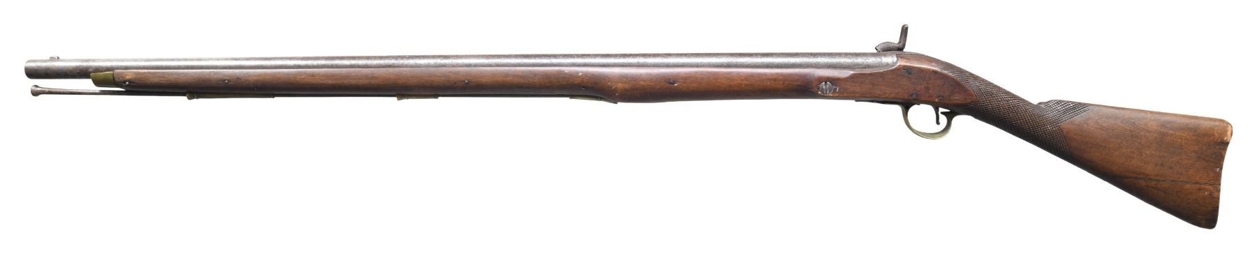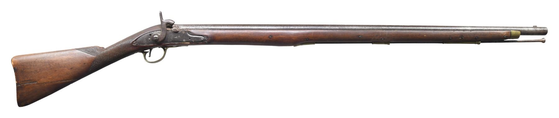 Cal. 70. NSN. Bbl. 38". Third Model Brown Bess converted to percussion & restocked. Lock has British crown "GR" & "TOWER" markings. One of the lock screws is missing. Left side of bbl. has faint British proofs. Replacement hardwood stock with checkered wrist. Stock does not appear to have been cut for buttplate. Iron ramrod secured by brass thimble & two pipes. Brass trigger guard that has been cut for stock, is missing a chip behind trigger & is coming loose. CONDITION: stock shows a large spliced toe repair, a few scattered nail repairs, some chips, scattered handling wear & marks. Brass parts are a dull yellow color with some tarnishing & light dings. Balance of metal is a dull gray patina with overall old oxidation & scattered pitting. Action pushes off when hand cycled & will need attention to function properly. Oxidized smoothbore. (01-26998/MJC). ANTIQUE. $500-700.