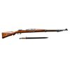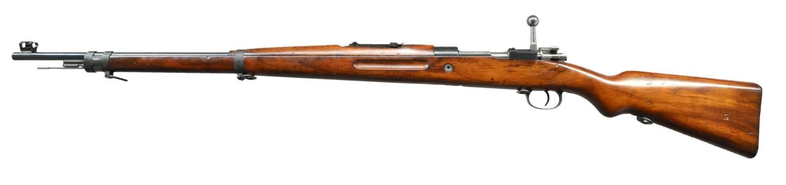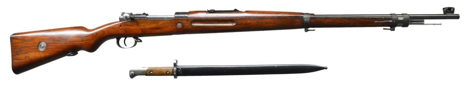 Cal. 8mm Mauser. S #C04987. All visible Farsi S #'s matching. Bbl 29" w/ import marking. Top of receiver marked w/ Persian lion crest. Left side of receiver marked w/ Farsi S # and importer added S #. Left side rail marked w/ Farsi markings. Right side of receiver marked w/ Persian proofs. Tangent rear sight w/ Farsi graduations. Inverted V front sight w/ protective ears. Cleaning rod present. All milled furniture. Walnut stock set. Walnut stock has matching Farsi S # on right side of butt & an English rack number "51" on left side of butt. UNATTACHED ACCESSORIES: Persian sword bayonet & scabbard. Back of pommel marked w/ Persian crest & a number that does not match rifle. Metal parts of bayonet remains mostly bright w/ a couple small spots of light pitting, scattered fine oxidation specks and some dried grease. Scabbard retains nearly all blued finish w/ some minor silvering & handling wear. CONDITION: walnut stock set retains much original finish w/ scattered dings & handling marks. Metal retains 75% original blue w/ scattered fading & some oxidation on bands. Good bore w/ some light pitting but strong rifling. (22-2540/MJC). CURIO. $500-700.