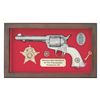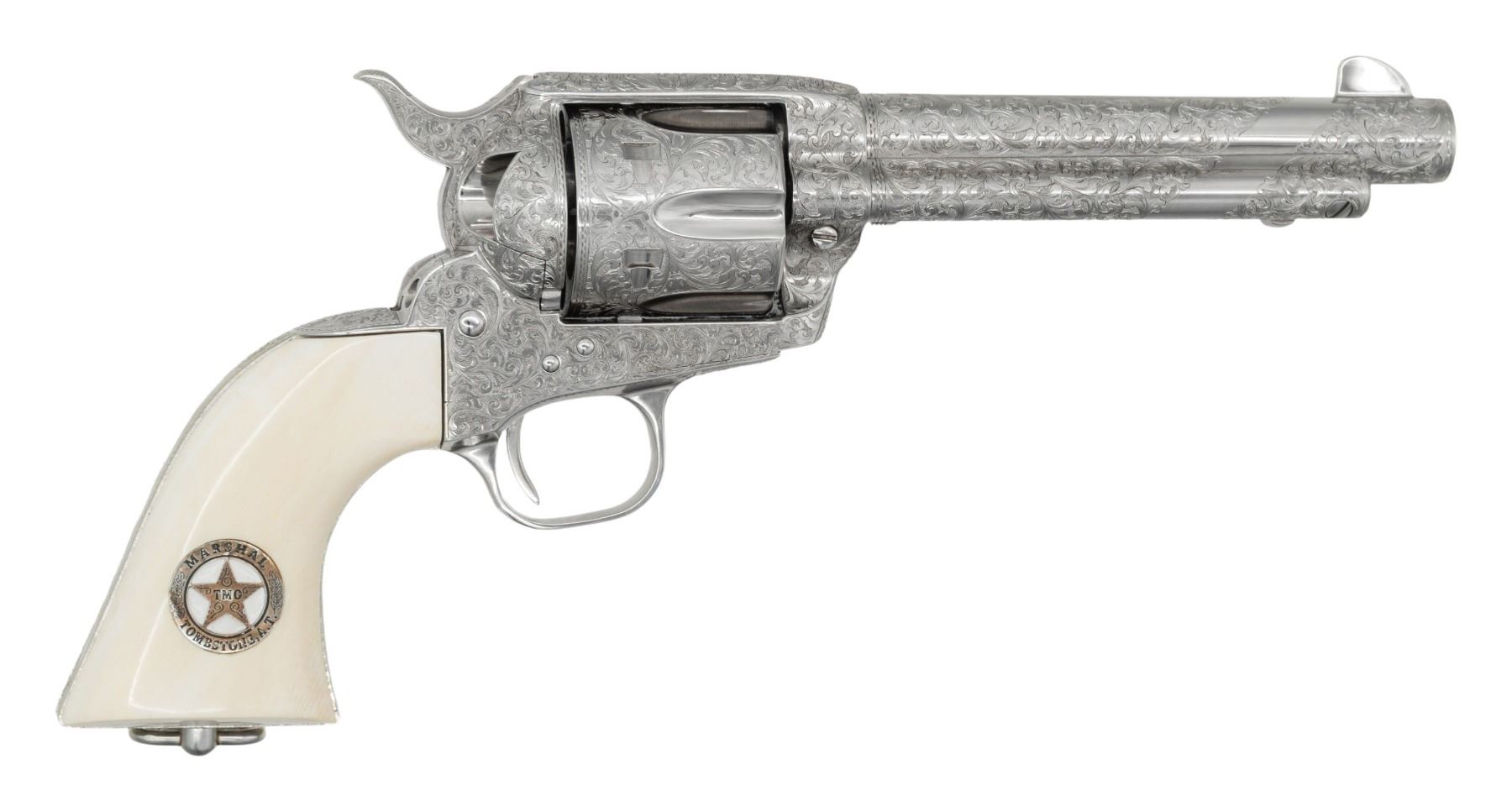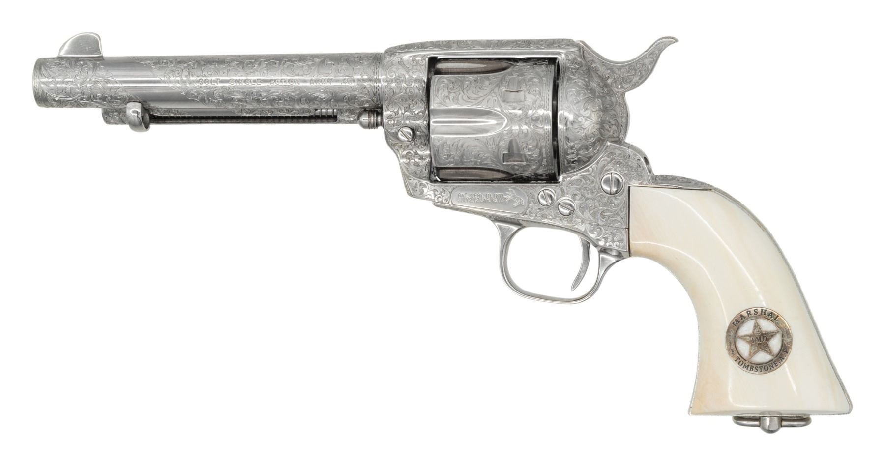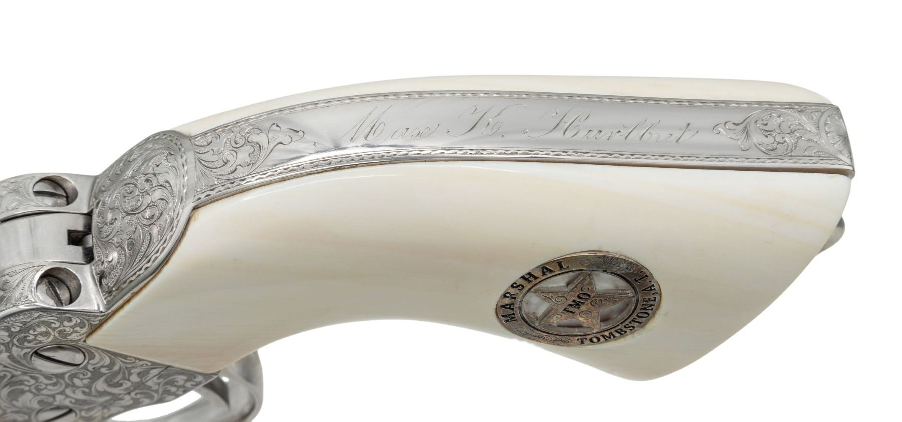 ENGRAVED CUSTOM 3RD GEN SAA REVOLVER TO TOMBSTONE CITY MARSHAL MAX K. HURLBUT. Cal. 45 Colt. S# TMO-1. Bbl. 5 1/2" with blade front sight. This fantastic specimen was custom ordered by "The Vagabond Policeman", Max K. Hurlbut and shipped to the long out of business "Hole-in-the Wall Gun Shop" on the anniversary of the "Gunfight at the OK Corral". Hurlbut was a former City Marshal in Tombstone, AZ, His name is engraved on the backstrap "Max K. Hurlbut" with his position engraved as the barrel address "CITY MARSHAL, TOMBSTONE, AT". Smooth white grip is custom factory inlaid with sterling silver Tombstone, AZ Marshal badge. Lanyard ring is factory installed in butt. Revolver bears one-of-kind commemorative S# "TMO-1" (Tombstone Marshal's Office-1). Per included letter from Hurlbut to consignor, this revolver was carried by him on ceremonial occasions. Hurlbut was a long time globe trotting veteran of multiple law enforcement agencies including the LAPD, Kodiak Police Dept, Whittier Alaska Marshal's office, Tombstone Arizona Marshal's Office as well as his time in the Aleutian Islands. His autobiography "THE VAGABOND POLICEMAN" details many of his exploits. This full nickel plated revolver features extraordinarily fine, tightly wound full coverage Master-Class Factory "D" coverage scroll engraving over a meticulously laid fine punch dot background with straight line & wavy borders. Grip frame is signed by Colt Master Engraver, George Spring. Original grip frame & trigger guard frame have original S#s X'd out with matching "TMO-1" applied to each. UNATTACHED ACCESSORIES: correspondence from Hurlbut listing this revolver's history & use as well as a hand written note to consignor confirming included Marshal's badge was one used by Hurlbut. Pictures of Hurlbut from his time in serving in Tombstone. Colt factory letter stating the following: "Serial Number: TMO-1 / Caliber: .45 Colt / Barrel Length: 5 1/2". / Finish: Nickel / Type of Stocks: Ivory with special medallions that were provided by the consignor / ____ Yes, Class "D" custom scroll engraving. In addition, the name "Max K. Hurlbut" in machine engraved on the backstrap and "City Marshal, Tombstone, AT" is located on top of the barrel / Engraver's Name: Colt Master Engraver, George Spring / Special Features: Furnished with a unique serial number & lanyard ring. / Shipped To: Hole In The Wall G Shop / Address: 207 E. Fremont Street Tombstone, Arizona / Date of Shipment: October 26, 1999 / Number of Same Type Guns in Shipment: 1". Glass topped, red velvet shadowline display case with original Tombstone Marshal badge, Colt Custom Shop medallion & miniature Marshal badge. CONDITION: overall, revolver is near excellent, retaining 98% original nickel finish. There is one pin head sized spot of flaked nickel on muzzle as well as on left rear grips frame screw head. There are some powder stains on front of cyl. confirming the fact stated in Hurlbut's letter that he "fired this revolver 12 times (to be sure of it's function & accuracy)". PROVENANCE: From the Buckstix Collection.(25-6322/BH). CURIO. $10,000-15,000.