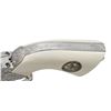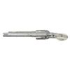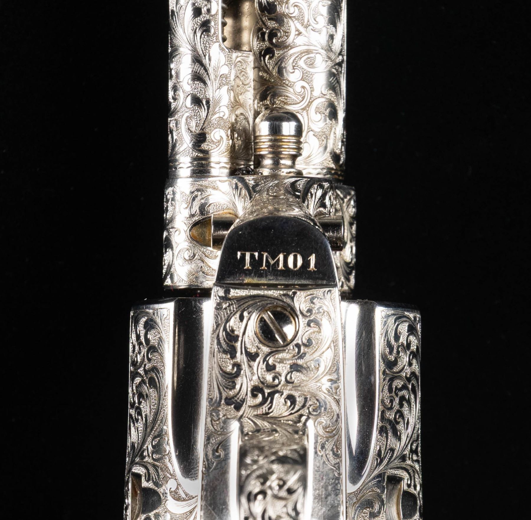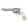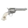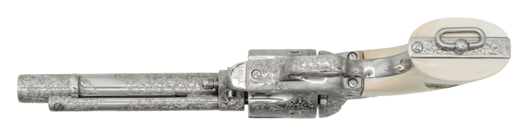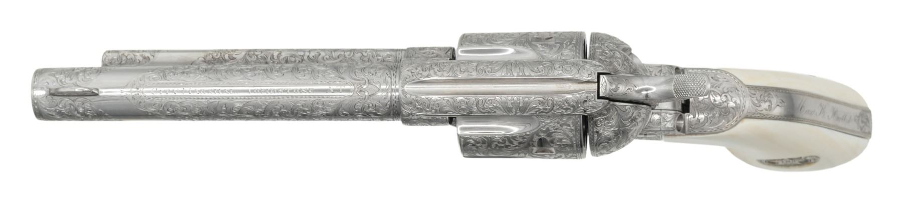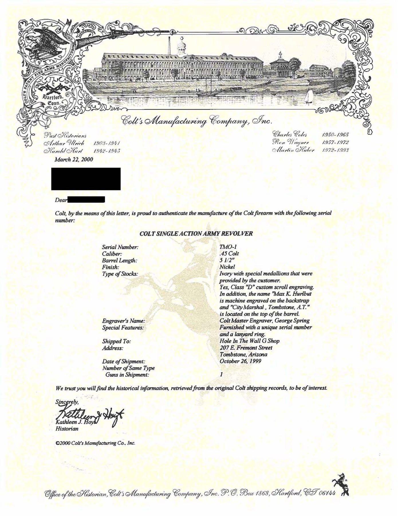 ENGRAVED CUSTOM 3RD GEN SAA REVOLVER TO TOMBSTONE CITY MARSHAL MAX K. HURLBUT. Cal. 45 Colt. S# TMO-1. Bbl. 5 1/2" with blade front sight. This fantastic specimen was custom ordered by "The Vagabond Policeman", Max K. Hurlbut and shipped to the long out of business "Hole-in-the Wall Gun Shop" on the anniversary of the "Gunfight at the OK Corral". Hurlbut was a former City Marshal in Tombstone, AZ, His name is engraved on the backstrap "Max K. Hurlbut" with his position engraved as the barrel address "CITY MARSHAL, TOMBSTONE, AT". Smooth white grip is custom factory inlaid with sterling silver Tombstone, AZ Marshal badge. Lanyard ring is factory installed in butt. Revolver bears one-of-kind commemorative S# "TMO-1" (Tombstone Marshal's Office-1). Per included letter from Hurlbut to consignor, this revolver was carried by him on ceremonial occasions. Hurlbut was a long time globe trotting veteran of multiple law enforcement agencies including the LAPD, Kodiak Police Dept, Whittier Alaska Marshal's office, Tombstone Arizona Marshal's Office as well as his time in the Aleutian Islands. His autobiography "THE VAGABOND POLICEMAN" details many of his exploits. This full nickel plated revolver features extraordinarily fine, tightly wound full coverage Master-Class Factory "D" coverage scroll engraving over a meticulously laid fine punch dot background with straight line & wavy borders. Grip frame is signed by Colt Master Engraver, George Spring. Original grip frame & trigger guard frame have original S#s X'd out with matching "TMO-1" applied to each. UNATTACHED ACCESSORIES: correspondence from Hurlbut listing this revolver's history & use as well as a hand written note to consignor confirming included Marshal's badge was one used by Hurlbut. Pictures of Hurlbut from his time in serving in Tombstone. Colt factory letter stating the following: "Serial Number: TMO-1 / Caliber: .45 Colt / Barrel Length: 5 1/2". / Finish: Nickel / Type of Stocks: Ivory with special medallions that were provided by the consignor / ____ Yes, Class "D" custom scroll engraving. In addition, the name "Max K. Hurlbut" in machine engraved on the backstrap and "City Marshal, Tombstone, AT" is located on top of the barrel / Engraver's Name: Colt Master Engraver, George Spring / Special Features: Furnished with a unique serial number & lanyard ring. / Shipped To: Hole In The Wall G Shop / Address: 207 E. Fremont Street Tombstone, Arizona / Date of Shipment: October 26, 1999 / Number of Same Type Guns in Shipment: 1". Glass topped, red velvet shadowline display case with original Tombstone Marshal badge, Colt Custom Shop medallion & miniature Marshal badge. CONDITION: overall, revolver is near excellent, retaining 98% original nickel finish. There is one pin head sized spot of flaked nickel on muzzle as well as on left rear grips frame screw head. There are some powder stains on front of cyl. confirming the fact stated in Hurlbut's letter that he "fired this revolver 12 times (to be sure of it's function & accuracy)". PROVENANCE: From the Buckstix Collection.(25-6322/BH). CURIO. $10,000-15,000.