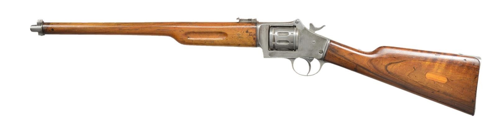 Cal. 8mm Pieper. S# 355*. Bbl. 19.8" with dovetailed inverted V sight on nose cap. Mfg. 1896-1897; originally designed for 7.65 Mauser then 8mm Pieper in 1895. Made by Henri Pieper of Belgium and supplied to Mexico for Rural Police; some examples police marked on top of frame (this one not marked). Cartridge is similar to 7.62 Nagant as it is also a gas sealing cartridge with bullet fully encased. Cylinder rotates clockwise and swings out to the right as released by Colt style latch. Interior of crane area on frame, crane, extractor, cylinder, cylinder latch, trigger and tangent rear sight (0-900 meters) have matching 343 assembly numbers. References state less than 350 made, yet this is numbered 355 followed by a 5 pointed star (represented by *). Very handy carbine with 36" overall length; main detriment was slow loading of its 9 rd. cylinder and relatively slow rate of fire. Operation is double action. Fine touches are checkering on hammer, trigger and tab of buttplate cover enclosing area for cleaning rod. Star above P proof on top left front of frame, crane exterior, top of buttplate and face of cylinder along with Leige proof. Forend is light colored hard wood with grasping grooves and nose cap. Darker buttstock with metal buttplate. Light colored oval wood filler on left side of buttstock; likely where swivel was attached, yet other examples are plain in this area. Top tang marked "H. PIEPER Bte LIEGE". CONDITION: good to very good general appearance having refinished stock set (light handling marks) plus all metal finish in the white with cleaned surfaces; prior spots of oxidation. Firing function is intermittent being most operative in single action. Good bright bore with wear and areas of light pitting. (01-22066/NW). ANTIQUE. $2,000-3,000.