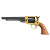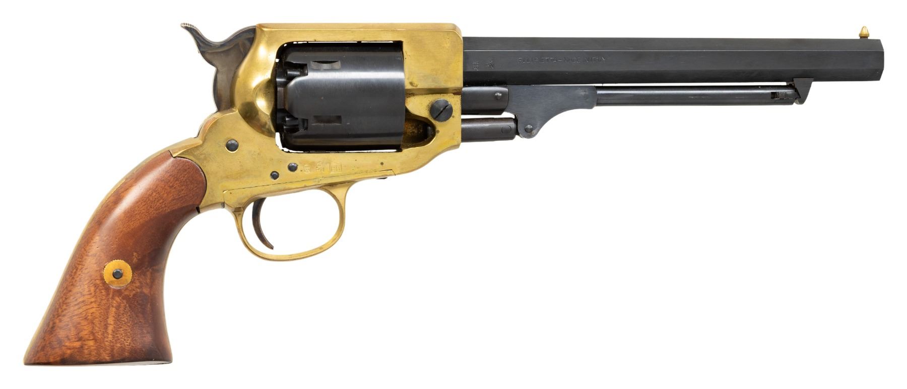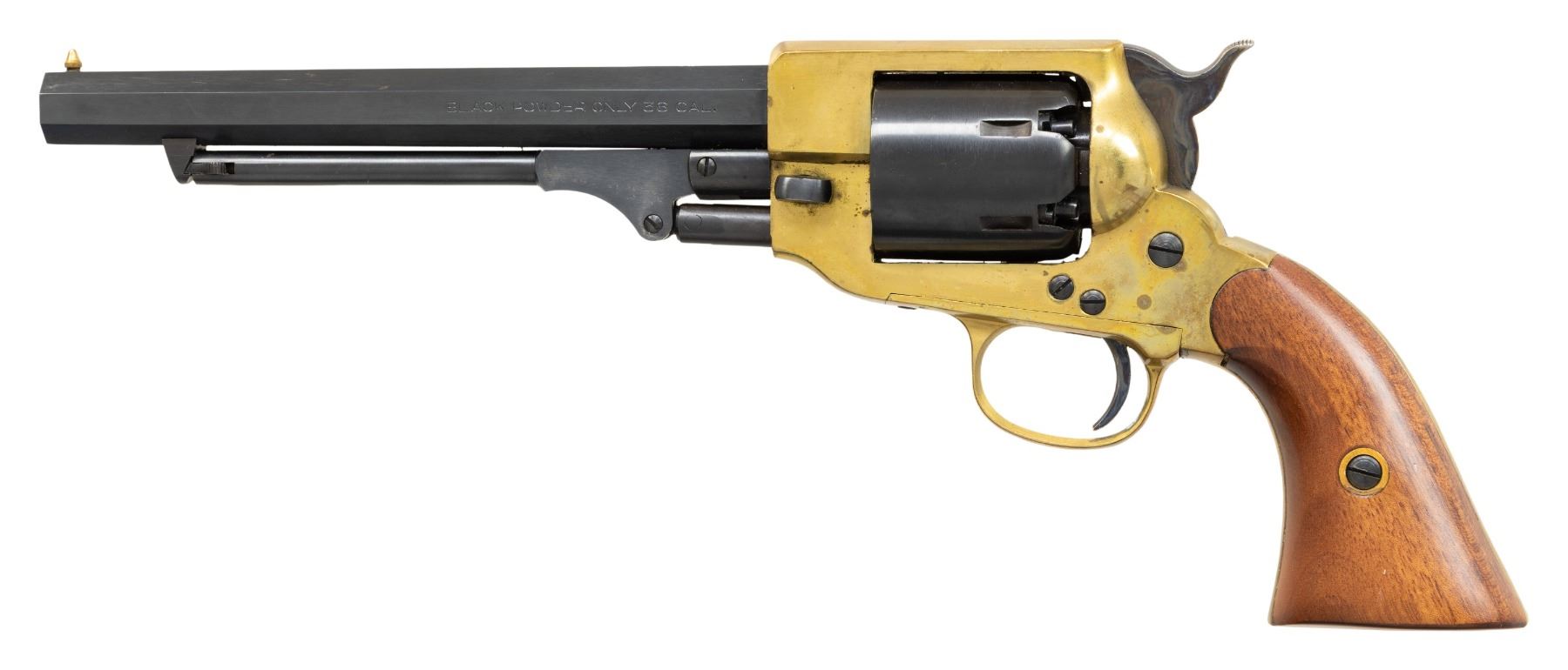 Cal. 36. S# B2556. Bbl. 7". Brass post front sight. Case colored hammer & trigger. Blued bbl., ejector rod & cyl. Balance of other parts are brass. Smooth walnut grips. CONDITION: grips show light handling marks. Brass parts show scattered oxidation spots, handling marks, light scratches & areas turning dull. Case colored parts retain most of their finish with operational wear & light oxidation. Blued parts retain nearly all their finish with some light handling marks. Action functions properly when hand cycled. Very good plus bore with strong rifling. (01-28539/MJC). ANTIQUE. $100-200.