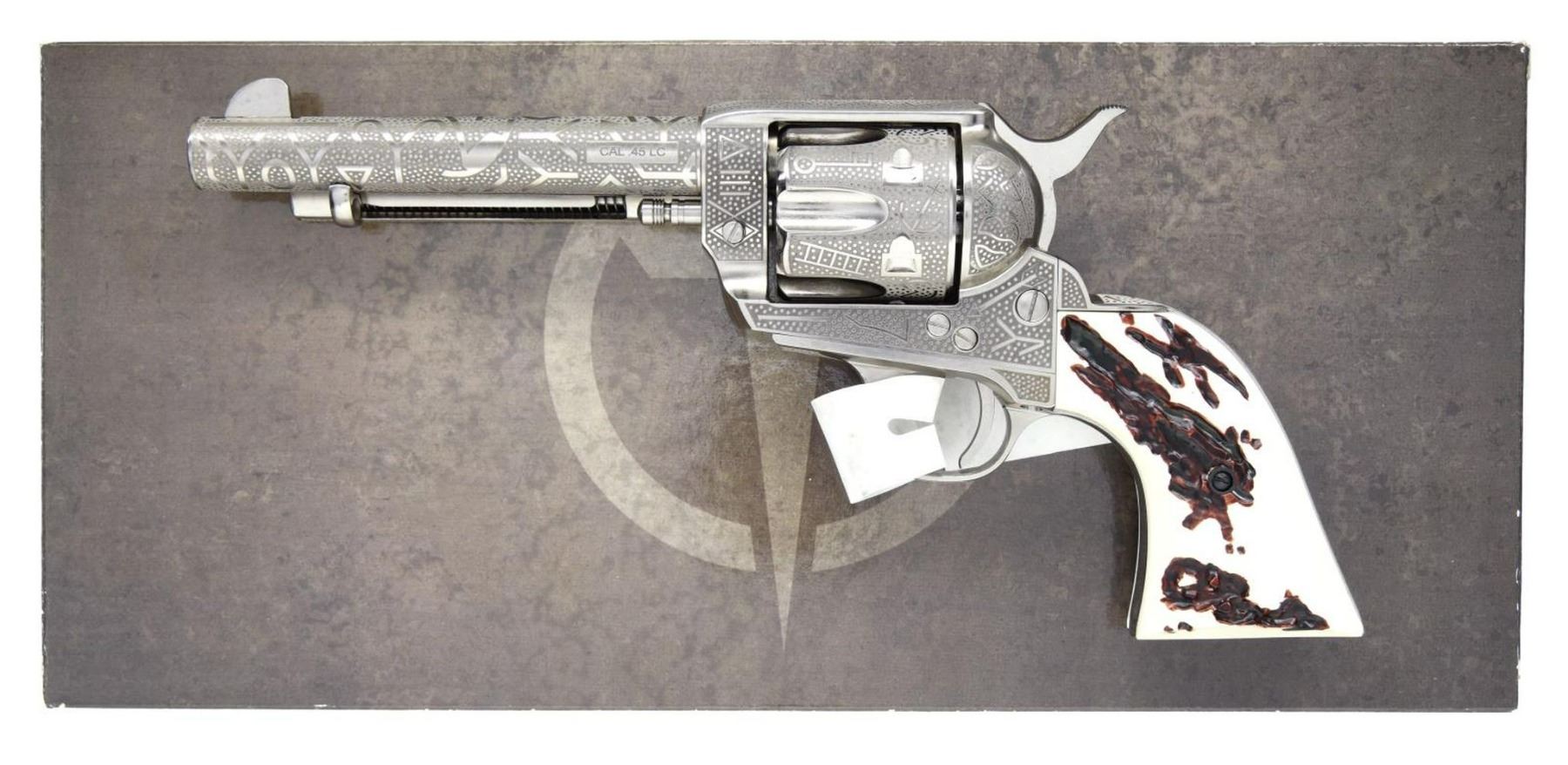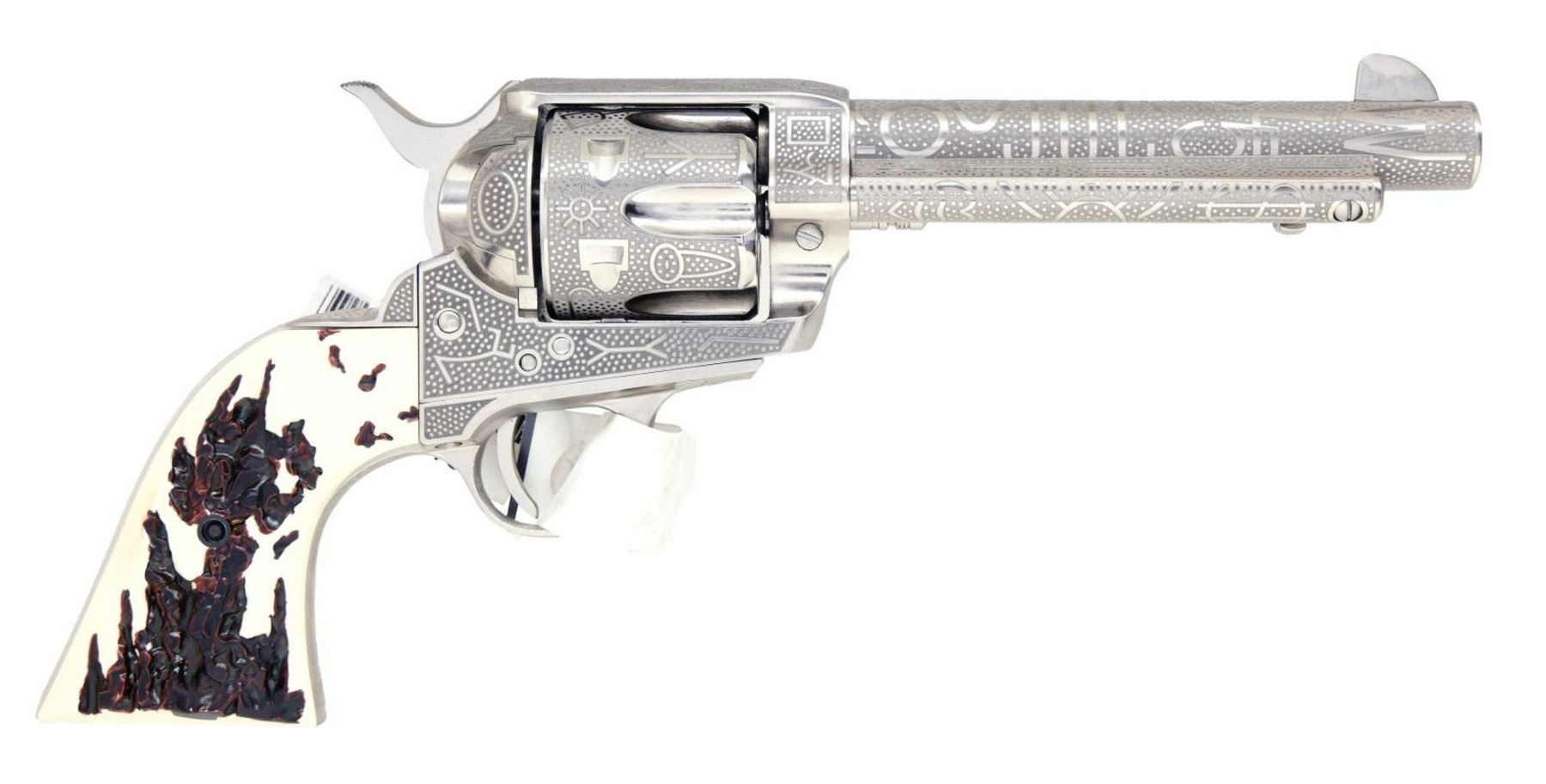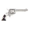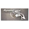 MODEL 1873 SINGLE ACTION REVOLVER WITH MATCHING BOX. Cal. 45 LC. S# E152040. Bbl. 5 1/2". Model 1873 SA revolver mfg. by Pietta and imported/retailed by Taylor's & Co. of Winchester, VA. The left side of the bbl. exhibits the cal designation, with the underside of the bbl. being marked with Taylor's importer and Pietta's mfg. information. Revolver features full coverage cattle brand pattern engraving. Metal components exhibit a nickel plated finish, with the frame being mounted with 2 piece faux stag grips. UNATTACHED ACCESSORIES: matching Taylor's & Co. importer/retailer box. CONDITION: near new, with metal components retaining virtually all of their original factory finishes overall. Mirror bore, exhibiting well defined rifling throughout. Grips are excellent. Box shows some mild exterior wear, but otherwise remains sturdy and serviceable. PROVENANCE: The Collection of Gun Sport Ltd owned by Jon R. Thomas. (23-2742/MLW). MODERN. $500-800.