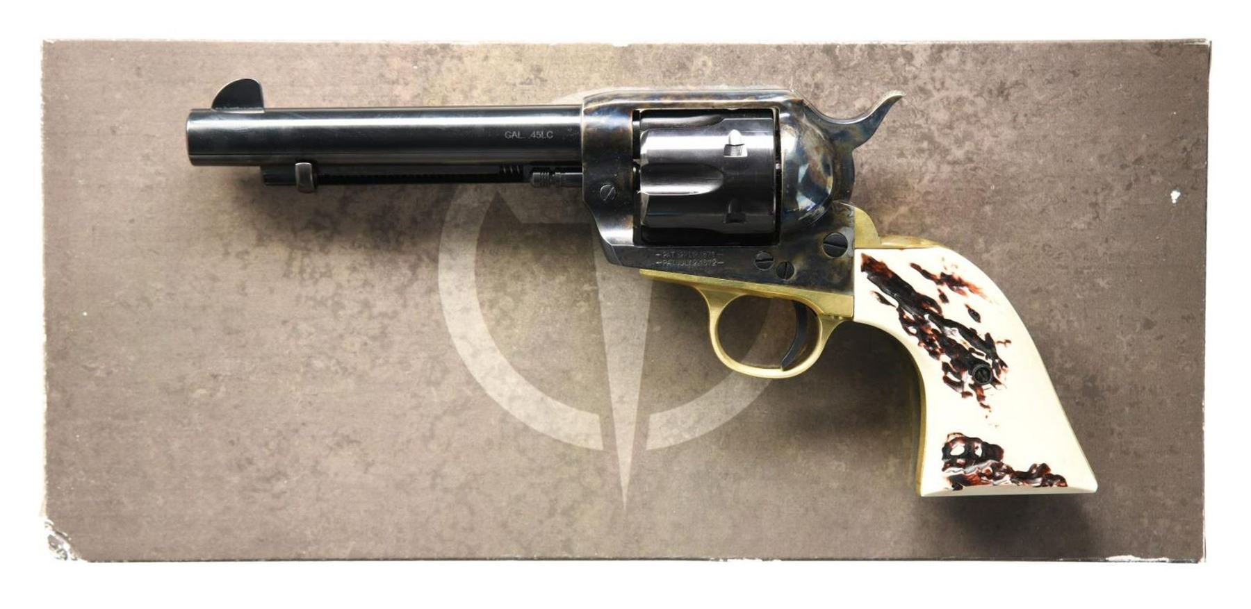 REVOLVER WITH MATCHING BOX. Cal. 45 Colt. S# E143874. Bbl. 5 1/2". Model 1873 SA revolver mfg. by Pietta in Italy and imported/retailed by Taylor's & Co. in Winchester, VA. The left side of the bbl. exhibits the cal. designation, with Taylor's importer and Pietta's mfg. information marked on the underside. Left side of frame is marked with "patent" information. Case color hardened frame, loading gate, and hammer, with blued cyl., bbl., and ejector rod housing. Brass backstrap and trigger guard with 2 piece faux stag grips. UNATTACHED ACCESSORIES: matching Taylor's importer/retailer box. CONDITION: near new, with metal components retaining virtually all of their original factory finishes overall. Mirror bore, exhibiting well defined rifling throughout. Grips are excellent. Box shows some exterior wear, but otherwise remains sturdy and serviceable. PROVENANCE: The Collection of Gun Sport Ltd owned by Jon R. Thomas. (23-3875/MLW). MODERN. $300-500.