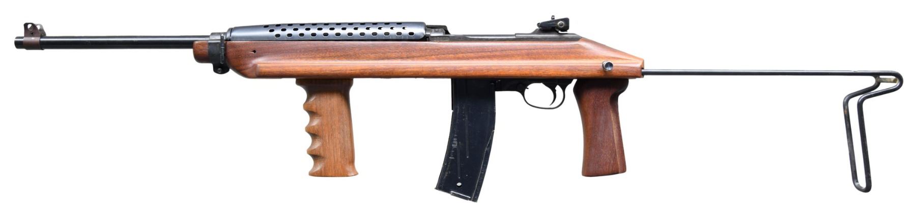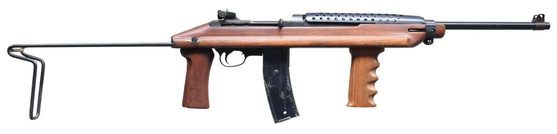 BUTTSTOCK. Cal. 30 Carbine. S# 27010. Bbl. 18". Stamped adjustable aperture rear sight. Blade front sight w/ protective ears. Plainfield carbines were mfg'ed. between 1962 & 1968 in a number of versions. This example features a sliding wire buttstock, separate pistol grip & vertical foregrip. Receiver is marked on top "PLAINFIELD MACHINE / DUNELLEN N.J. / CAL. 30 M-1". Walnut forend & hand grips. Ventilated steel handguard. Front band w/ swivel. Rotary safety. MAGS: 1 detachable 30 rd. marked "AI". CONDITION: wood stock & grips have light wear & scattered small handling marks. Rear grip is notably loose. Metal retains most of its blue finish w/ light wear & scattered scratches. Extendable stock is not readily retracted. Good shiny bore w/ sharp lands. (25-3341/RW). MODERN. $300-500.