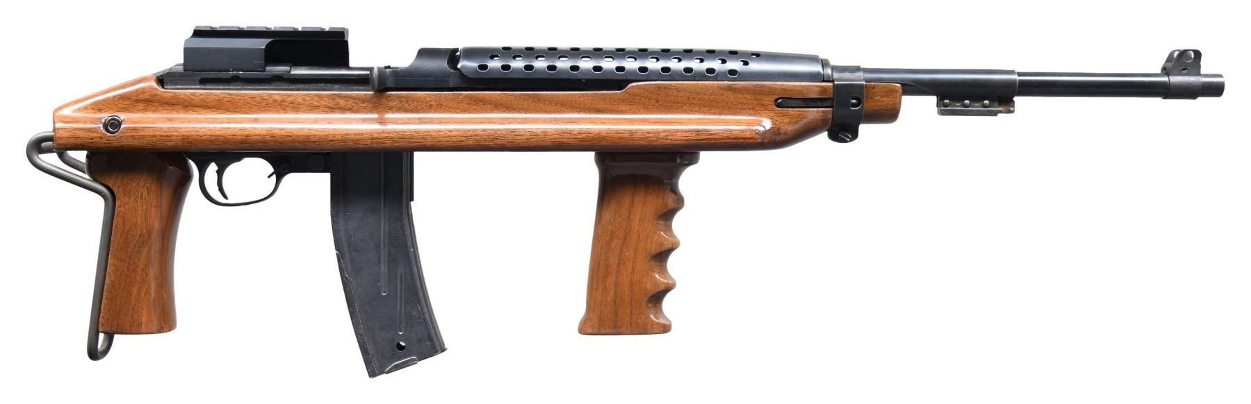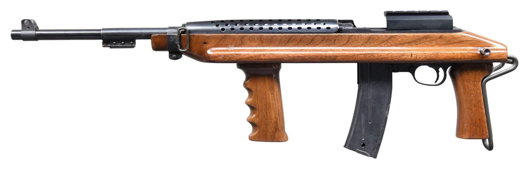 AUTO CARBINE. Cal. 30 Carbine. S# 42829. Bbl. 18". These carbines were manufactured by Plainfield from 1962 to 1978 using both GI & newly manufactured parts. This carbine features vertical hand grips as well as a sliding wire stock, making a very compact & handy design. Original rear sight has been removed & carbine has been fitted w/ a picatinny rail mount over the bridge area. Blade front sight w/ protective ears. Bbl. band carries bayonet lug. Ventilated metal handguard. Walnut stock & hand grips. Sliding wire buttstock locks in both collapsed & extended positions. Alloy trigger housing. MAGS: 1 detachable 30 rd. marked "AYP". CONDITION: stock & hand grips have light wear & scattered handling marks over factory gloss finish. Metal retains 90% original blue finish w/ light wear. Very good shiny bore. (25-2235/RW). MODERN. $300-500.