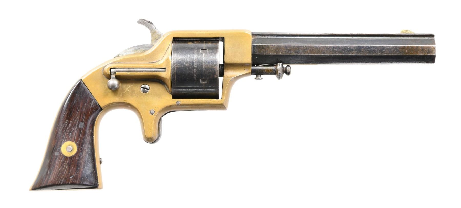 REVOLVER. Cal. 42 for cup-primed cartridge. S# 3804. Bbl. 5 1/4", octagon with German silver blade sight. Top flat is marked "PLANT'S MFG. CO. NEW HAVEN, CT." Left flat is marked "MERWIN & BRAY, NEW YORK." Six-shot round cyl. with 1863 patent date. Brass frame with spur trigger & right side ejector. Sideplate on the right side of the action is stamped "C.D." Two-piece rosewood grips. Slightly over 8,000 mfg. mid-1860s. CONDITION: bbl. and cyl. retain 70% thinning blue. Frame shows evidence of past cleaning with small dents and marks. Sanded and refinished grips show light handling marks. Left panel has an added wood repair at the heel. Right panel has a small crack at heel. Sound mechanics. Bore retains strong rifling. PROVENANCE: From the Collection of a Tennessee Gentleman. (01-25680/DS). ANTIQUE. $2,000-3,000.