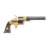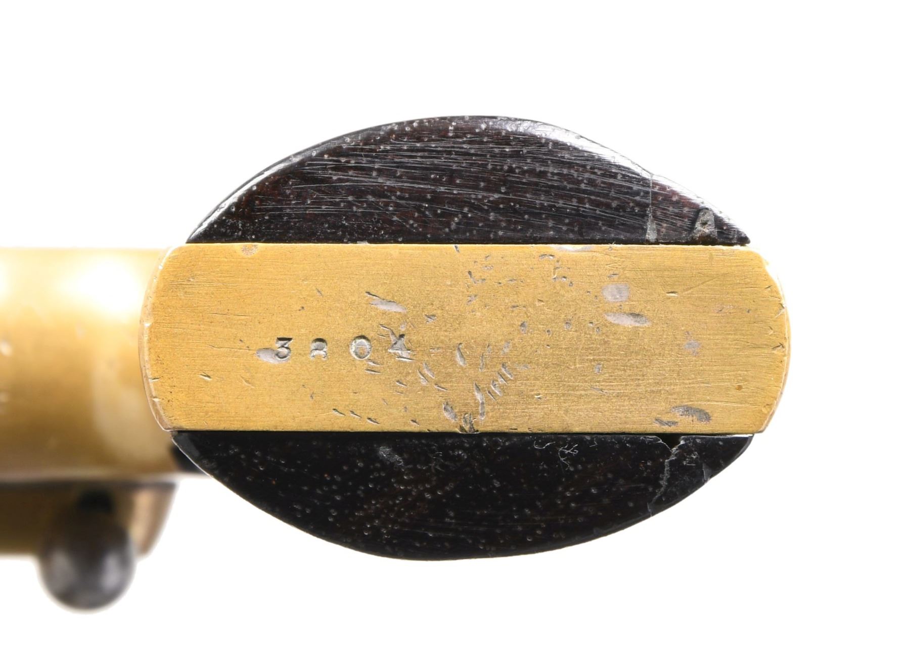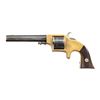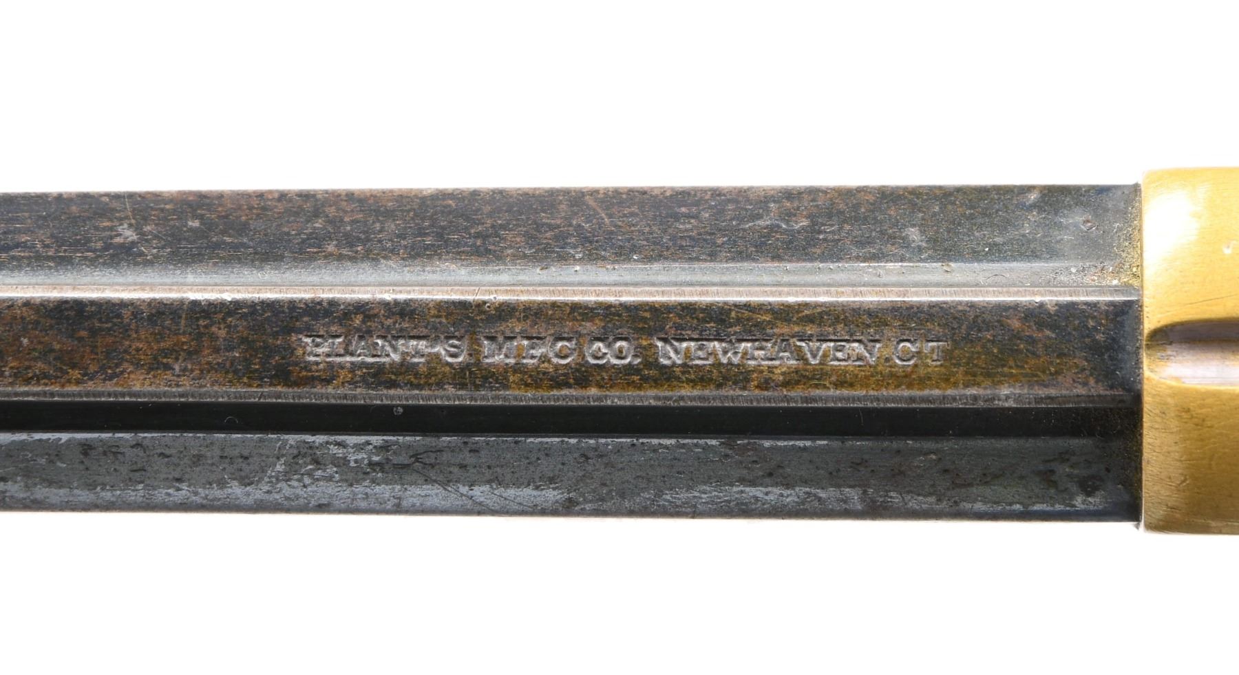 REVOLVER. Cal. 42 for cup-primed cartridge. S# 3804. Bbl. 5 1/4", octagon with German silver blade sight. Top flat is marked "PLANT'S MFG. CO. NEW HAVEN, CT." Left flat is marked "MERWIN & BRAY, NEW YORK." Six-shot round cyl. with 1863 patent date. Brass frame with spur trigger & right side ejector. Sideplate on the right side of the action is stamped "C.D." Two-piece rosewood grips. Slightly over 8,000 mfg. mid-1860s. CONDITION: bbl. and cyl. retain 70% thinning blue. Frame shows evidence of past cleaning with small dents and marks. Sanded and refinished grips show light handling marks. Left panel has an added wood repair at the heel. Right panel has a small crack at heel. Sound mechanics. Bore retains strong rifling. PROVENANCE: From the Collection of a Tennessee Gentleman. (01-25680/DS). ANTIQUE. $1,200-1,800.