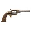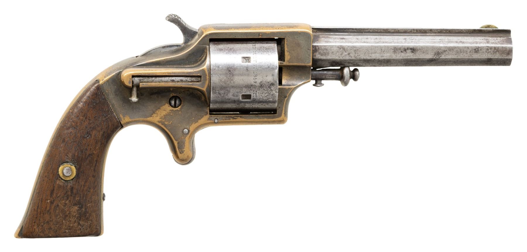 REVOLVER. Cal. 30 Cup Primed. S# 7553. Oct. 3.5". 5 Shot cyl. Brass frame. Two piece walnut grips. CONDITION: barrel & cyl. has gray patina appearance. Brass frame has tarnished silver finish on sides worn off on edges & bottom edges. Fair worn grips. Good rifling with light pitting. Hammer has difficulty cycling 1 position in cyl.; balance mechanically fine. PROVENANCE: Norman Olliff Estate. (01-26917/MD). ANTIQUE. $300-400.