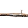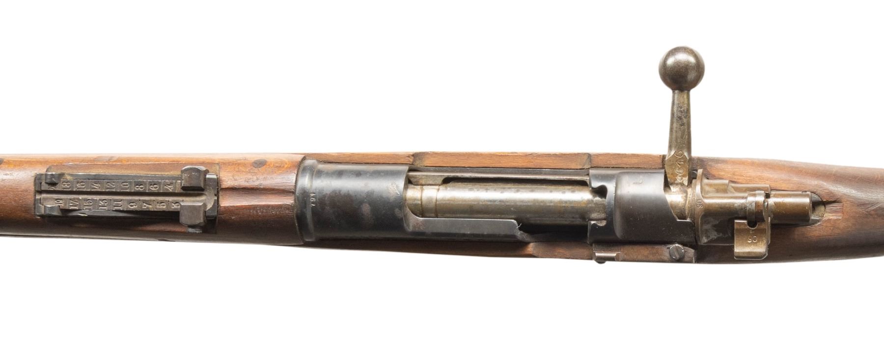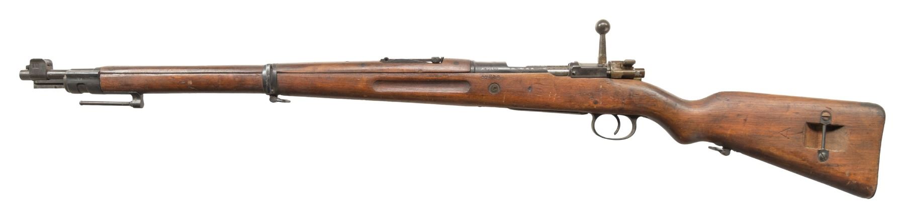 Cal. 8mm Mauser. S# 59250. Bbl. 23 5/8" with older "8mm" import marking. Blade front sight with protective ears. Tangent rear sight graduated to 2000m. Matching numbers on receiver & stock. Other visible parts are mismatched including straight handled bolt. Spanish Civil War Polish K98 with scrubbed crest. Left side of receiver marked "K98". Arsenal rework blue finish. Hardwood stock set bottom mounted & left side sling provisions. Left side of butt has Spanish "A" marking. Polish straight stacking hook present. CONDITION: stock shows a few gouges, scattered black staining, finish loss, dings & handling marks. Metal retains 60% arsenal rework blue with pitting on buttplate, a few spots of further scattered light pitting, scattered oxidation, fading & handling wear. Action functions properly when hand cycled. Good bore with strong rifling. PROVENANCE: From the PMRB Collection. (25-5819/MJC). CURIO. $300-500.
