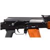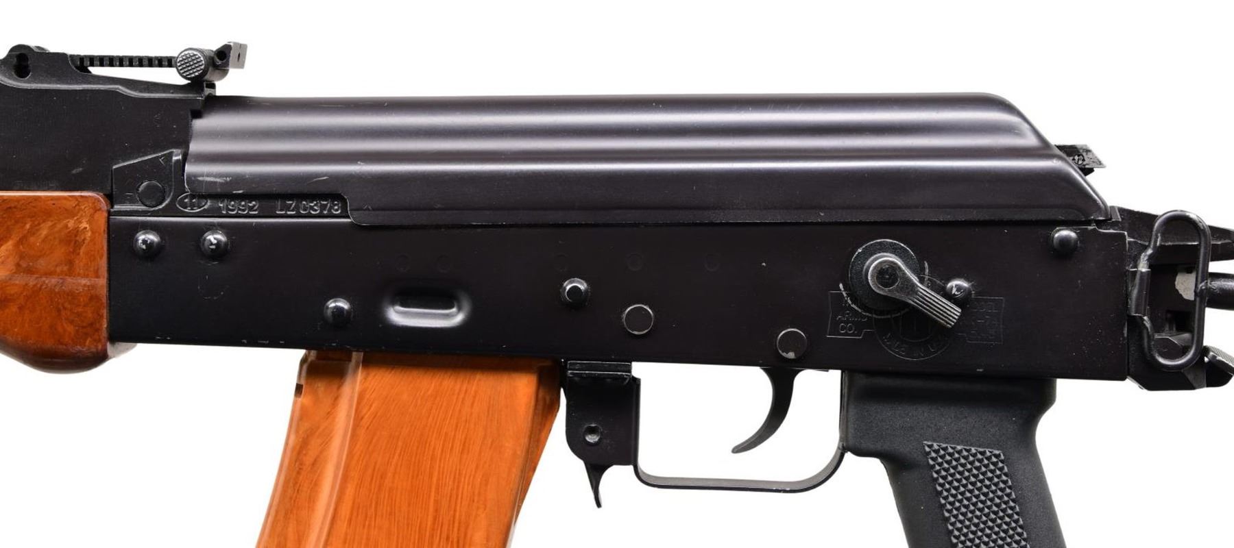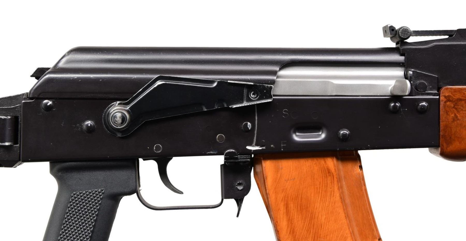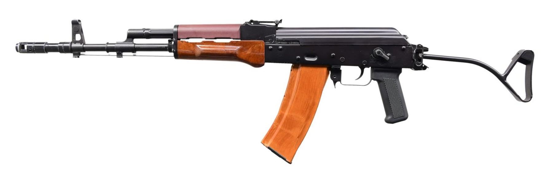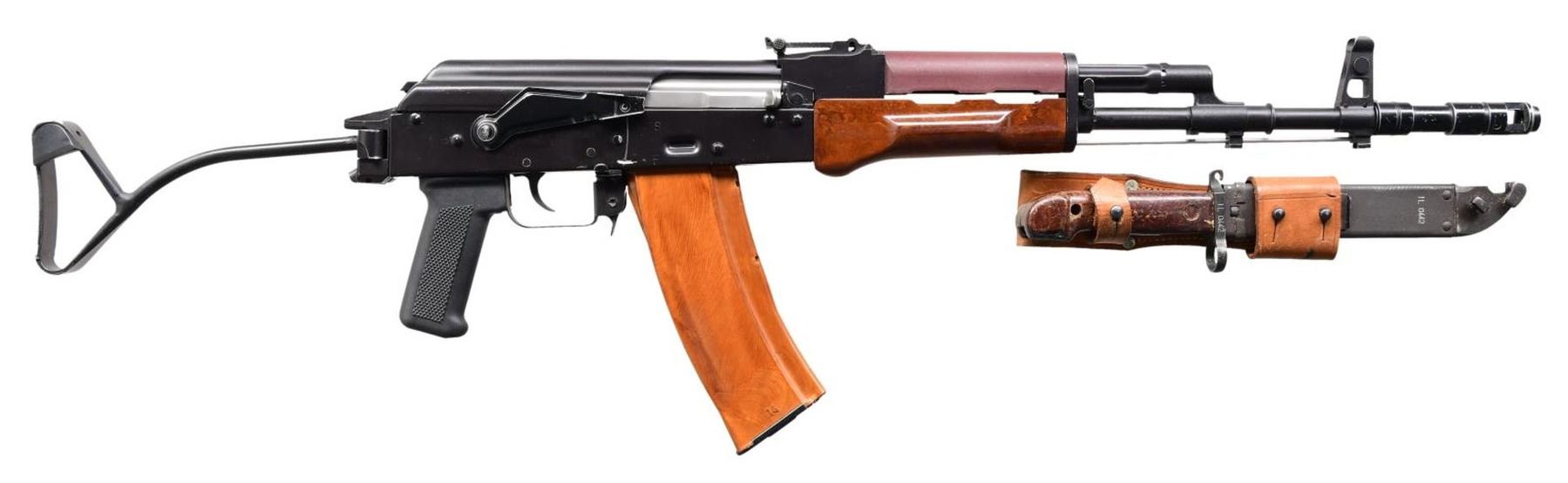 Cal. 5.45x39. S# 0006676. Bbl. 16.5". Threaded barrel terminated w/ 4" muzzle device. Dark black finish on all exposed metal surfaces. Protected post front sight. Rear tangent sight graduated from 100 meters to 1000 meters w/ CQB setting. Bayonet lug retains on-board cleaning rod. Brown bakelite forend w/ brown plastic top heat shield. Black plastic checkered pistol grip. Ambidextrous safety / selector. Right side folding wire stock w/ rubber buffer in loop. Front trunnion still bears original markings including "1992" & Circle-11 Radom stamp. Receiver marked "ITM ARMS / MODEL AK-74 / 5.45" on left side below safety / selector. Left side sling swivels, front & rear. MAGS: 2 bakelite 30 rd. UNATTACHED ACCESSORIES: 2 folding bipods, snap on night sight. Bayonet w/ scabbard. Black nylon Shooting Systems bag. CONDITION: Finish complete & consistent w/ typical range wear. Some thinning on high spots & in areas of mechanical intervention. Muzzle device illustrates more finish wear than gun. Bright bore w/ strong rifling. Fire control mechanism appears to function correctly when cycled by hand. PROVENANCE: From the Working Reference Collection of Military Arms Instructor, Master Sergeant Vincent Pestilli. (23-7545/JZ). MODERN. $800-1,200.
