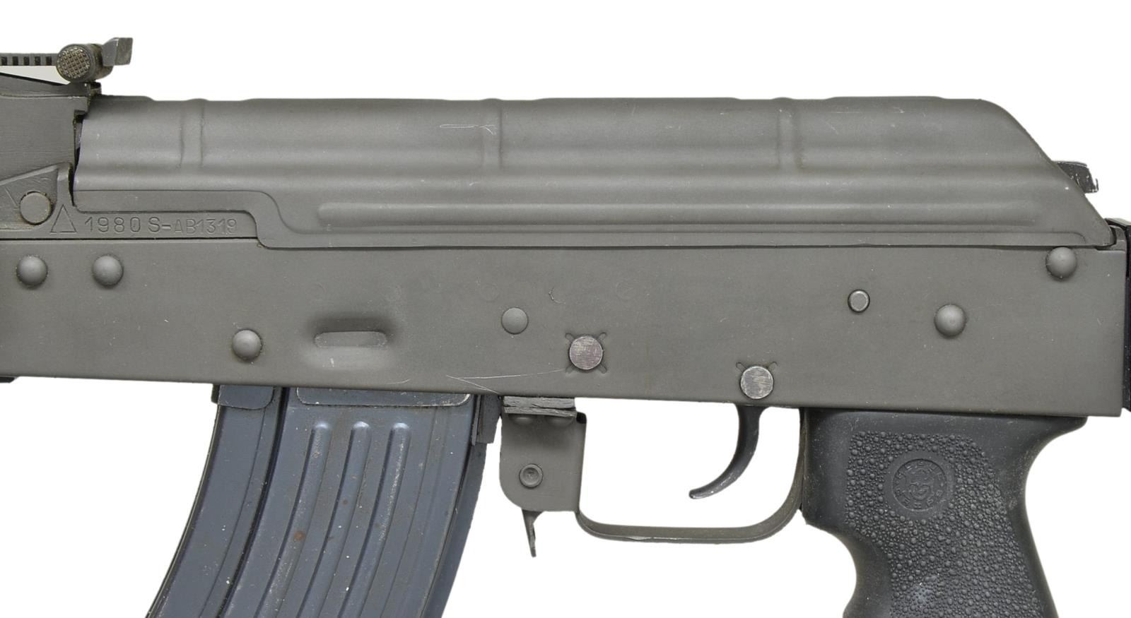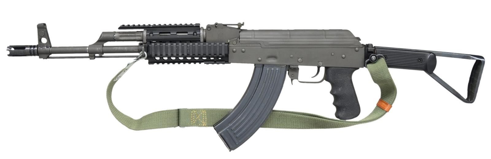 NDS RECEIVER. Cal. 7.62x39. S# M007878. Bbl. 16". An AK47 style rifle built on a NODAK Spud stamped receiver, utilizing what is an extremely accurate Polytech style right side folding stock. Left hand threaded muzzle w/ American made muzzle brake. Protected post front sights & bayonet lug hosts on board cleaning rod. Front rail section replaces traditional handguards w/ picatinny mounting positions at 3, 6, 9, 12 o’clock. A Hogue pistol grip. Right side controls. Matching parkerized finish on all exposed metal surfaces. Rear tangent sight marked to 1000m. Sling mounting on left side w/ green canvas sling. MAGS: 1-30 rd. metal. UNATTACHED ACCESSORIES: VISM canvas transport bag. CONDITION: finish on all exposed metal surfaces is complete & correct. Folding stock locks in both open & closed position. Rails appear not to have hosted any accessories preciously. Muzzle threads are free & clear. Bore is shiny w/ well pronounced rifling. Fire control mechanism appears to function correctly when cycled by hand. (21-778/JZ). MODERN. $500-800.