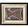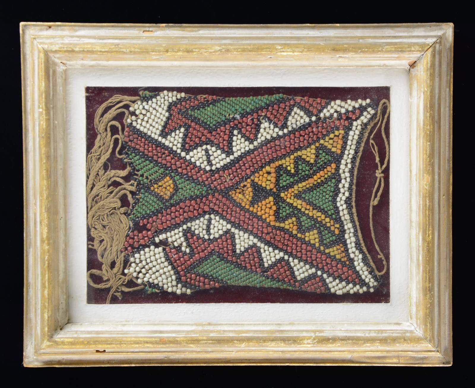 8" x 6.5" geometric decorated face of possible bag maybe, heavy thread sewn, framed and attractive fragment with cord border at top, and fringed bottom. CONDITION: not removed from frame but appears good with small losses of beads. PROVENANCE: Martin Lane Historic & Western Americana Lifetime Collection. (02-21625/JS). $200-300.
