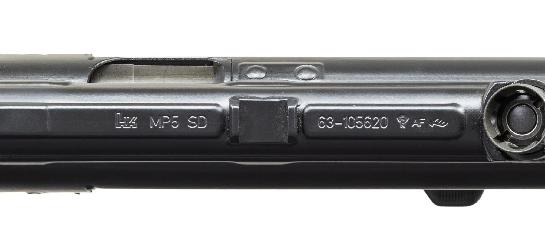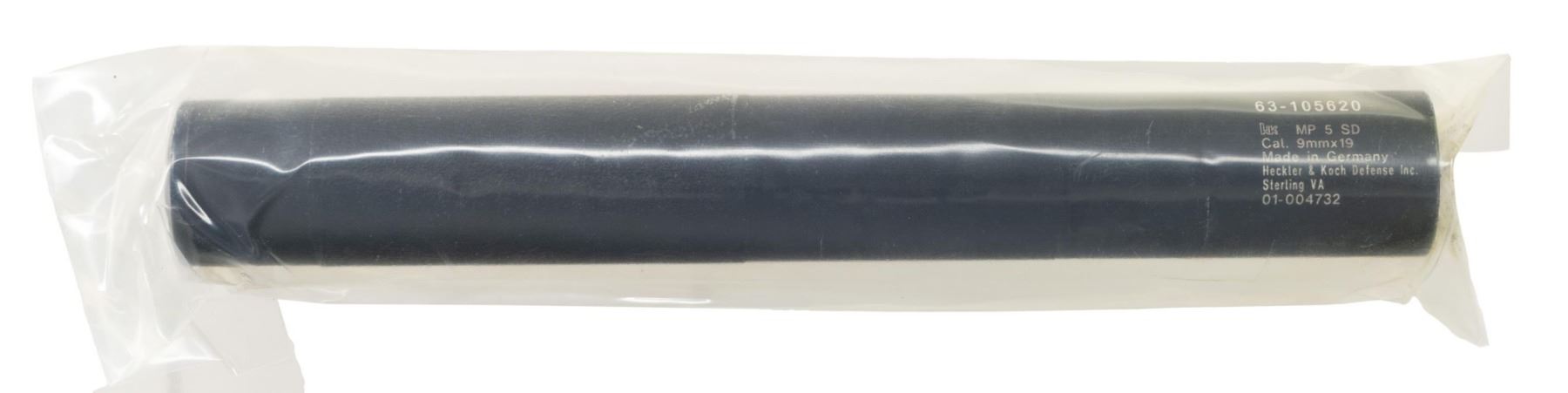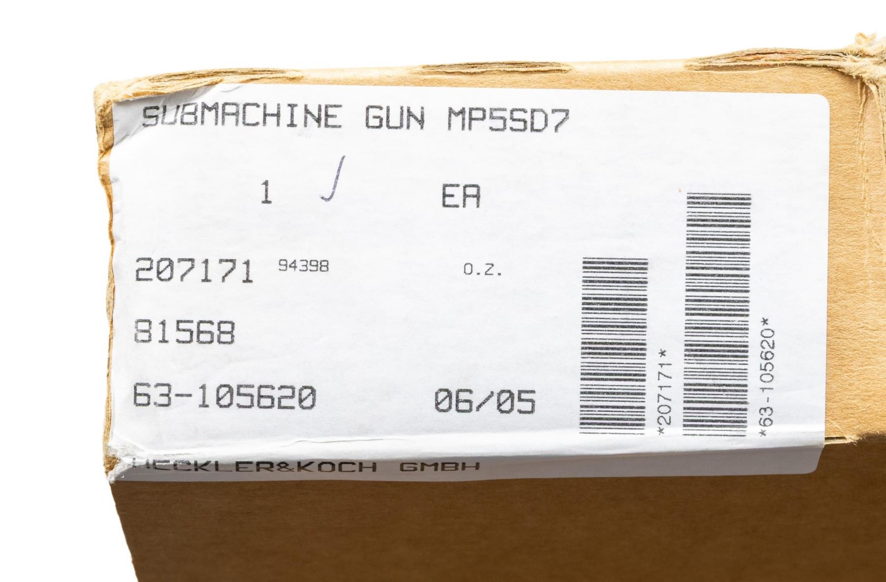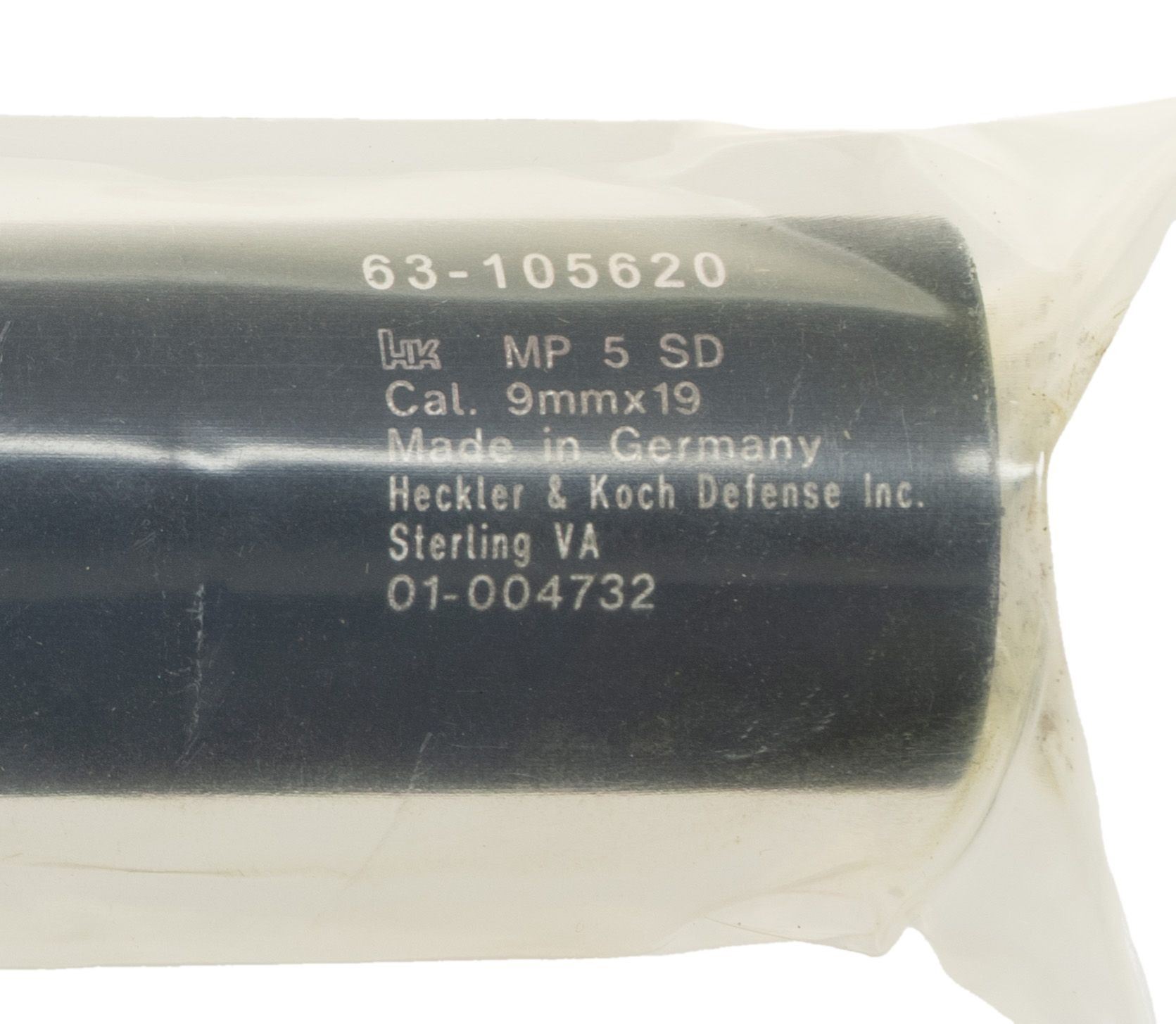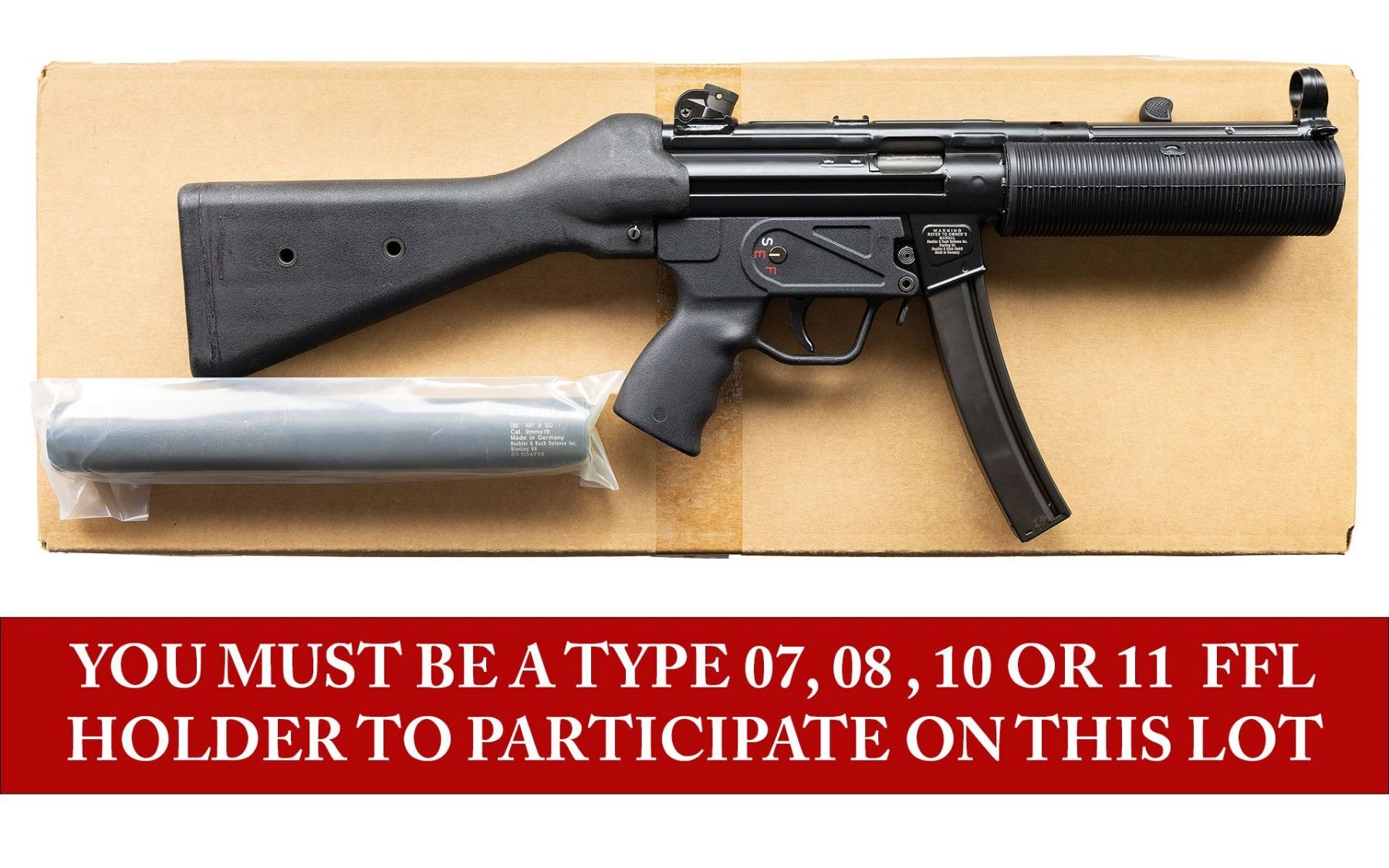 ORIGINAL GERMAN HK MP5 SD SMG WITH ORIGINAL BOX. ***BIDDERS INTERESTED IN THIS LOT MUST CURRENTLY HOLD A TYPE 07, 08, 10, OR 11 FFL.*** Cal 9x19mm. S# SMG= 63-105620. SUPP. =01-004732. Bbl 6" without suppressor. A factory original, German MP5 SD, with the original, still sealed sound suppressor, not a domestic conversion. Top rail marked "HK MP5 SD, S#, Eagle -N AF Antler proof". Drum rear sight. Right side of mag well is marked "Warning/Refer to owner/manual/Heckler & Koch Defense Inc/Sterling, VA/Heckler & Koch GmbH/Made in Germany". S, E, F selector positions. Paddle and button mag release. MAGS: 1-30 Rd Marked "Restricted Law Enforcement/Government use only 10-94/Heckler & Koch GmbH, Heckler & Koch Inc/Made in Germany Sterling VA". UNATTACHED ACCESSORIES: unopened original matching numbered factory suppressor in original plastic wrap, original box, manual, web sling. CONDITION: all aspects as new and unfired including bore. POST 1986 DEALER SAMPLE MACHINE GUN WITH NO LAW (DEMO) LETTER REQUIRED TO TRANSFER. RESTRICTED REGISTRATION POSSESSION LIMITED TO CONTINUED COMPLIANCE WITH PROVISIONS OF PUBLIC LAW 99-308. IF YOU ARE AN 07, 08, 10, or 11 FFL/SOT YOU MAY TAKE TRANSFER OF THIS FIREARM UPON APPROVAL OF TRANSFER. PROVENANCE: Military Museum Collection of Shooters Outpost, Hooksett NH. THIS ITEM WILL BE AVAILABLE FOR PREVIEW BY APPOINTMENT AT THE SHOOTERS OUTPOST MUSEUM IN HOOKSETT, NH. TO SET UP AN APPOINTMENT, PLEASE CALL 207-453-2114. (50-1841/ZAL). MODERN CLASS III. $14,000-18,000.