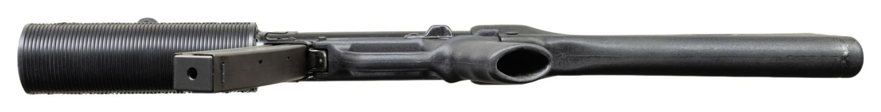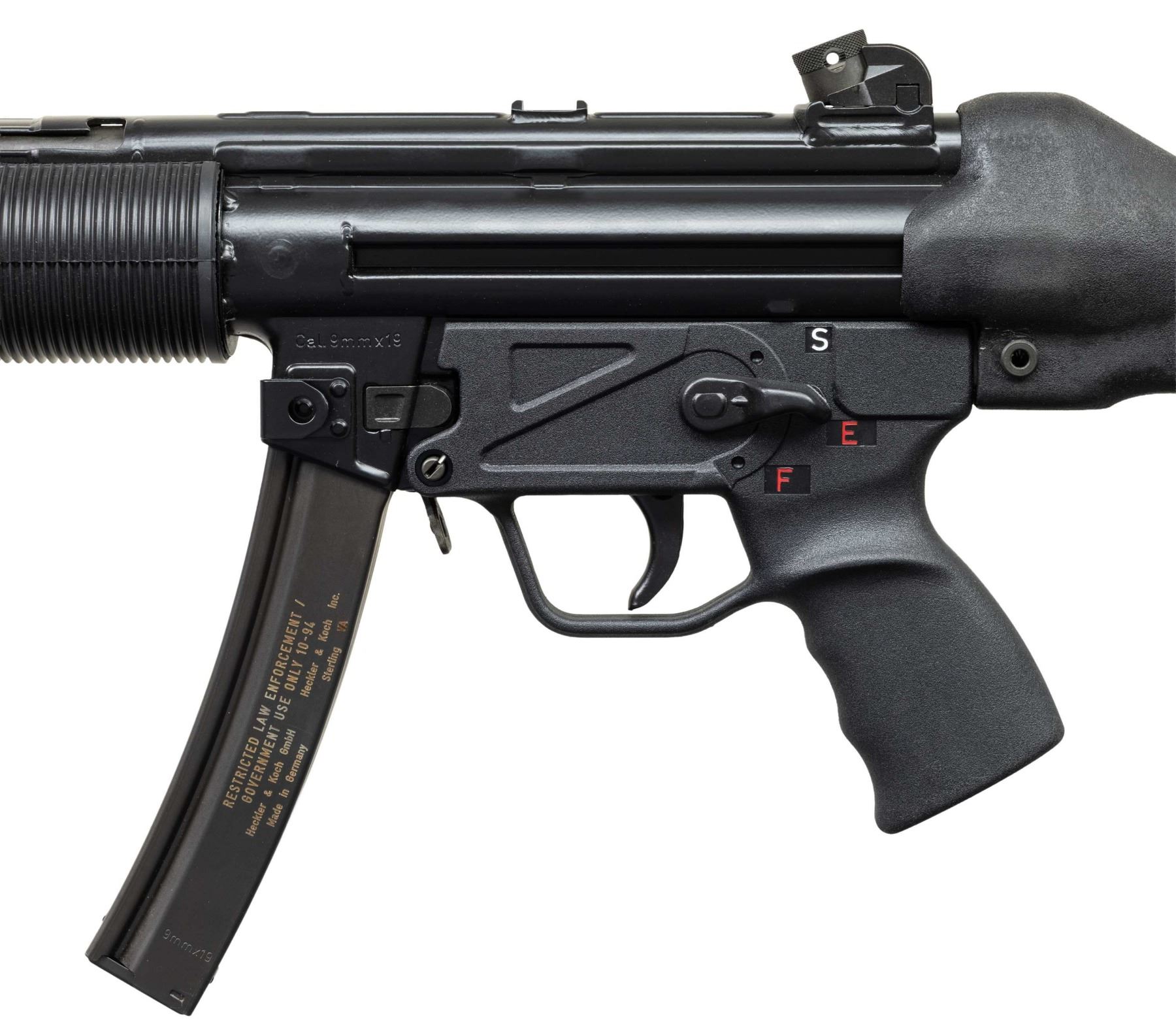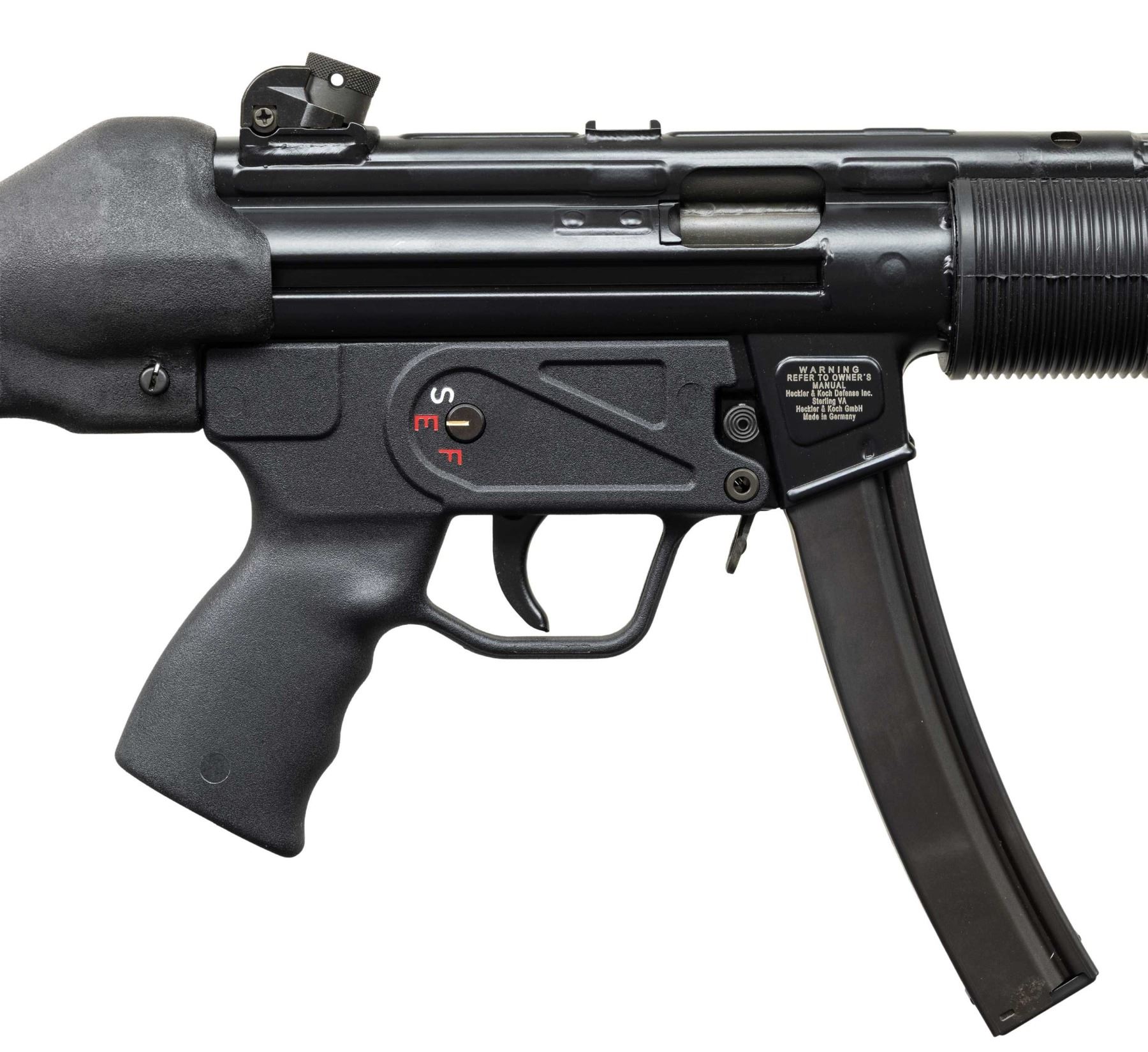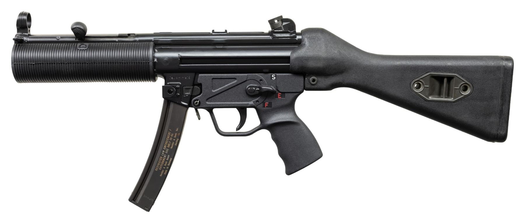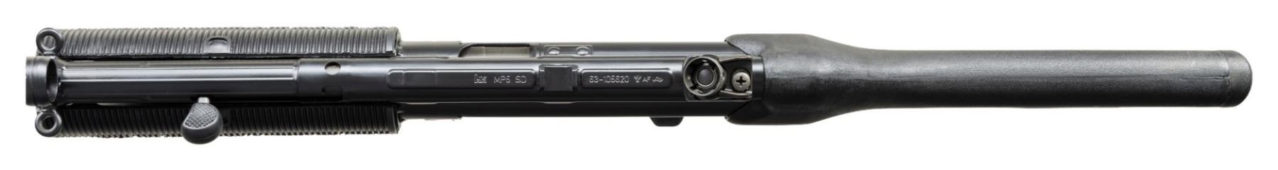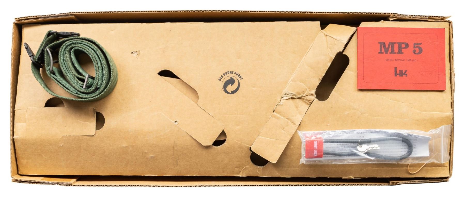 ORIGINAL GERMAN HK MP5 SD SMG WITH ORIGINAL BOX. ***BIDDERS INTERESTED IN THIS LOT MUST CURRENTLY HOLD A TYPE 07, 08, 10, OR 11 FFL.*** Cal 9x19mm. S# SMG= 63-105620. SUPP. =01-004732. Bbl 6" without suppressor. A factory original, German MP5 SD, with the original, still sealed sound suppressor, not a domestic conversion. Top rail marked "HK MP5 SD, S#, Eagle -N AF Antler proof". Drum rear sight. Right side of mag well is marked "Warning/Refer to owner/manual/Heckler & Koch Defense Inc/Sterling, VA/Heckler & Koch GmbH/Made in Germany". S, E, F selector positions. Paddle and button mag release. MAGS: 1-30 Rd Marked "Restricted Law Enforcement/Government use only 10-94/Heckler & Koch GmbH, Heckler & Koch Inc/Made in Germany Sterling VA". UNATTACHED ACCESSORIES: unopened original matching numbered factory suppressor in original plastic wrap, original box, manual, web sling. CONDITION: all aspects as new and unfired including bore. POST 1986 DEALER SAMPLE MACHINE GUN WITH NO LAW (DEMO) LETTER REQUIRED TO TRANSFER. RESTRICTED REGISTRATION POSSESSION LIMITED TO CONTINUED COMPLIANCE WITH PROVISIONS OF PUBLIC LAW 99-308. IF YOU ARE AN 07, 08, 10, or 11 FFL/SOT YOU MAY TAKE TRANSFER OF THIS FIREARM UPON APPROVAL OF TRANSFER. PROVENANCE: Military Museum Collection of Shooters Outpost, Hooksett NH. THIS ITEM WILL BE AVAILABLE FOR PREVIEW BY APPOINTMENT AT THE SHOOTERS OUTPOST MUSEUM IN HOOKSETT, NH. TO SET UP AN APPOINTMENT, PLEASE CALL 207-453-2114. (50-1841/ZAL). MODERN CLASS III. $14,000-18,000.