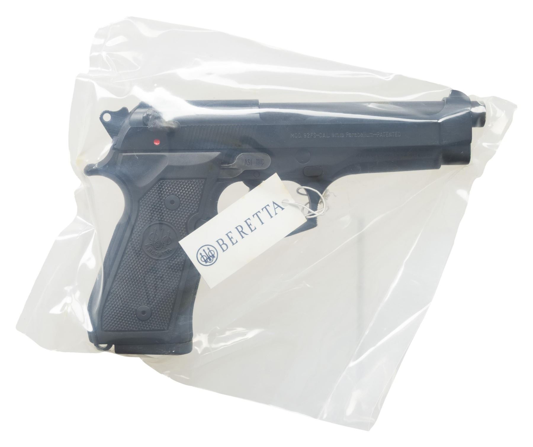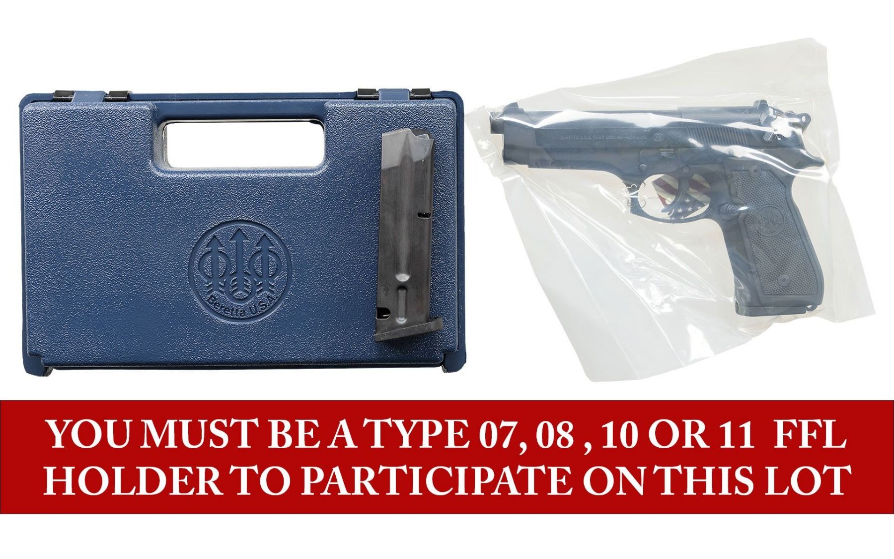 MACHINE PISTOL. ***BIDDERS INTERESTED IN THIS LOT MUST CURRENTLY HOLD A TYPE 07, 08, 10, OR 11 FFL.*** Cal. 9mm Para. S# Host Gun = BER385145, Sear = B0101. Bbl 5". Low Light Sight. Ambidextrous Safety. Checkered black plastic grip. Serrated straps. MAGS: 2 -10 Round. UNATTACHED ACCESSORIES: Unlabeled Beretta box and Manual. CONDITION: Overall like new, appears unfired with a Beretta hang tag. POST 1986 DEALER SAMPLE MACHINE GUN WITH NO LAW (DEMO) LETTER REQUIRED TO TRANSFER. RESTRICTED REGISTRATION POSSESSION LIMITED TO CONTINUED COMPLIANCE WITH PROVISIONS OF PUBLIC LAW 99-308. IF YOU ARE AN 07, 08, 10, or 11 FFL/SOT YOU MAY TAKE TRANSFER OF THIS FIREARM UPON APPROVAL OF TRANSFER. PROVENANCE: Military Museum Collection of Shooters Outpost, Hooksett NH. THIS ITEM WILL BE AVAILABLE FOR PREVIEW BY APPOINTMENT AT THE SHOOTERS OUTPOST MUSEUM IN HOOKSETT, NH. TO SET UP AN APPOINTMENT, PLEASE CALL 207-453-2114. (50-1836/ZAL). MODERN. CLASS III. $2,500-3,500.