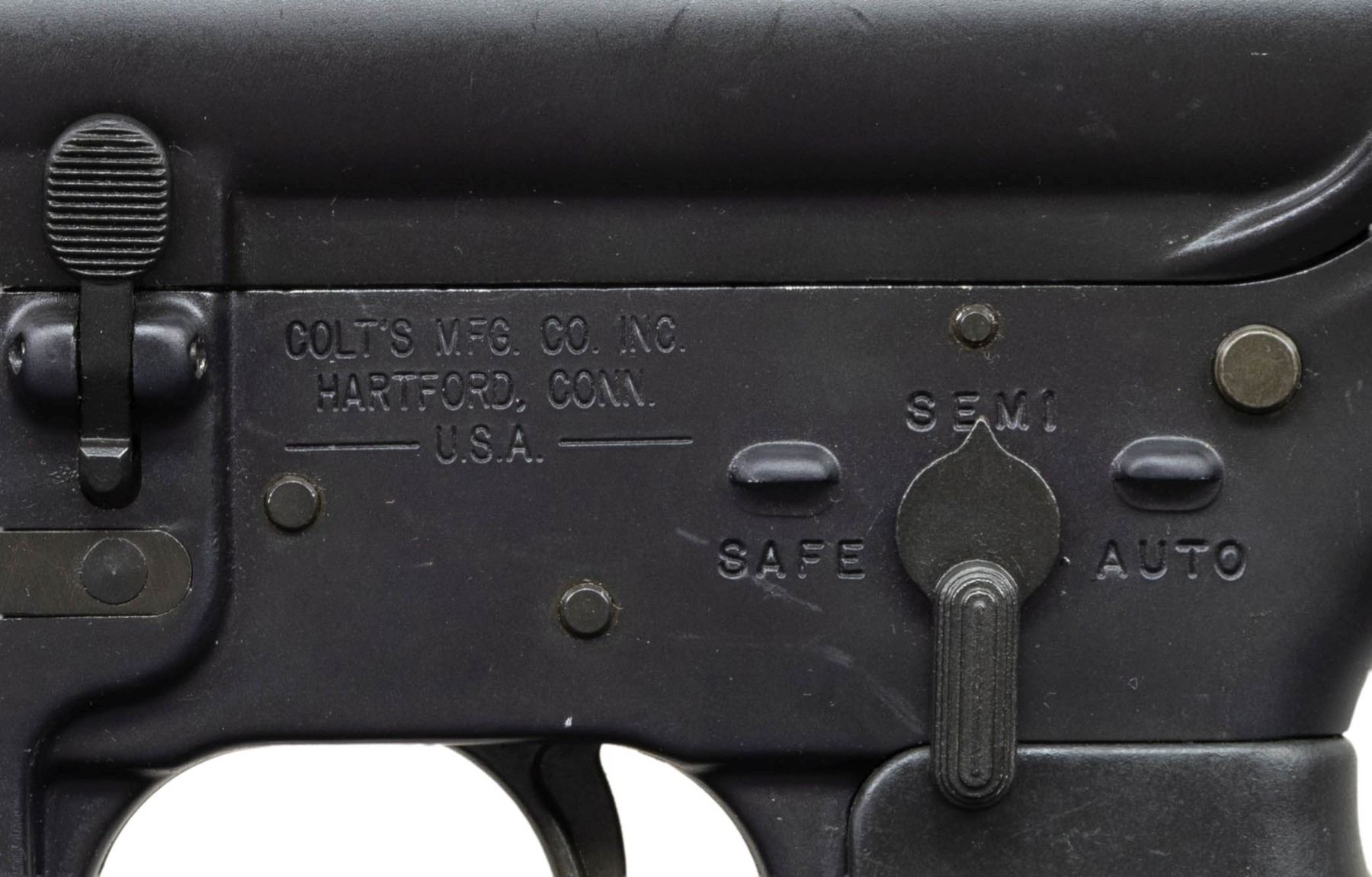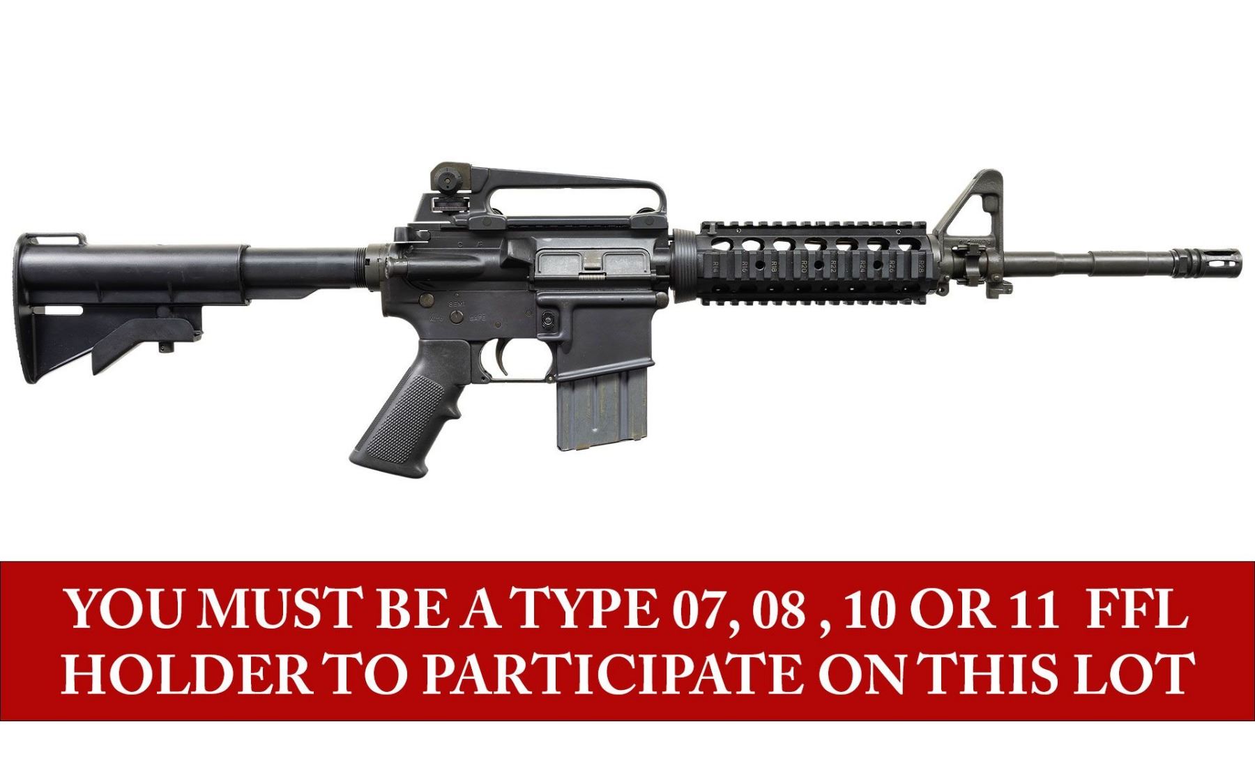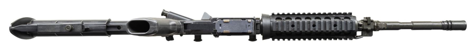 MACHINE GUN. ***BIDDERS INTERESTED IN THIS LOT MUST CURRENTLY HOLD A TYPE 07, 08, 10, OR 11 FFL.*** Cal 5.56mm. S# A0137458. Bbl is 16" over muzzle brake. Manufactured by Colt Manufacturing Company Hartford, Connecticut. Safe, semi and auto selector positions. Collapsible stock. A2 Style carry handle and front sight with bayonet left. Quad rail forearm. MAGS: 1 Colt AR15 20-rd. CONDITION: overall very good with a few minor handling marks. very fine bore with nice rifling. POST 1986 DEALER SAMPLE MACHINE GUN WITH NO LAW (DEMO) LETTER REQUIRED TO TRANSFER. RESTRICTED REGISTRATION POSSESSION LIMITED TO CONTINUED COMPLIANCE WITH PROVISIONS OF PUBLIC LAW 99-308. IF YOU ARE AN 07, 08, 10, or 11 FFL/SOT YOU MAY TAKE TRANSFER OF THIS FIREARM UPON APPROVAL OF TRANSFER. PROVENANCE: Military Museum Collection of Shooters Outpost, Hooksett NH. THIS ITEM WILL BE AVAILABLE FOR PREVIEW BY APPOINTMENT AT THE SHOOTERS OUTPOST MUSEUM IN HOOKSETT, NH. TO SET UP AN APPOINTMENT, PLEASE CALL 207-453-2114. (50-1885/ZAL). MODERN CLASS III. $1,800-2,500.