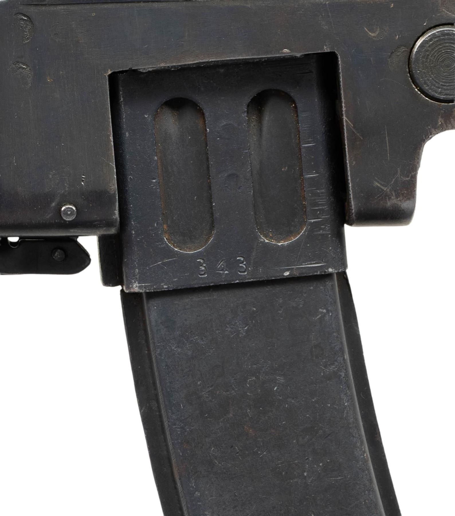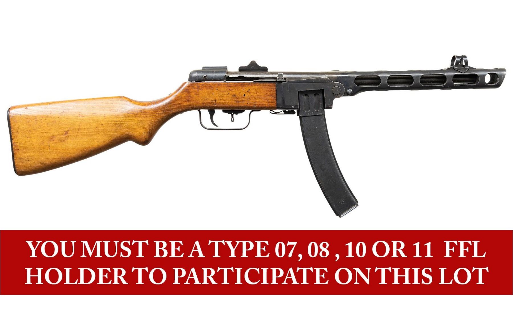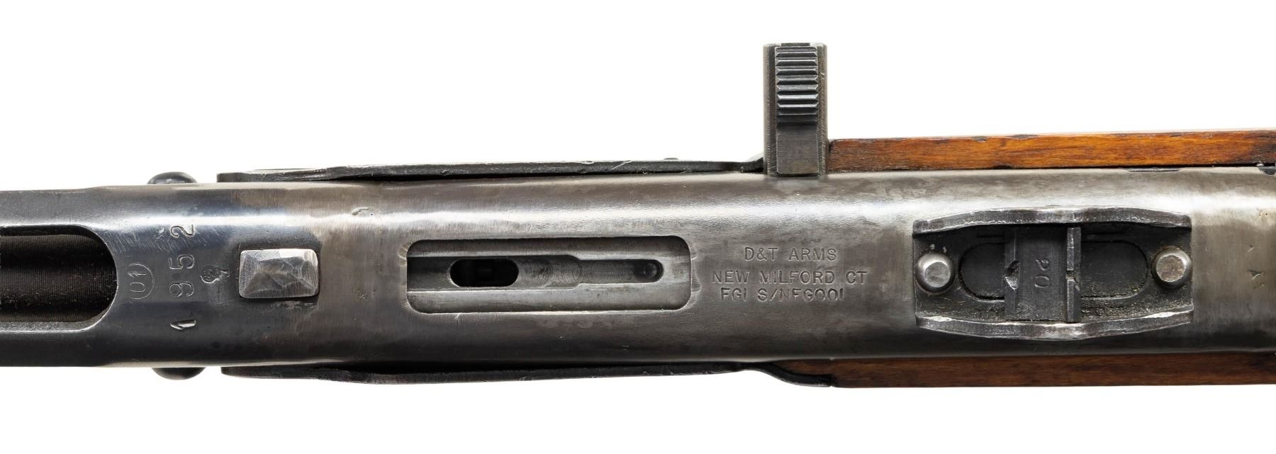 GUN. ***BIDDERS INTERESTED IN THIS LOT MUST CURRENTLY HOLD A TYPE 07, 08, 10, OR 11 FFL.*** Cal 7.62x25 Tok. S# FG001. Bbl 10" with electro-pencil "RB8249". Top of receiver is marked "D&T Arms/ New Milford PT/SGI SN SG001" with 1952 date. Stock is marked with BD4693 that matches the trigger guard and rear tang. Receiver has been re-welded. MAGS: 1-35rd. CONDITION: overall fair with finish remaining in the shrouded area. Receiver is void of finish in re-welded area. Stock shows scattered minor handling marks and impressions. Bright bore with sharp rifling. POST 1986 DEALER SAMPLE MACHINE GUN WITH NO LAW (DEMO) LETTER REQUIRED TO TRANSFER. RESTRICTED REGISTRATION POSSESSION LIMITED TO CONTINUED COMPLIANCE WITH PROVISIONS OF PUBLIC LAW 99-308. IF YOU ARE AN 07, 08, 10, or 11 FFL/SOT YOU MAY TAKE TRANSFER OF THIS FIREARM UPON APPROVAL OF TRANSFER. PROVENANCE: Military Museum Collection of Shooters Outpost, Hooksett NH. THIS ITEM WILL BE AVAILABLE FOR PREVIEW BY APPOINTMENT AT THE SHOOTERS OUTPOST MUSEUM IN HOOKSETT, NH. TO SET UP AN APPOINTMENT, PLEASE CALL 207-453-2114. (50-1866/ZAL). MODERN CLASS III. $1,500-2,500.