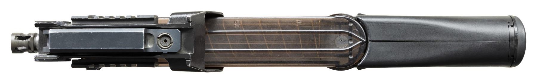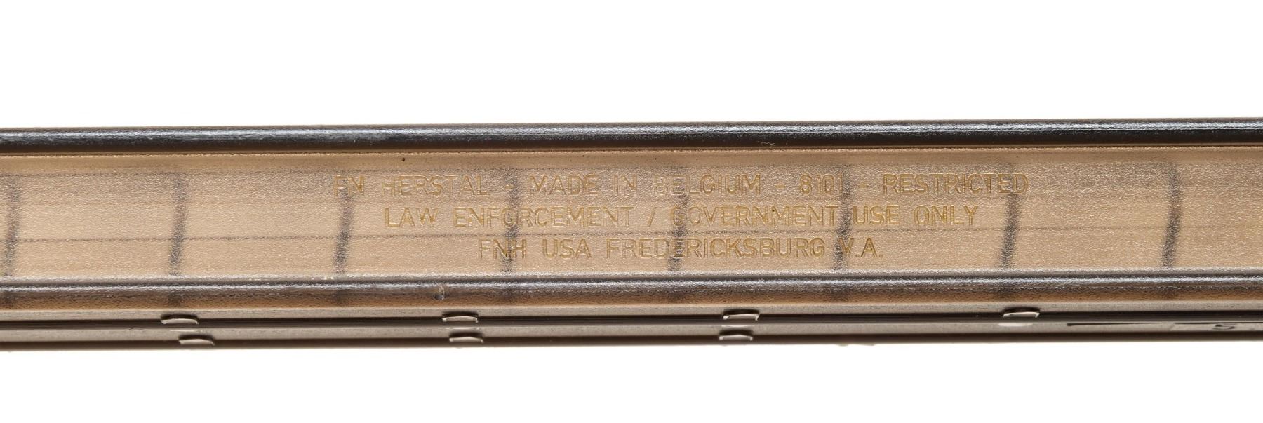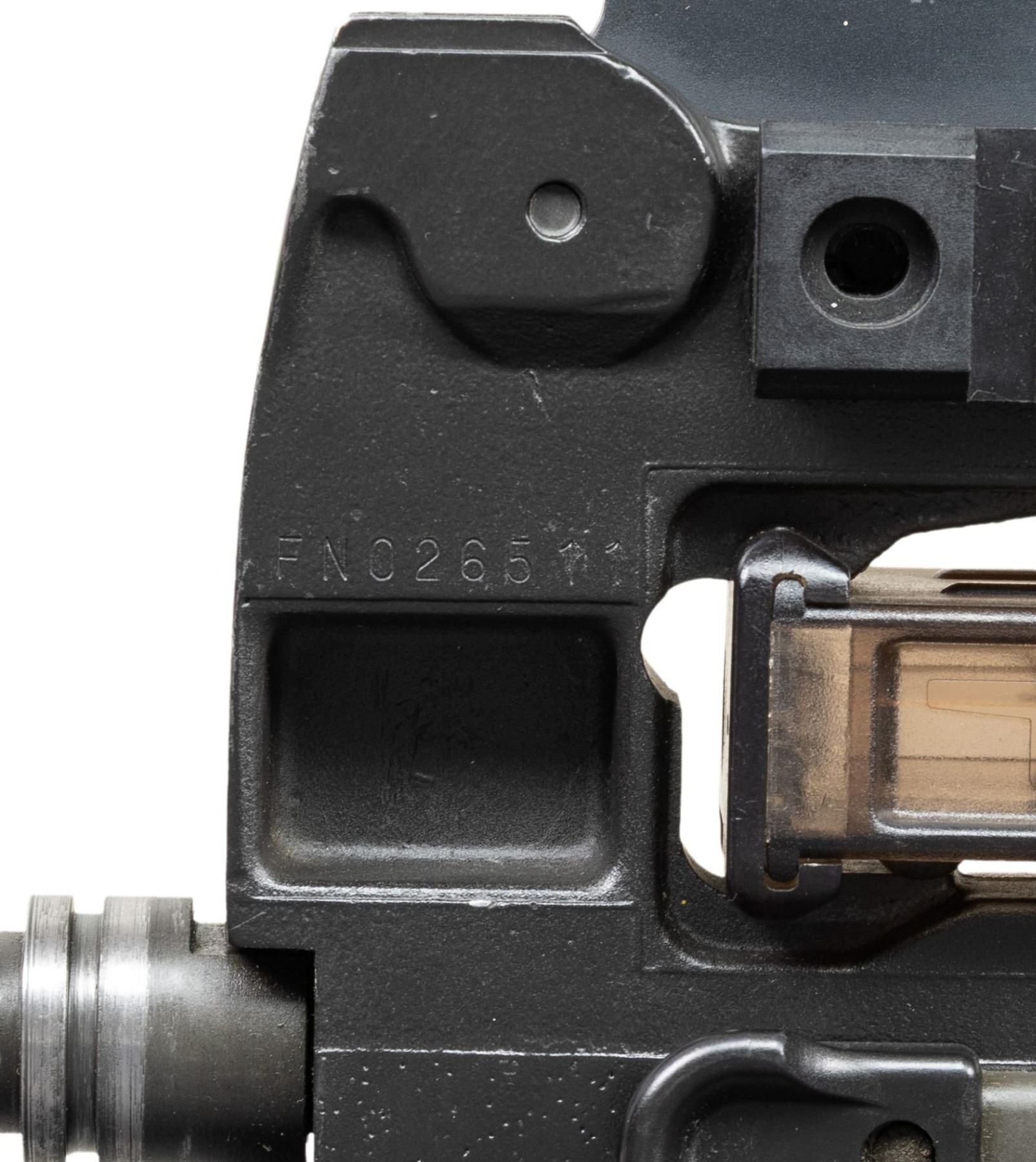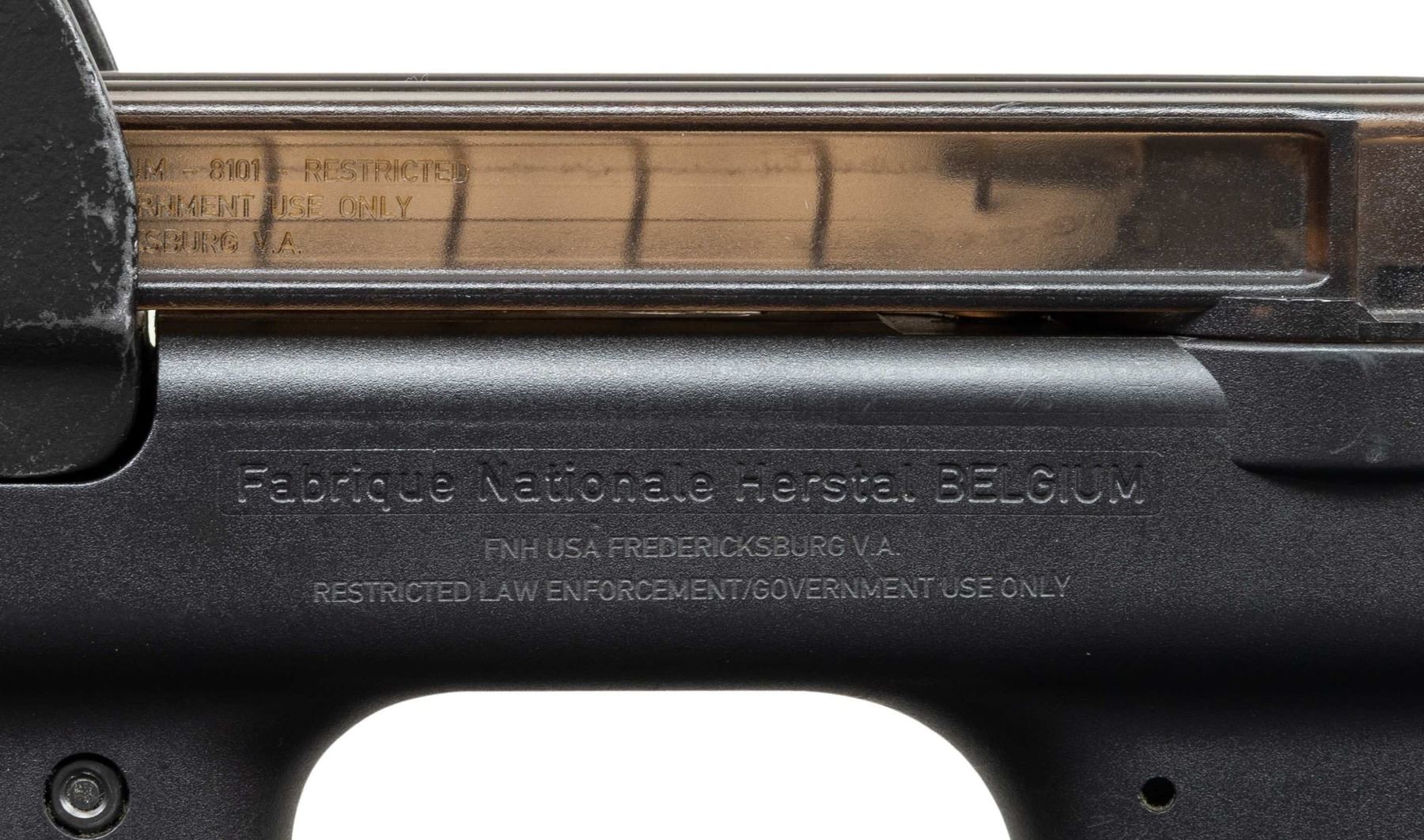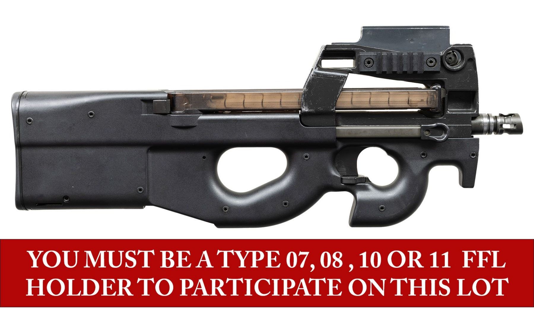 SUBMACHINE GUN. ***BIDDERS INTERESTED IN THIS LOT MUST CURRENTLY HOLD A TYPE 07, 08, 10, OR 11 FFL HOLDER *** Cal 5.7x28. S# FN026511. Bbl 12" with flash suppressor. An opportunity to transfer in an original, select-fire P90 PDW. This is not a domestically converted semiautomatic, but the real deal by FN. Black composite stock. Ambidextrous cocking lever and selector. MAGS: 1-50 rd. CONDITION: overall good with some high edge wear and scuffing and mild scratches. Very nice bright bore with sharp rifling. POST 1986 DEALER SAMPLE MACHINE GUN WITH NO LAW (DEMO) LETTER REQUIRED TO TRANSFER. RESTRICTED REGISTRATION POSSESSION LIMITED TO CONTINUED COMPLIANCE WITH PROVISIONS OF PUBLIC LAW 99-308. IF YOU ARE AN 07, 08, 10, or 11 FFL/SOT YOU MAY TAKE TRANSFER OF THIS FIREARM UPON APPROVAL OF TRANSFER. PROVENANCE: Military Museum Collection of Shooters Outpost, Hooksett NH. THIS ITEM WILL BE AVAILABLE FOR PREVIEW BY APPOINTMENT AT THE SHOOTERS OUTPOST MUSEUM IN HOOKSETT, NH. TO SET UP AN APPOINTMENT, PLEASE CALL 207-453-2114. (50-1869/ZAL). MODERN CLASS III. $3,000-5,000.