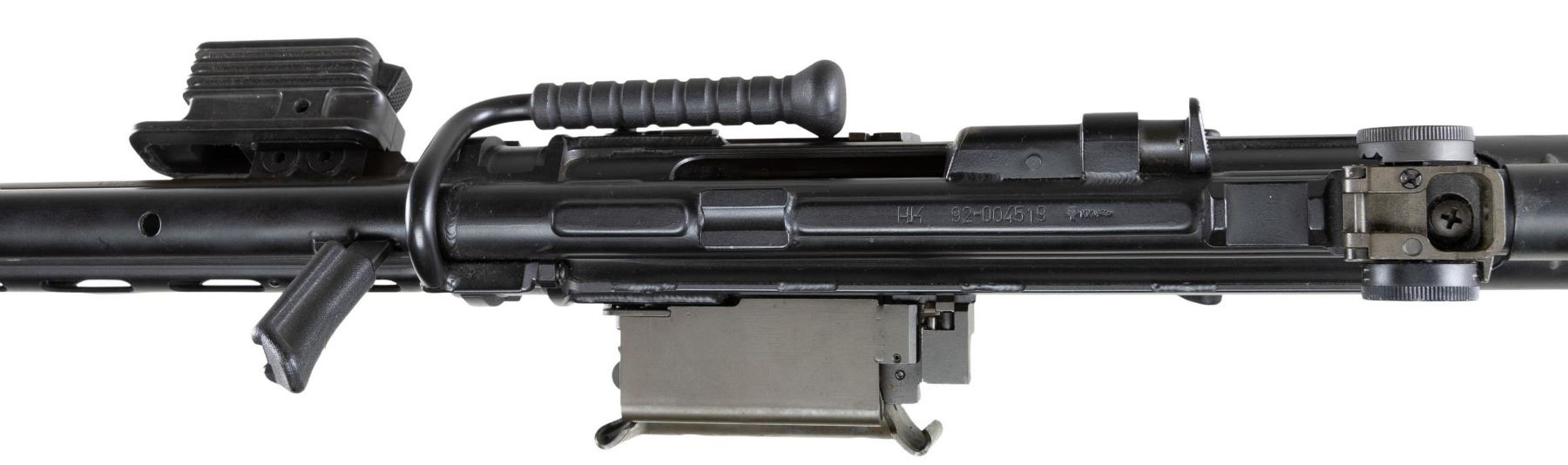 ***BIDDERS INTERESTED IN THIS LOT MUST CURRENTLY HOLD A TYPE 07, 08, 10, OR 11 FFL.*** Cal. 7.62x51. S# 92-004519. Bbl. 24" over flash hider with matching number and quick release. Top rail is marked "HK 92-004519 Eagle N KK antler proof". Bolt is marked "HK21E M13" with serrated thumbprint. Full, burst, semi, & safe ambidextrous selector. "IO" marked black composite stock with hard rubber serrated butt pad. Bipod and vertical foregrip. Feed mechanism is marked "HK21E" CONDITION: overall near excellent with only signs of light firing. Excellent bore with sharp rifling. POST 1986 DEALER SAMPLE MACHINE GUN WITH NO LAW (DEMO) LETTER REQUIRED TO TRANSFER. RESTRICTED REGISTRATION POSSESSION LIMITED TO CONTINUED COMPLIANCE WITH PROVISIONS OF PUBLIC LAW 99-308. IF YOU ARE AN 07, 08, 10, or 11 FFL/SOT YOU MAY TAKE TRANSFER OF THIS FIREARM UPON APPROVAL OF TRANSFER. PROVENANCE: Military Museum Collection of Shooters Outpost, Hooksett NH. THIS ITEM WILL BE AVAILABLE FOR PREVIEW BY APPOINTMENT AT THE SHOOTERS OUTPOST MUSEUM IN HOOKSETT, NH. TO SET UP AN APPOINTMENT, PLEASE CALL 207-453-2114. (50-1911/ZAL). MODERN CLASS III. $18,000-24,000.