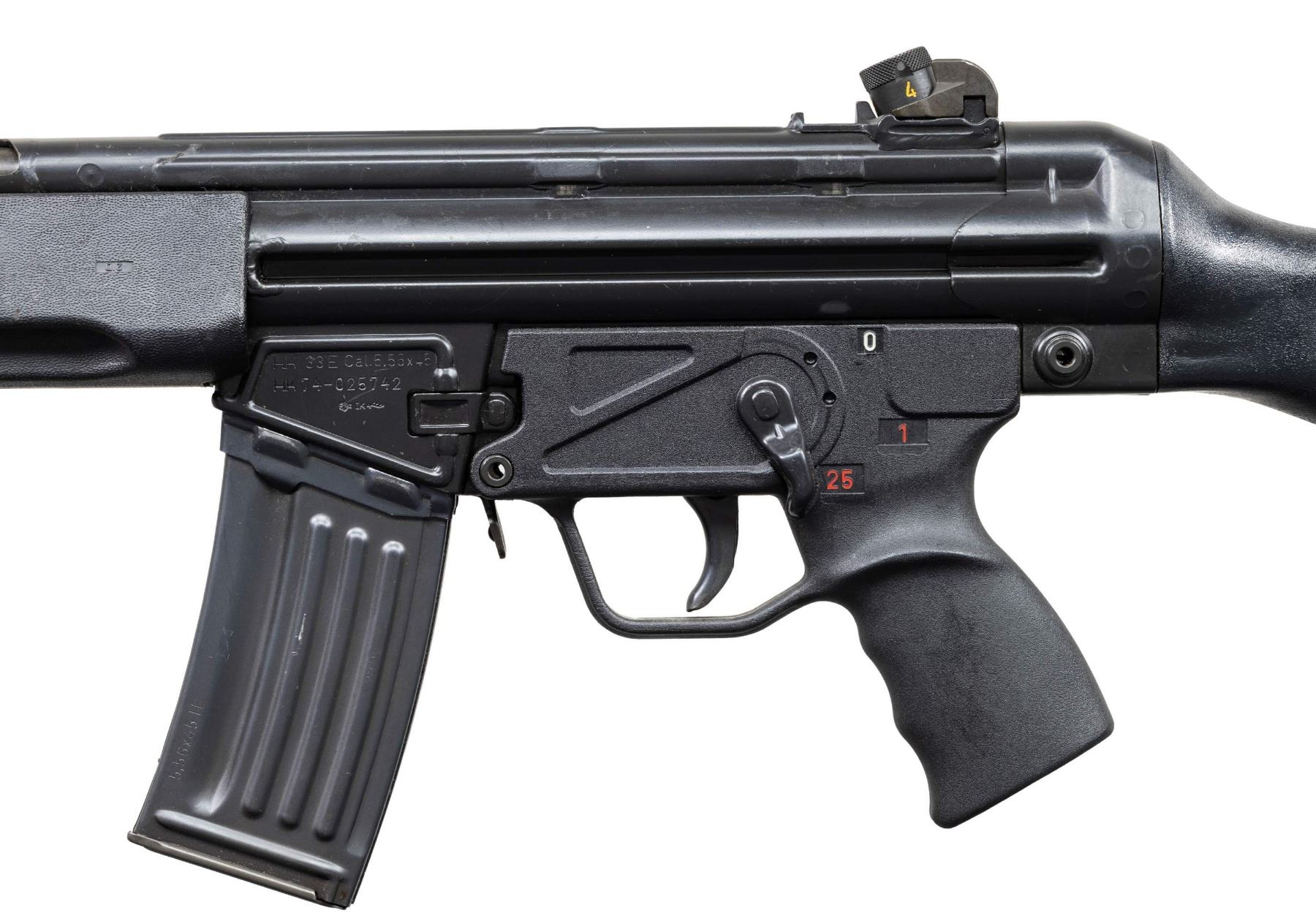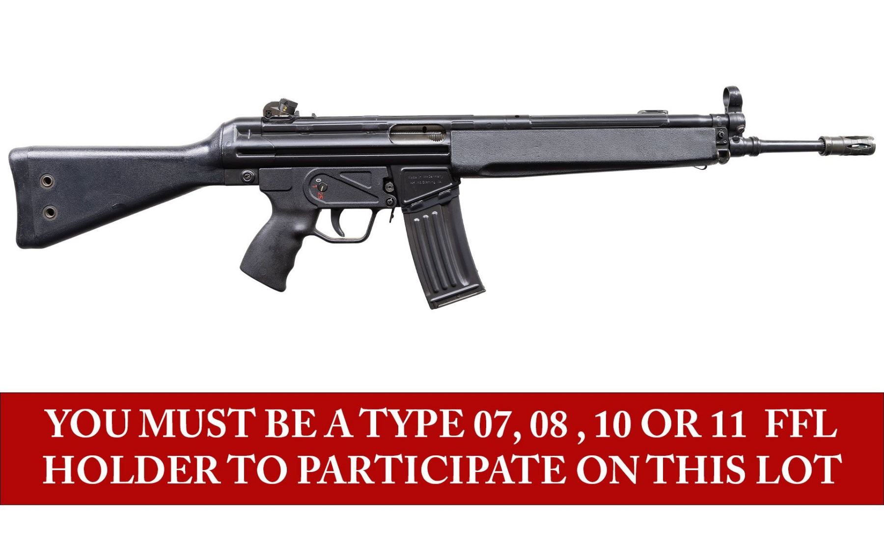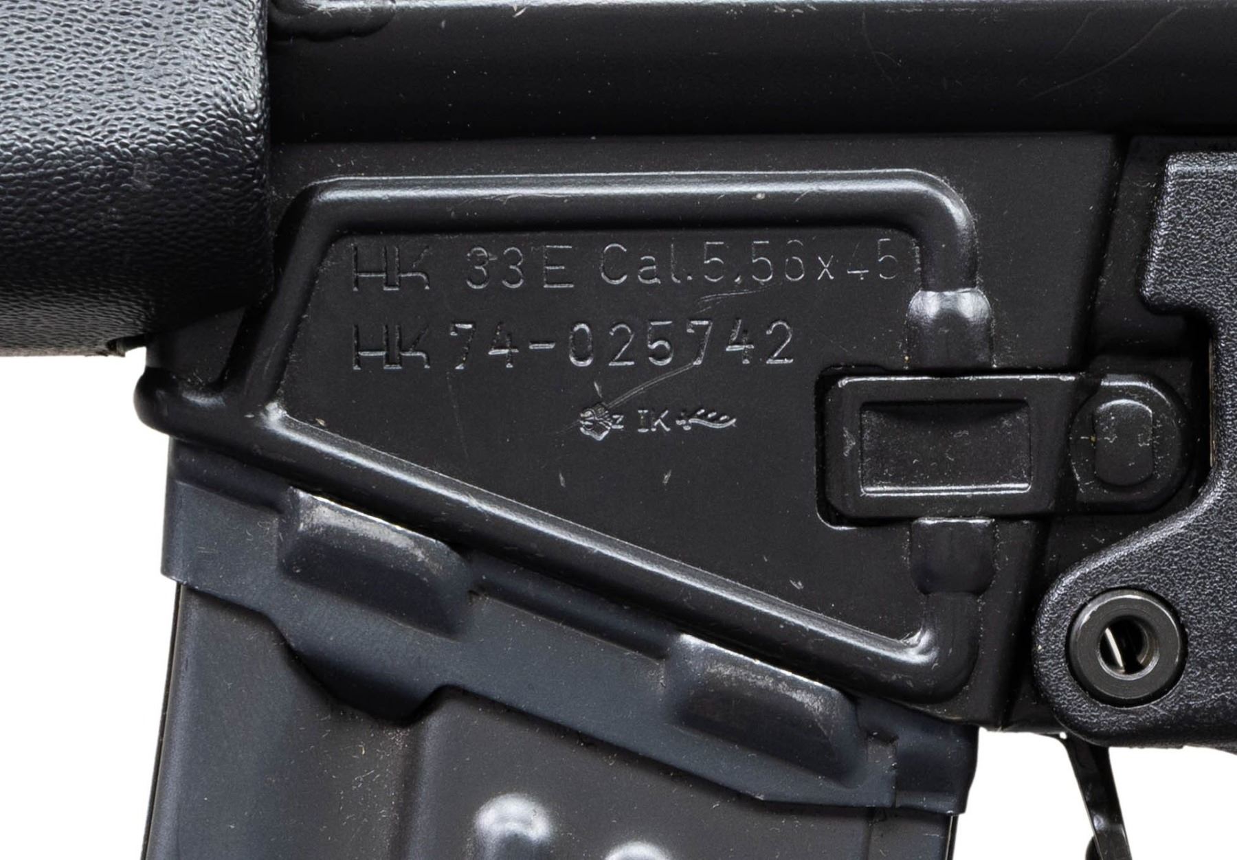 ***BIDDERS INTERESTED IN THIS LOT MUST CURRENTLY HOLD A TYPE 07, 08, 10, OR 11 FFL.*** Cal 5.56x45. S# 74-025742. Bbl 18" / pinned flash hider. Drum rear sight. Left magazine well Marked "HK 33E Cal.5.56x45/HK74/025742/Eagle NIK Antler Proof". Right side mag well is marked "Made in W. Germany /HK INC. Sterling VA". Paddle magazine release. Selector with 0,1,25 settings. MAGS: 1-25 rd factory mag. CONDITION: overall very good with some scattered scratches and handling marks. Very good bright bore with light wear to rifling. POST 1986 DEALER SAMPLE MACHINE GUN WITH NO LAW (DEMO) LETTER REQUIRED TO TRANSFER. RESTRICTED REGISTRATION POSSESSION LIMITED TO CONTINUED COMPLIANCE WITH PROVISIONS OF PUBLIC LAW 99-308. IF YOU ARE AN 07, 08, 10, or 11 FFL/SOT YOU MAY TAKE TRANSFER OF THIS FIREARM UPON APPROVAL OF TRANSFER. PROVENANCE: Military Museum Collection of Shooters Outpost, Hooksett NH. THIS ITEM WILL BE AVAILABLE FOR PREVIEW BY APPOINTMENT AT THE SHOOTERS OUTPOST MUSEUM IN HOOKSETT, NH. TO SET UP AN APPOINTMENT, PLEASE CALL 207-453-2114. (50-1908/ZAL). MODERN CLASS III. $3,000-5,000.