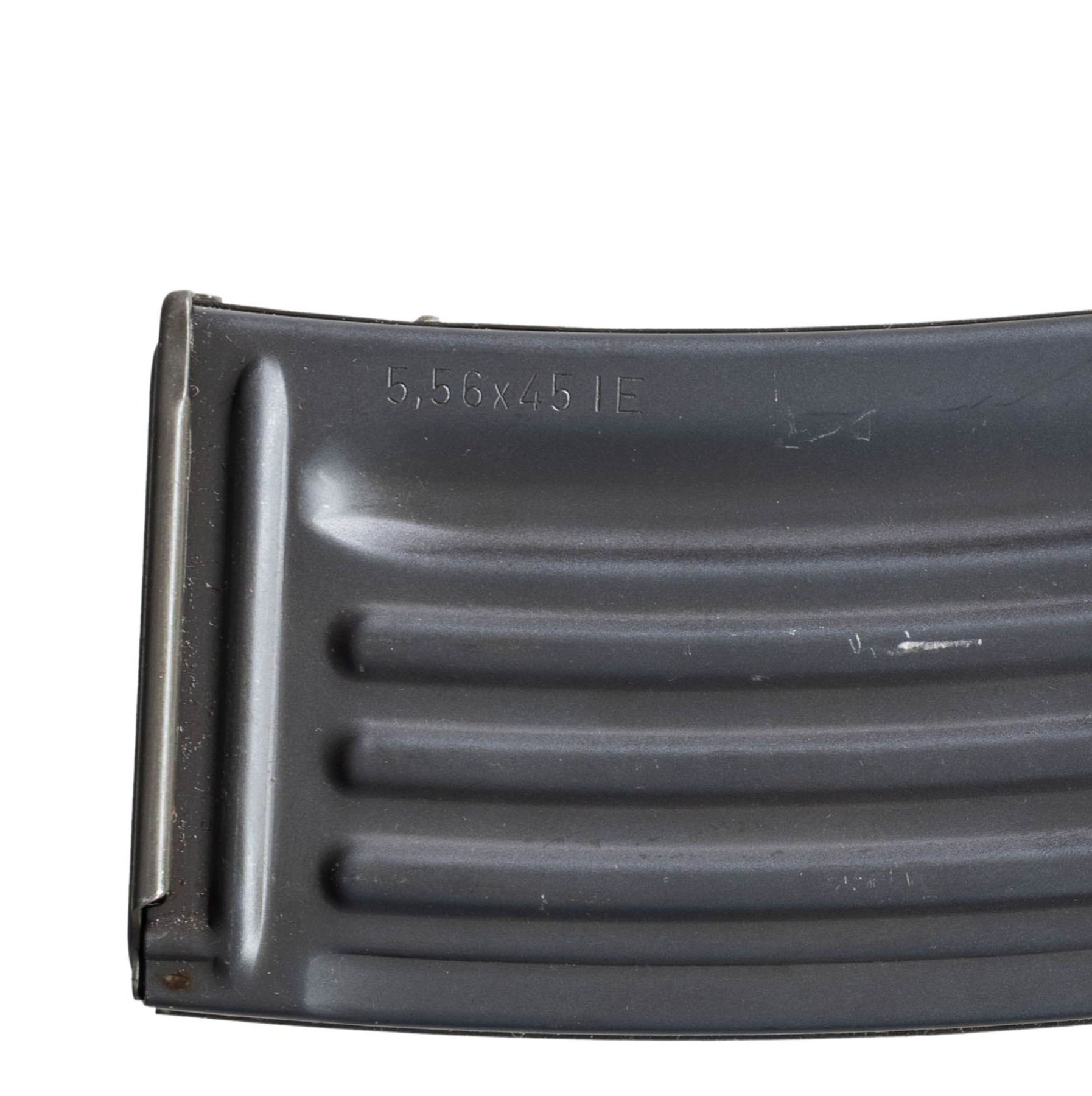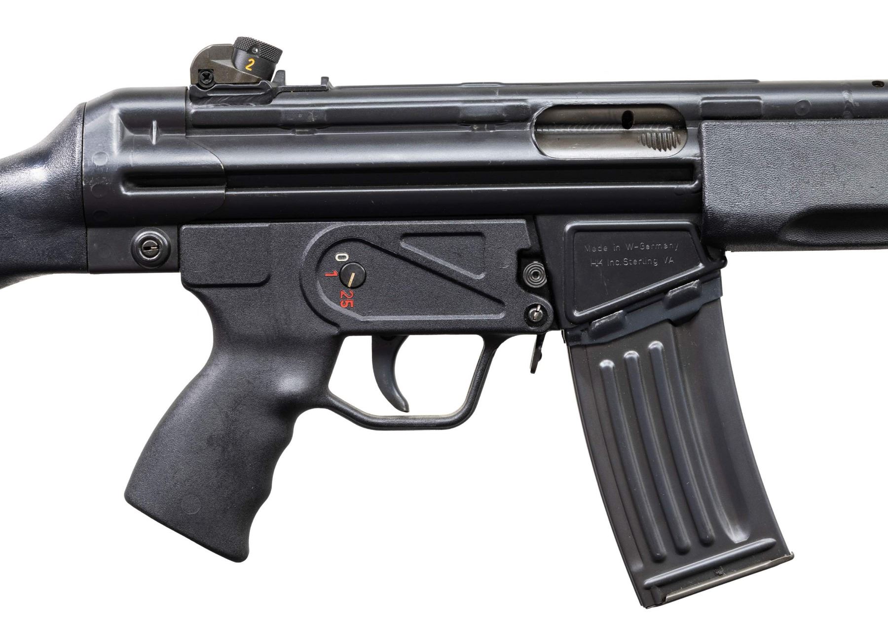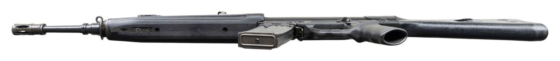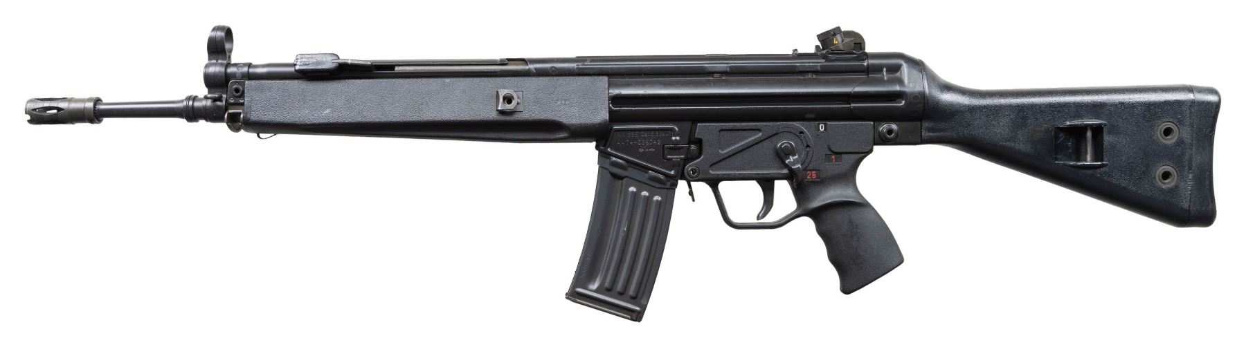 ***BIDDERS INTERESTED IN THIS LOT MUST CURRENTLY HOLD A TYPE 07, 08, 10, OR 11 FFL.*** Cal 5.56x45. S# 74-025742. Bbl 18" / pinned flash hider. Drum rear sight. Left magazine well Marked "HK 33E Cal.5.56x45/HK74/025742/Eagle NIK Antler Proof". Right side mag well is marked "Made in W. Germany /HK INC. Sterling VA". Paddle magazine release. Selector with 0,1,25 settings. MAGS: 1-25 rd factory mag. CONDITION: overall very good with some scattered scratches and handling marks. Very good bright bore with light wear to rifling. POST 1986 DEALER SAMPLE MACHINE GUN WITH NO LAW (DEMO) LETTER REQUIRED TO TRANSFER. RESTRICTED REGISTRATION POSSESSION LIMITED TO CONTINUED COMPLIANCE WITH PROVISIONS OF PUBLIC LAW 99-308. IF YOU ARE AN 07, 08, 10, or 11 FFL/SOT YOU MAY TAKE TRANSFER OF THIS FIREARM UPON APPROVAL OF TRANSFER. PROVENANCE: Military Museum Collection of Shooters Outpost, Hooksett NH. THIS ITEM WILL BE AVAILABLE FOR PREVIEW BY APPOINTMENT AT THE SHOOTERS OUTPOST MUSEUM IN HOOKSETT, NH. TO SET UP AN APPOINTMENT, PLEASE CALL 207-453-2114. (50-1908/ZAL). MODERN CLASS III. $3,000-5,000.