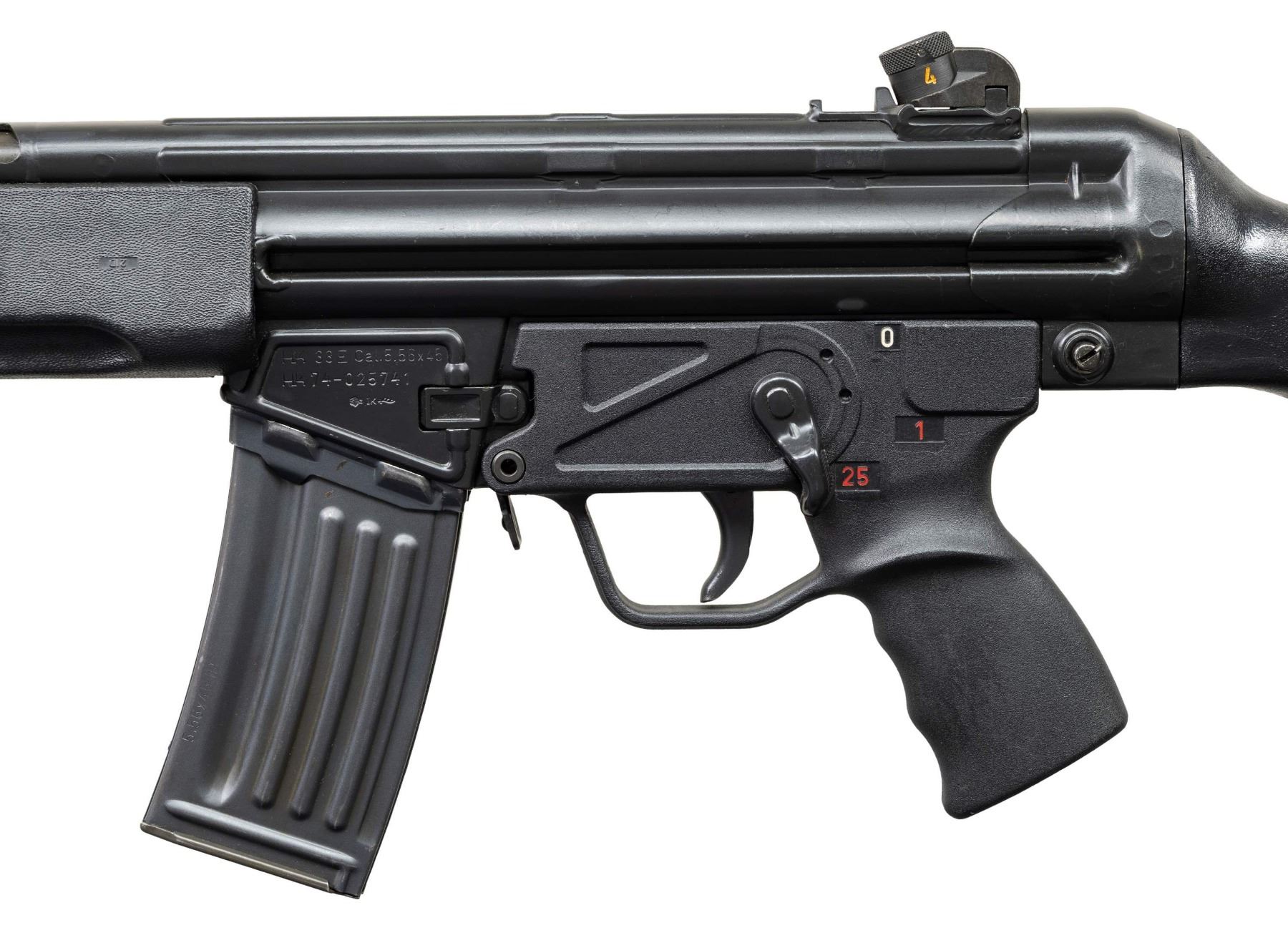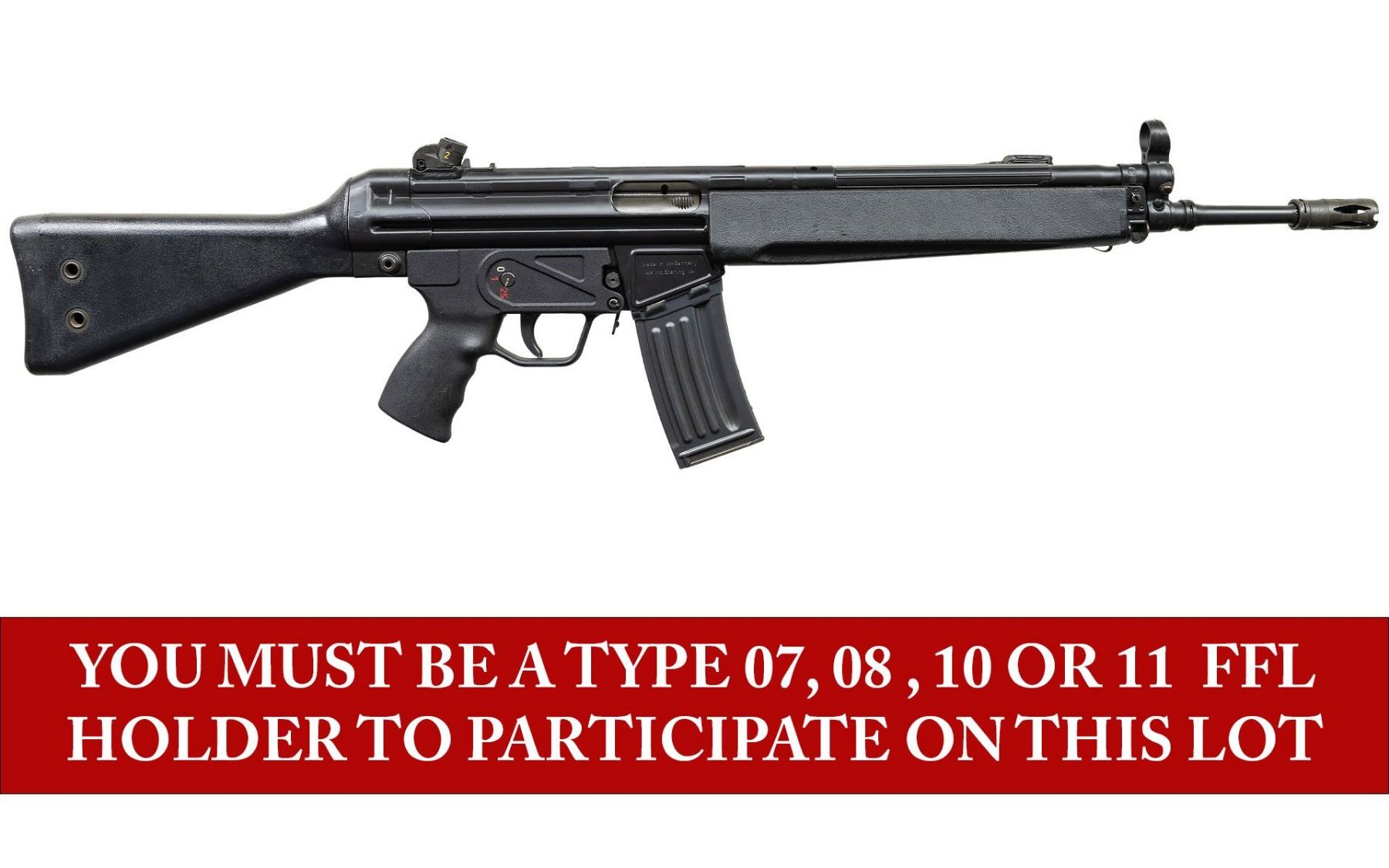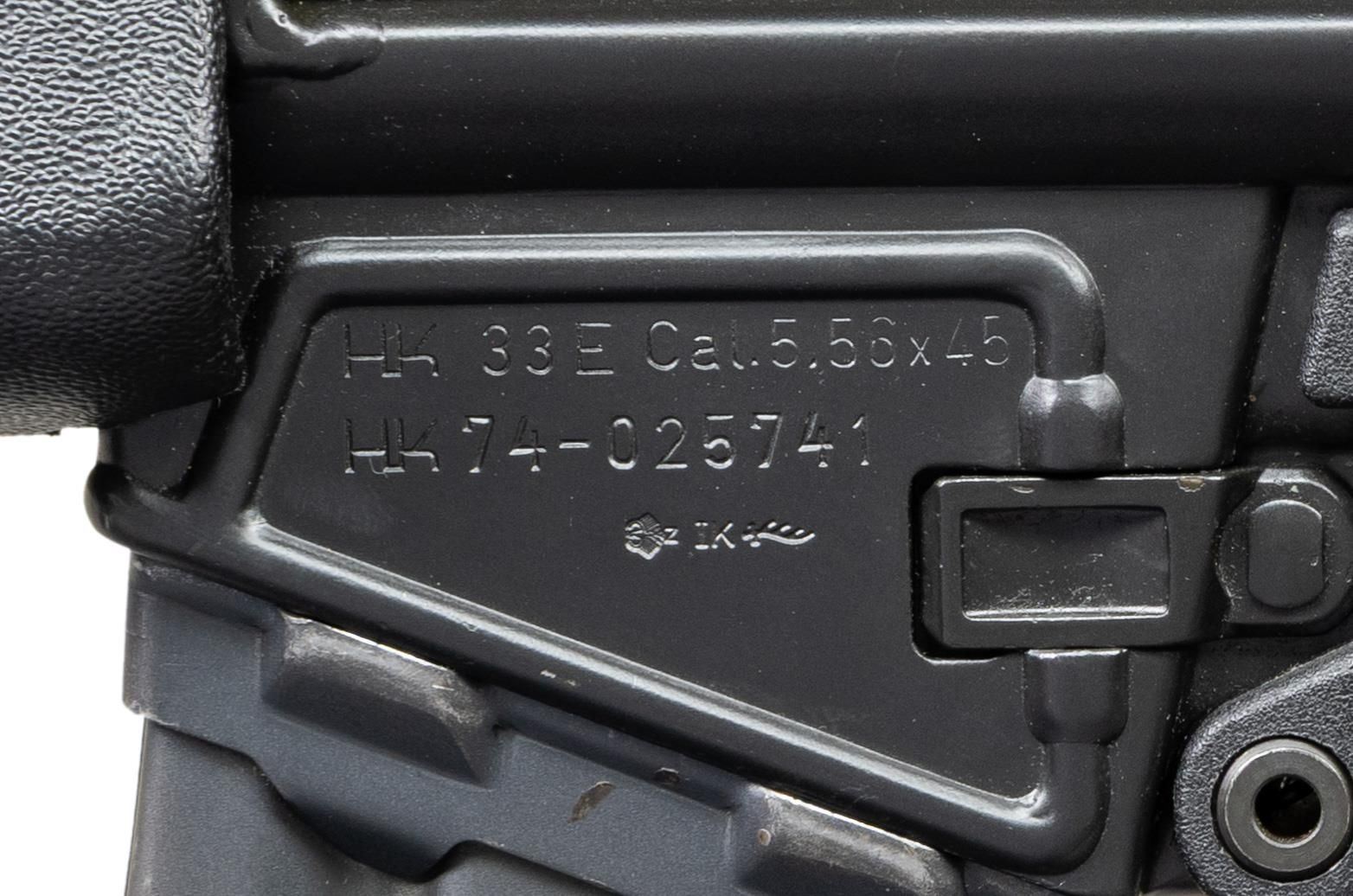 ***BIDDERS INTERESTED IN THIS LOT MUST CURRENTLY HOLD A TYPE 07, 08, 10, OR 11 FFL.*** Cal. 5.56x45. S# 74-025741. Bbl 17" over pinned flash suppressor. Drum rear sight. Left mag well marked "HK 33 E Cal.5.56x45/HK 74-025741/Eagle-NIK Antler Proof". Marked "Made in W-Germany/HK Inc. Sterling VA". Paddle and pushbutton mag release. 0,1 and 25 position selector. CONDITION: overall fine with a few scattered mild scratches and handling marks. Stock has a few moderate handling marks at forearm. Bright bore with very good rifling. POST 1986 DEALER SAMPLE MACHINE GUN WITH NO LAW (DEMO) LETTER REQUIRED TO TRANSFER. RESTRICTED REGISTRATION POSSESSION LIMITED TO CONTINUED COMPLIANCE WITH PROVISIONS OF PUBLIC LAW 99-308. IF YOU ARE AN 07, 08, 10, or 11 FFL/SOT YOU MAY TAKE TRANSFER OF THIS FIREARM UPON APPROVAL OF TRANSFER. PROVENANCE: Military Museum Collection of Shooters Outpost, Hooksett NH. THIS ITEM WILL BE AVAILABLE FOR PREVIEW BY APPOINTMENT AT THE SHOOTERS OUTPOST MUSEUM IN HOOKSETT, NH. TO SET UP AN APPOINTMENT, PLEASE CALL 207-453-2114. (50-1910/ZAL). MODERN CLASS III. $3,000-5,000.