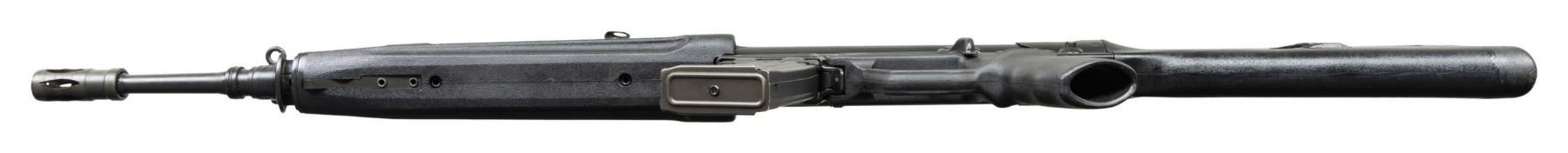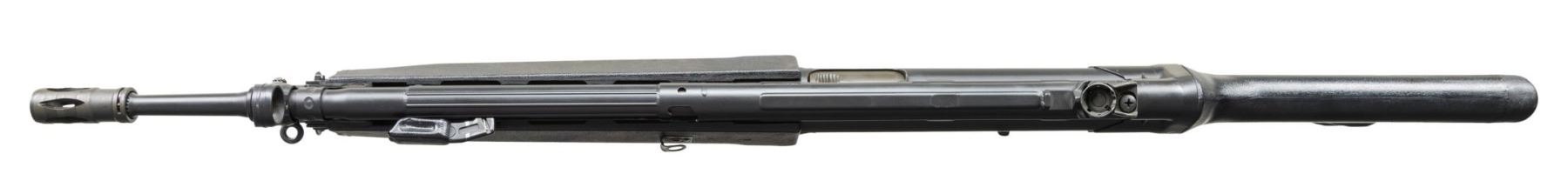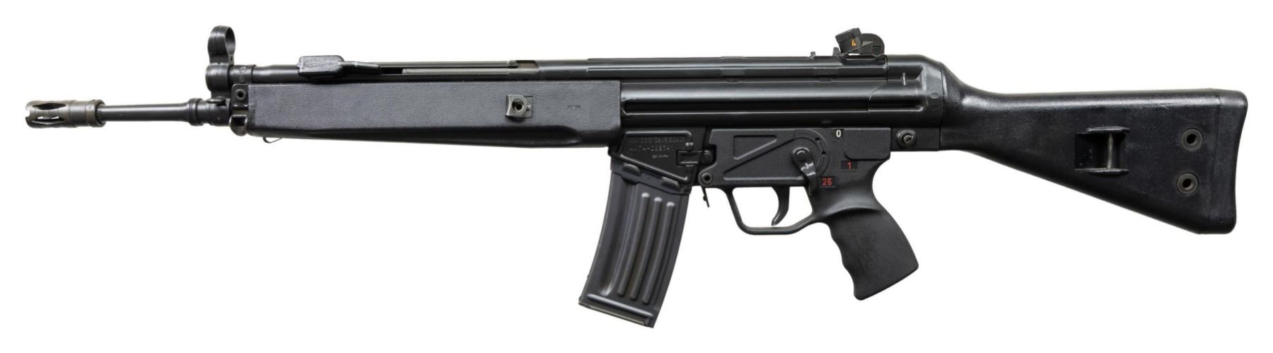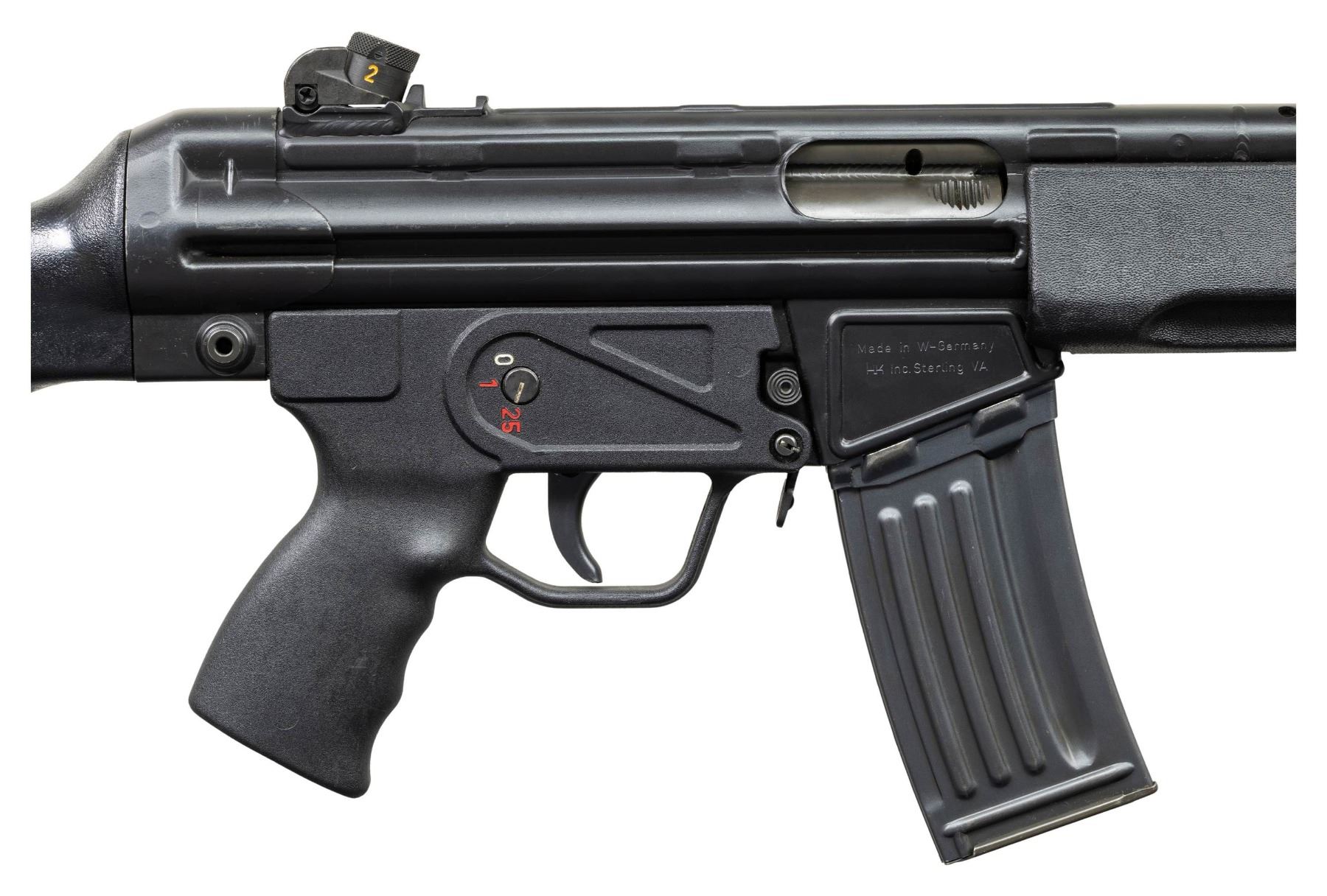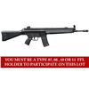 ***BIDDERS INTERESTED IN THIS LOT MUST CURRENTLY HOLD A TYPE 07, 08, 10, OR 11 FFL.*** Cal. 5.56x45. S# 74-025741. Bbl 17" over pinned flash suppressor. Drum rear sight. Left mag well marked "HK 33 E Cal.5.56x45/HK 74-025741/Eagle-NIK Antler Proof". Marked "Made in W-Germany/HK Inc. Sterling VA". Paddle and pushbutton mag release. 0,1 and 25 position selector. CONDITION: overall fine with a few scattered mild scratches and handling marks. Stock has a few moderate handling marks at forearm. Bright bore with very good rifling. POST 1986 DEALER SAMPLE MACHINE GUN WITH NO LAW (DEMO) LETTER REQUIRED TO TRANSFER. RESTRICTED REGISTRATION POSSESSION LIMITED TO CONTINUED COMPLIANCE WITH PROVISIONS OF PUBLIC LAW 99-308. IF YOU ARE AN 07, 08, 10, or 11 FFL/SOT YOU MAY TAKE TRANSFER OF THIS FIREARM UPON APPROVAL OF TRANSFER. PROVENANCE: Military Museum Collection of Shooters Outpost, Hooksett NH. THIS ITEM WILL BE AVAILABLE FOR PREVIEW BY APPOINTMENT AT THE SHOOTERS OUTPOST MUSEUM IN HOOKSETT, NH. TO SET UP AN APPOINTMENT, PLEASE CALL 207-453-2114. (50-1910/ZAL). MODERN CLASS III. $3,000-5,000.