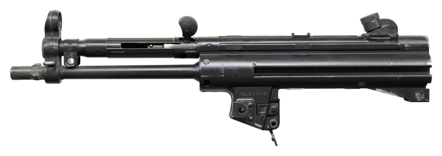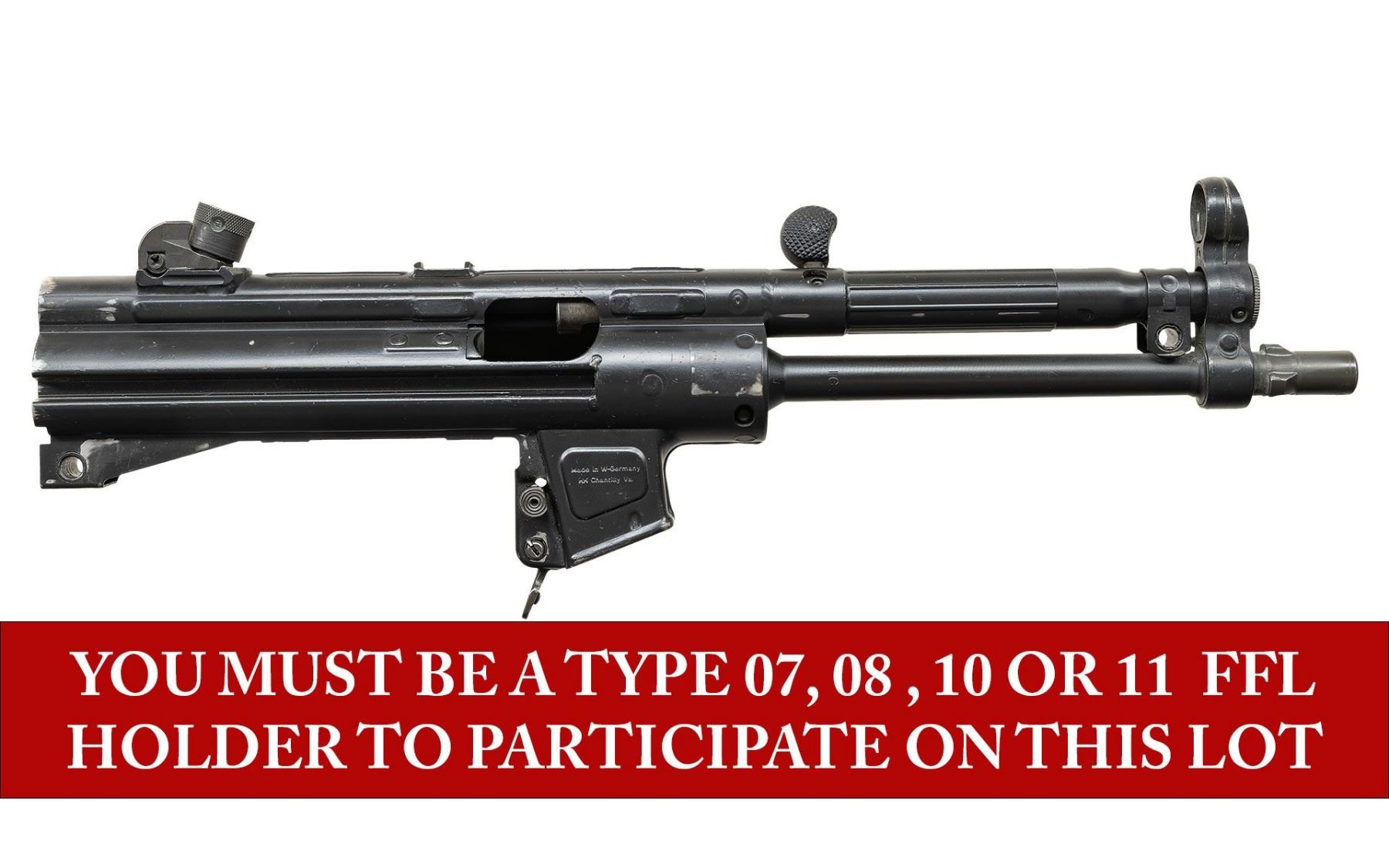 ***BIDDERS INTERESTED IN THIS LOT MUST CURRENTLY HOLD A TYPE 07, 08, 10, OR 11 FFL.*** Cal 9x19. S# C324982. Manufactured in West Germany with Eagle-NIG Antler proof on top rib. Charging handle, rear sight, magazine release and locking pin present. No other mechanical components. CONDITION: overall good with scattered handling marks, minor scratches and finish wear. POST 1986 DEALER SAMPLE MACHINE GUN WITH NO LAW (DEMO) LETTER REQUIRED TO TRANSFER. RESTRICTED REGISTRATION POSSESSION LIMITED TO CONTINUED COMPLIANCE WITH PROVISIONS OF PUBLIC LAW 99-308. IF YOU ARE AN 07, 08, 10, or 11 FFL/SOT YOU MAY TAKE TRANSFER OF THIS FIREARM UPON APPROVAL OF TRANSFER. PROVENANCE: Military Museum Collection of Shooters Outpost, Hooksett NH. THIS ITEM WILL BE AVAILABLE FOR PREVIEW BY APPOINTMENT AT THE SHOOTERS OUTPOST MUSEUM IN HOOKSETT, NH. TO SET UP AN APPOINTMENT, PLEASE CALL 207-453-2114. (50-1893/ZAL). MODERN CLASS III. $600-1,200.