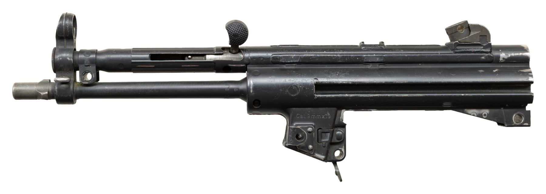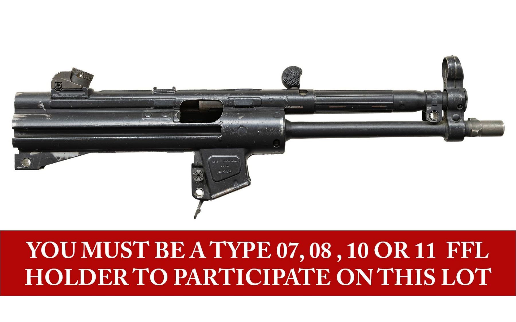 ***BIDDERS INTERESTED IN THIS LOT MUST CURRENTLY HOLD A TYPE 07, 08, 10, OR 11 FFL.*** Cal 9x19. S# 62-344690. Bbl 9". Made in West Germany. Top rib is marked with the manufacturer, model, serial number and Eagle NIK antler proof. Includes charging handle, rear sight and magazine release. No other mechanical components. CONDITION: overall good with numerous scattered handling marks, scratches and some high edge wear. Bore with light rifling. POST 1986 DEALER SAMPLE MACHINE GUN WITH NO LAW (DEMO) LETTER REQUIRED TO TRANSFER. RESTRICTED REGISTRATION POSSESSION LIMITED TO CONTINUED COMPLIANCE WITH PROVISIONS OF PUBLIC LAW 99-308. IF YOU ARE AN 07, 08, 10, or 11 FFL/SOT YOU MAY TAKE TRANSFER OF THIS FIREARM UPON APPROVAL OF TRANSFER. PROVENANCE: Military Museum Collection of Shooters Outpost, Hooksett NH. THIS ITEM WILL BE AVAILABLE FOR PREVIEW BY APPOINTMENT AT THE SHOOTERS OUTPOST MUSEUM IN HOOKSETT, NH. TO SET UP AN APPOINTMENT, PLEASE CALL 207-453-2114. (50-1881/ZAL). MODERN CLASS III. $600-1,200.