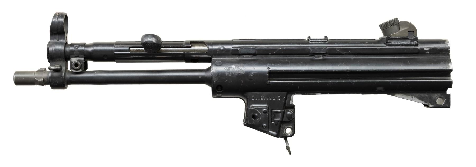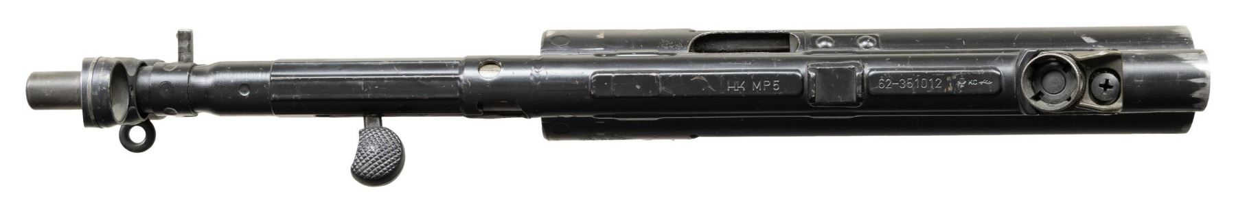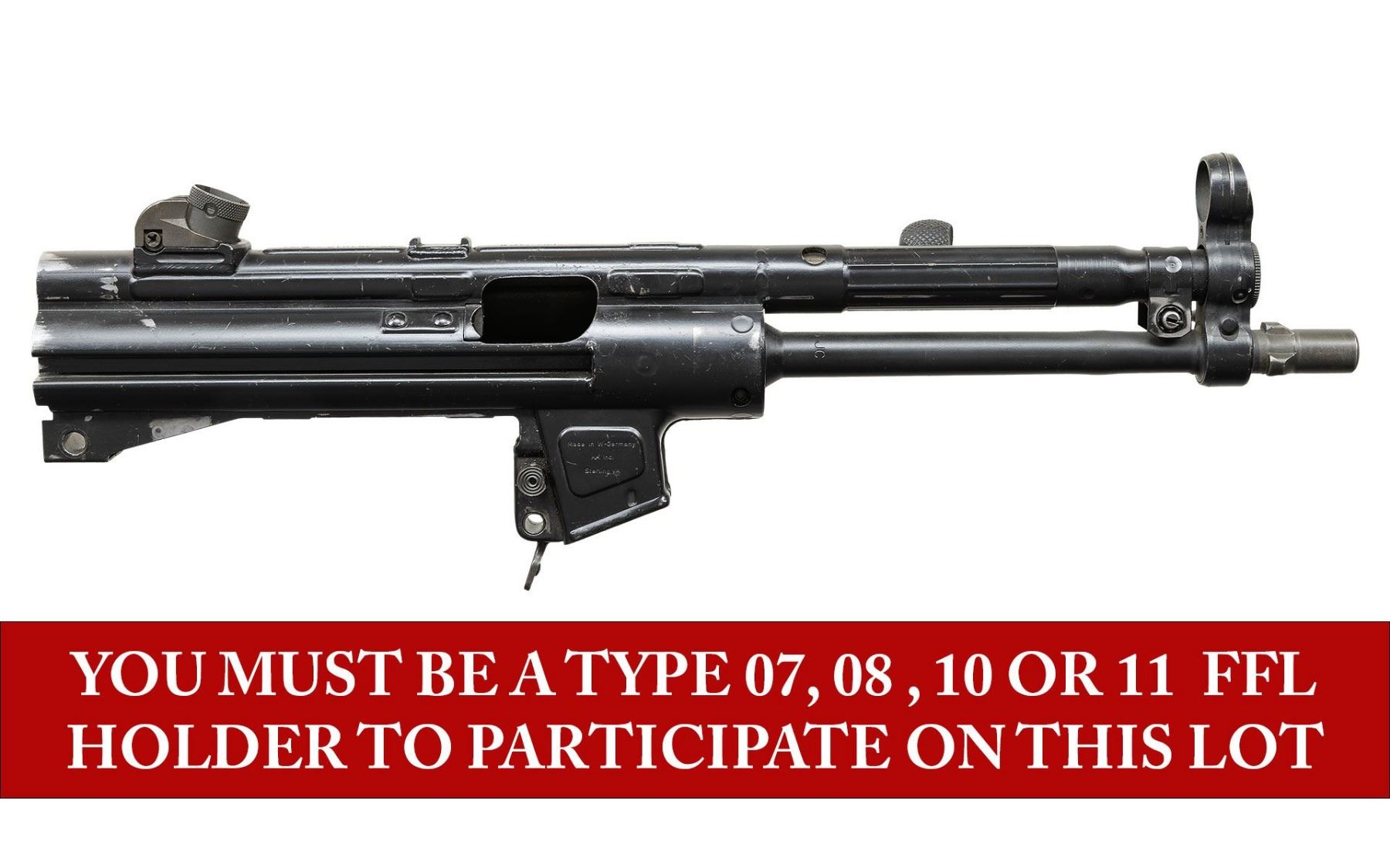 ***BIDDERS INTERESTED IN THIS LOT MUST CURRENTLY HOLD A TYPE 07, 08, 10, OR 11 FFL.*** Cal 9x19. S# 62-351012. Made in West Germany. Top rib is marked with "HK, S# and Eagle N AC antler proof". Includes charging handle, rear sight and magazine release. CONDITION: overall fair to good metal finish with numerous scattered light handling marks and scratches. Poor bore with wear, frosting and pitting, there is also a bulge 4" from the muzzle. POST 1986 DEALER SAMPLE MACHINE GUN WITH NO LAW (DEMO) LETTER REQUIRED TO TRANSFER. RESTRICTED REGISTRATION POSSESSION LIMITED TO CONTINUED COMPLIANCE WITH PROVISIONS OF PUBLIC LAW 99-308. IF YOU ARE AN 07, 08, 10, or 11 FFL/SOT YOU MAY TAKE TRANSFER OF THIS FIREARM UPON APPROVAL OF TRANSFER. PROVENANCE: Military Museum Collection of Shooters Outpost, Hooksett NH. THIS ITEM WILL BE AVAILABLE FOR PREVIEW BY APPOINTMENT AT THE SHOOTERS OUTPOST MUSEUM IN HOOKSETT, NH. TO SET UP AN APPOINTMENT, PLEASE CALL 207-453-2114. (50-1894/ZAL). MODERN CLASS III. $600-1,200.
