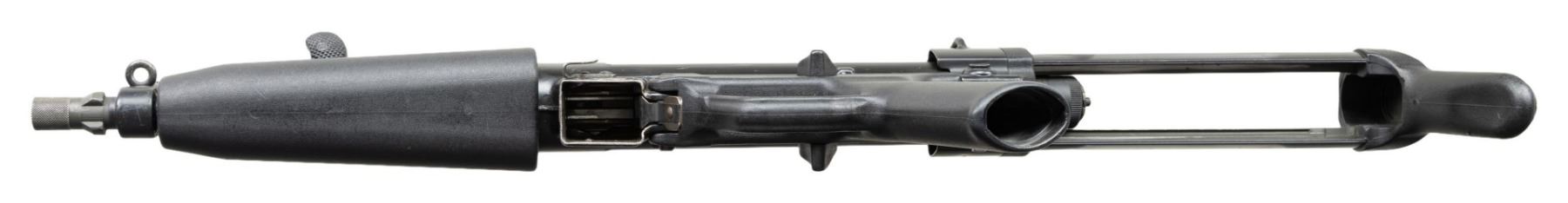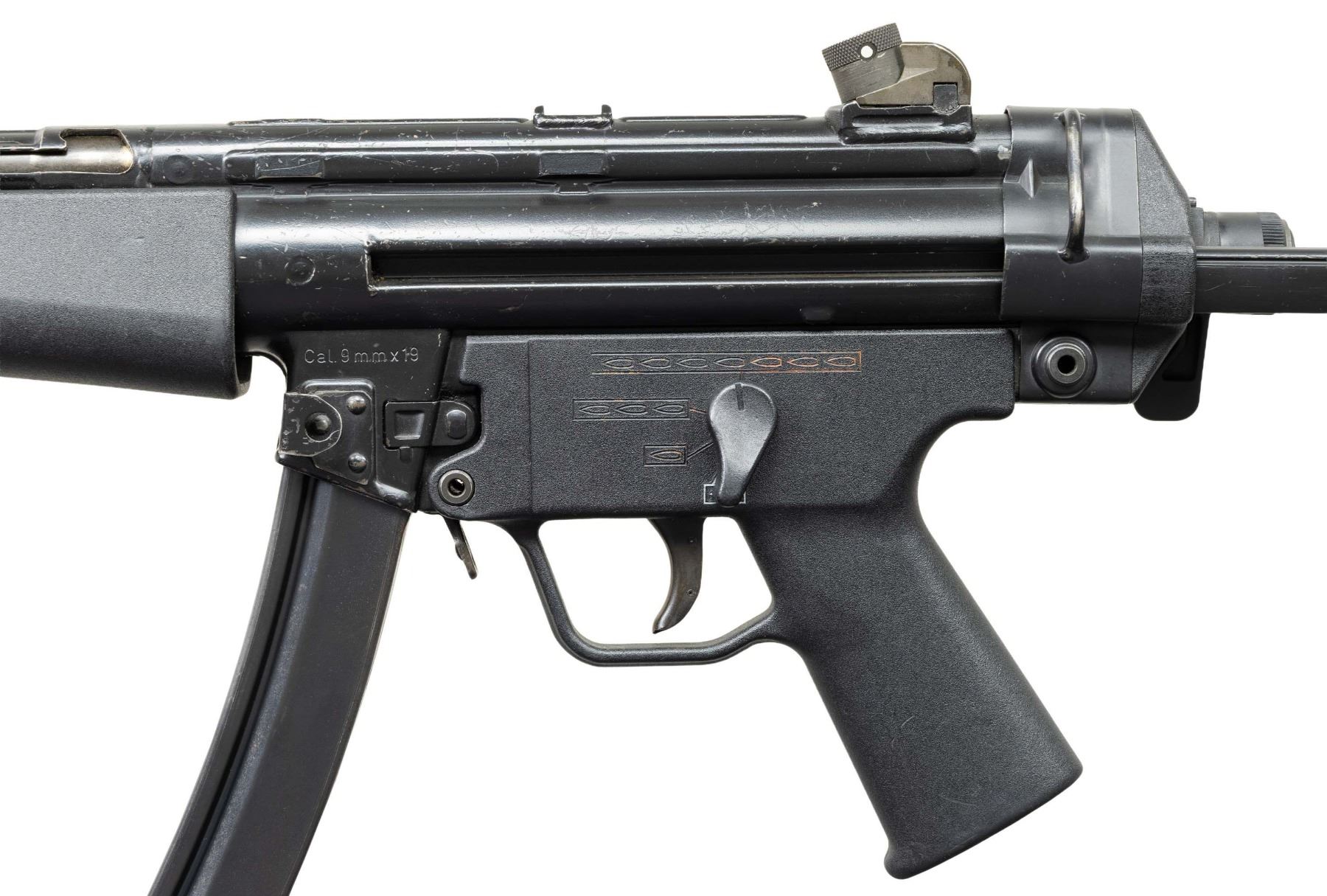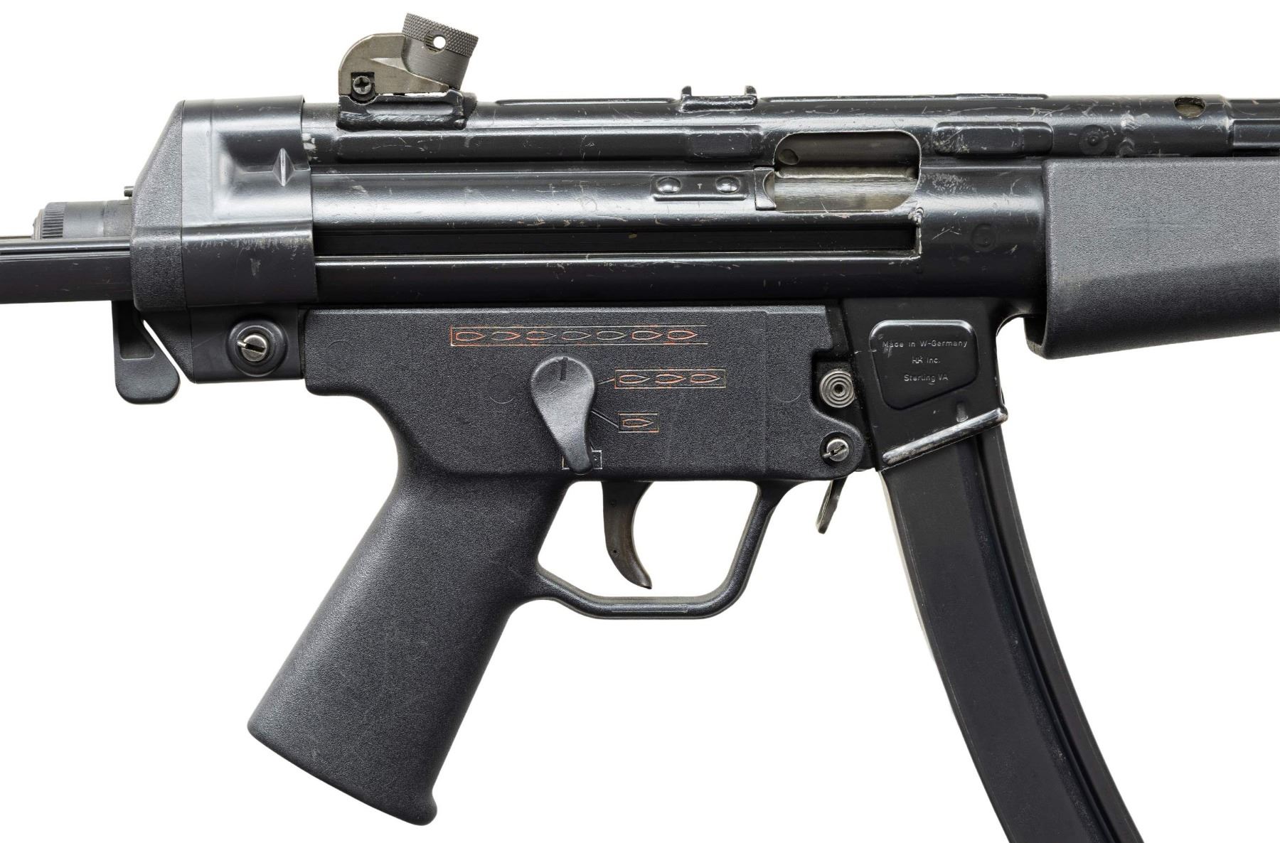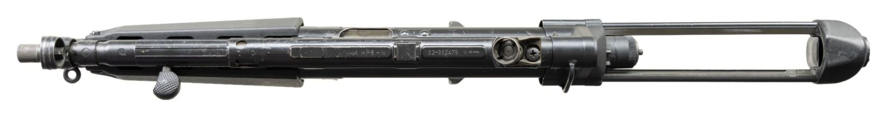 ***BIDDERS INTERESTED IN THIS LOT MUST CURRENTLY HOLD A TYPE 07, 08, 10, OR 11 FFL.*** Cal 9x19mm. S# 62-352479. Bbl 9" threaded with knurled thread protector. Top rail is marked "HK MP5-N Serial number and Eagle NAC Antler Proof". Right mag well is marked "Made in W-Germany/HK Inc/Sterling VA". Paddle and pushbutton mag release. Full, burst and safe ambidextrous selector. Telescopic stock. MAGS: 1-30 rd. CONDITION: metal finish has numerous scratches and some flaking finish. Shiny bore with light wear to rifling and scattered pitting. POST 1986 DEALER SAMPLE MACHINE GUN WITH NO LAW (DEMO) LETTER REQUIRED TO TRANSFER. RESTRICTED REGISTRATION POSSESSION LIMITED TO CONTINUED COMPLIANCE WITH PROVISIONS OF PUBLIC LAW 99-308. IF YOU ARE AN 07, 08, 10, or 11 FFL/SOT YOU MAY TAKE TRANSFER OF THIS FIREARM UPON APPROVAL OF TRANSFER. PROVENANCE: Military Museum Collection of Shooters Outpost, Hooksett NH. THIS ITEM WILL BE AVAILABLE FOR PREVIEW BY APPOINTMENT AT THE SHOOTERS OUTPOST MUSEUM IN HOOKSETT, NH. TO SET UP AN APPOINTMENT, PLEASE CALL 207-453-2114. (50-1926/ZAL). MODERN CLASS III. $6,000-8,000.