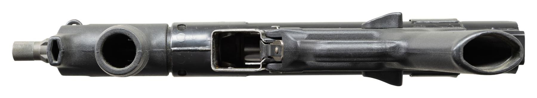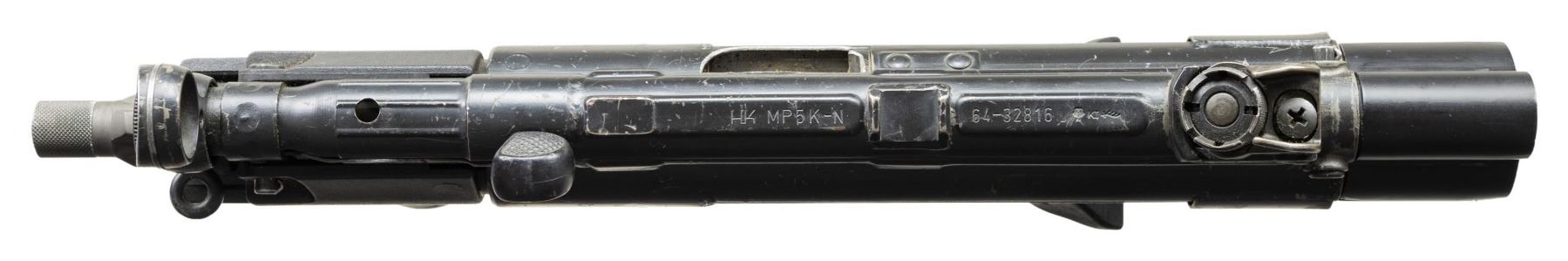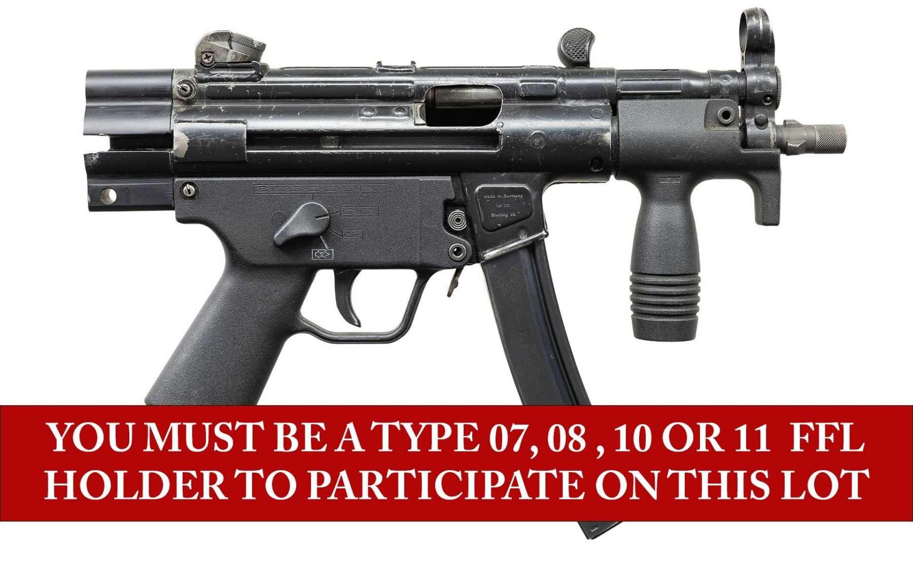 ***BIDDERS INTERESTED IN THIS LOT MUST CURRENTLY HOLD A TYPE 07, 08, 10, OR 11 FFL.*** Cal 9x19mm. S# 64-32816. Bbl 6" threaded with knurled protector. Top rail is marked "HK MPK-N, Serial Number and Eagle NKI Antler Proof". Right mag well is marked "Made in Germany/HK Inc/Sterling VA". Full, burst, semi and safe ambidextrous selector. Paddle and pushbutton mag release. Drum rear sight. No stock. ID marked vertical foregrip. MAGS: 1-30 rd. CONDITION: metal surfaces have flaking finish with scattered handling marks and light scratches. Bare bore with frosting and light wear to rifling. POST 1986 DEALER SAMPLE MACHINE GUN WITH NO LAW (DEMO) LETTER REQUIRED TO TRANSFER. RESTRICTED REGISTRATION POSSESSION LIMITED TO CONTINUED COMPLIANCE WITH PROVISIONS OF PUBLIC LAW 99-308. IF YOU ARE AN 07, 08, 10, or 11 FFL/SOT YOU MAY TAKE TRANSFER OF THIS FIREARM UPON APPROVAL OF TRANSFER. PROVENANCE: Military Museum Collection of Shooters Outpost, Hooksett NH. THIS ITEM WILL BE AVAILABLE FOR PREVIEW BY APPOINTMENT AT THE SHOOTERS OUTPOST MUSEUM IN HOOKSETT, NH. TO SET UP AN APPOINTMENT, PLEASE CALL 207-453-2114. (50-1928/ZAL). MODERN CLASS III. $4,000-7,000.