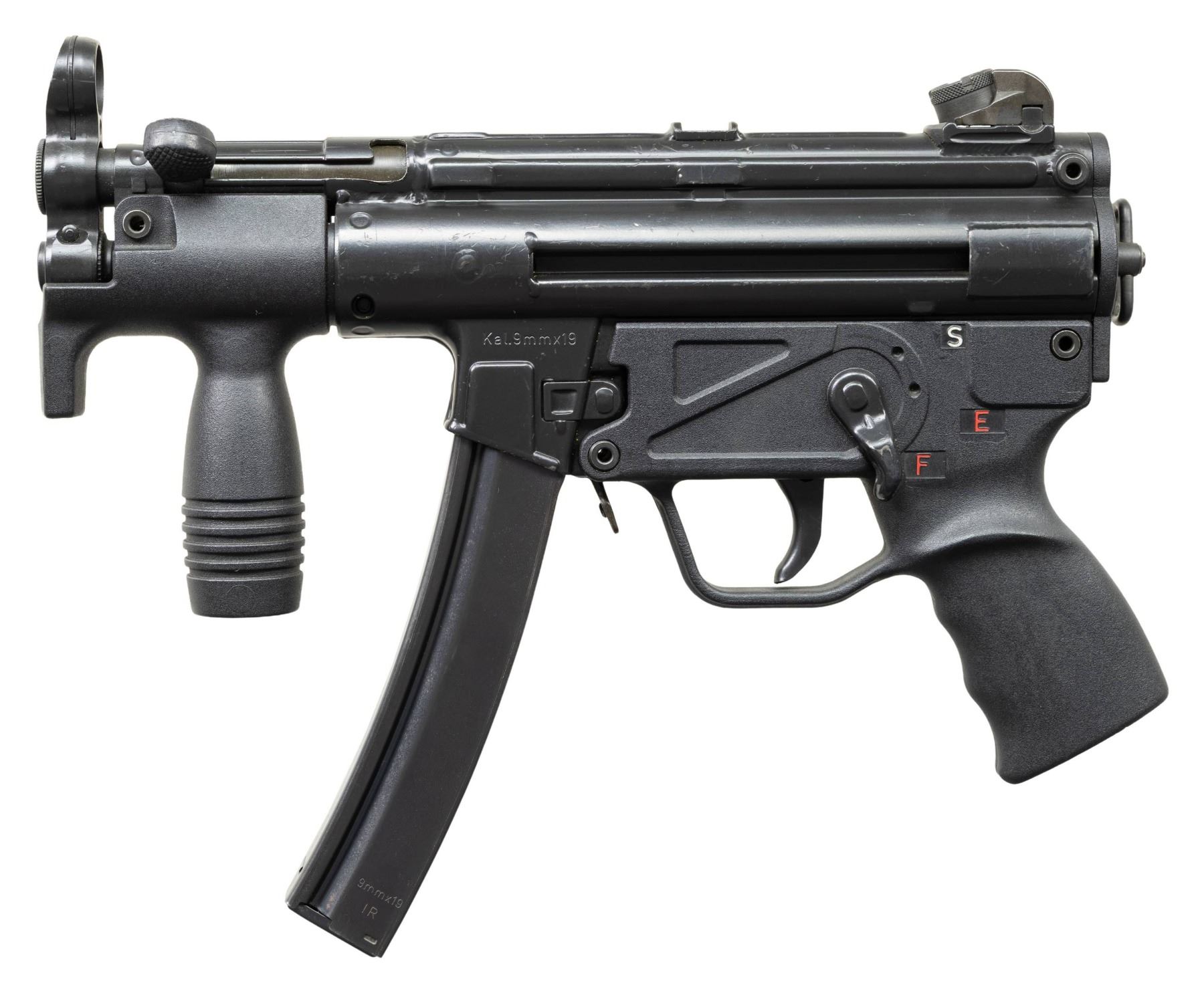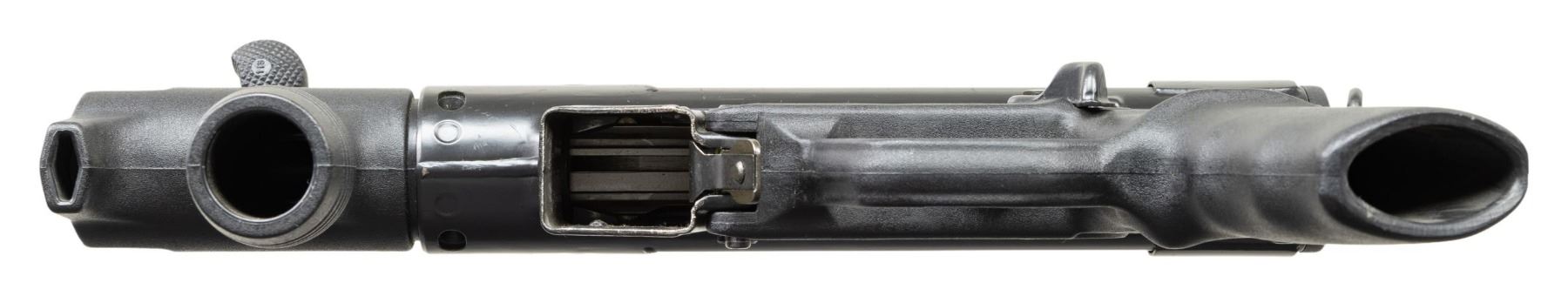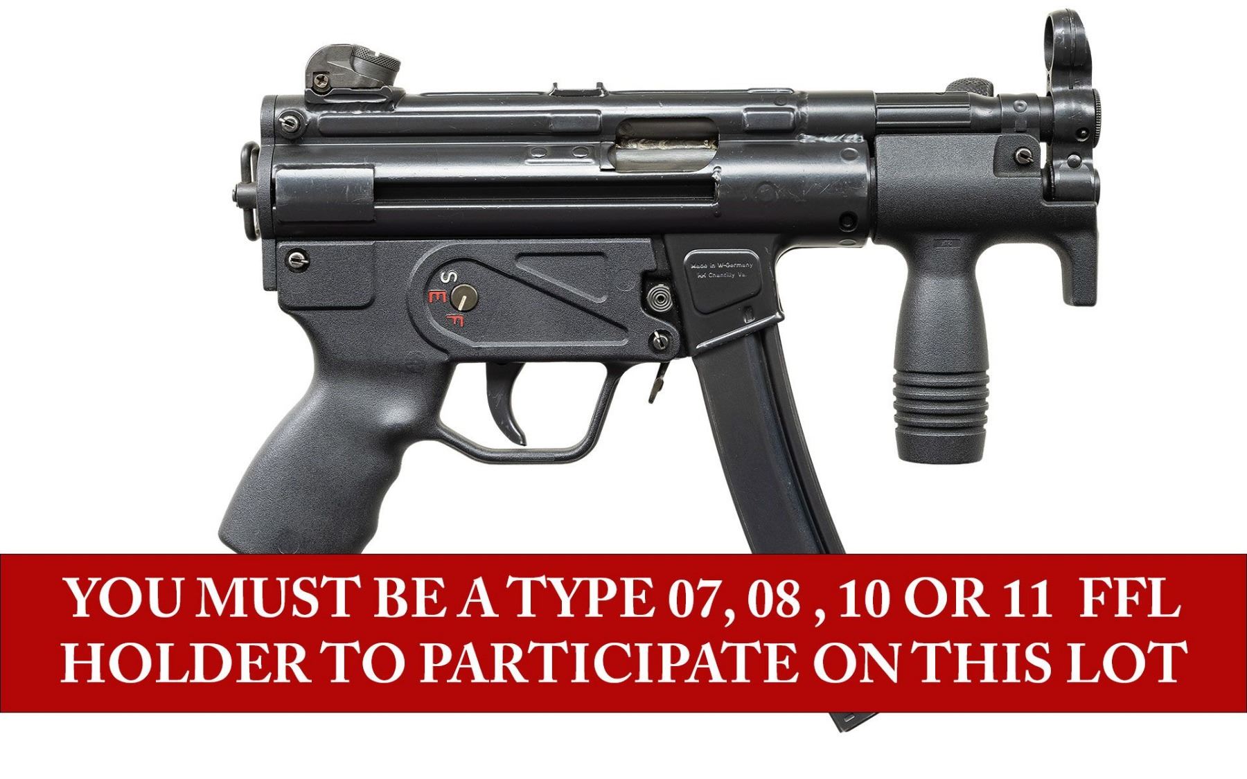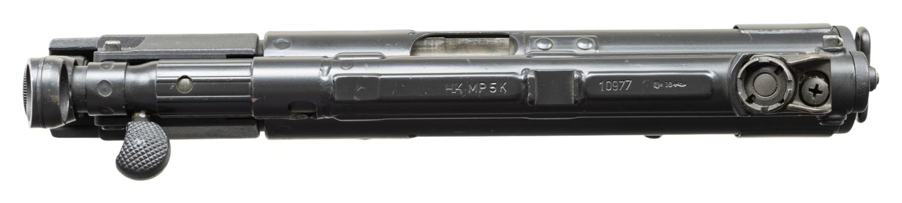 ***BIDDERS INTERESTED IN THIS LOT MUST CURRENTLY HOLD A TYPE 07, 08, 10, OR 11 FFL.*** Cal. 9x19mm. S# 10977. Bbl 5". Top rail marked "HK MP5K, Serial number, Eagle NIG Antler Proof". Drum rear sight. Right mag well marked "Made in W-Germany/HK Chantilly VA.". Left mag well "CAL.9x19mm". S, E, F selector. Paddle and pushbutton mag release, "21S" marked vertical foregrip. MAGS: 1-30 rd. CONDITION: overall very good with a few scattered scratches and light handling marks. Bright shiny bore with lightly worn rifling. POST 1986 DEALER SAMPLE MACHINE GUN WITH NO LAW (DEMO) LETTER REQUIRED TO TRANSFER. RESTRICTED REGISTRATION POSSESSION LIMITED TO CONTINUED COMPLIANCE WITH PROVISIONS OF PUBLIC LAW 99-308. IF YOU ARE AN 07, 08, 10, or 11 FFL/SOT YOU MAY TAKE TRANSFER OF THIS FIREARM UPON APPROVAL OF TRANSFER. PROVENANCE: Military Museum Collection of Shooters Outpost, Hooksett NH. THIS ITEM WILL BE AVAILABLE FOR PREVIEW BY APPOINTMENT AT THE SHOOTERS OUTPOST MUSEUM IN HOOKSETT, NH. TO SET UP AN APPOINTMENT, PLEASE CALL 207-453-2114. (50-1927/ZAL). MODERN CLASS III. $4,000-7,000.