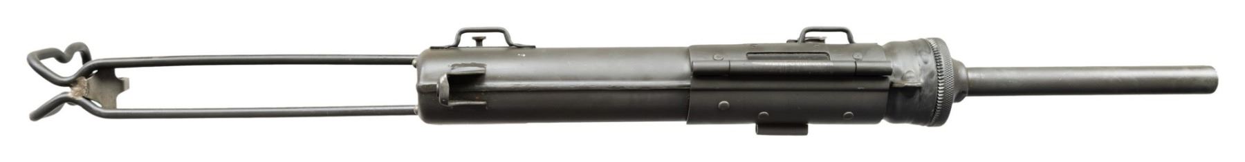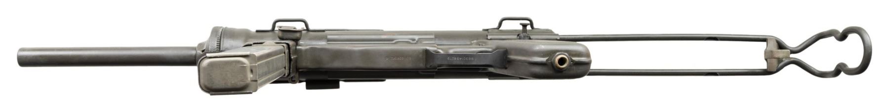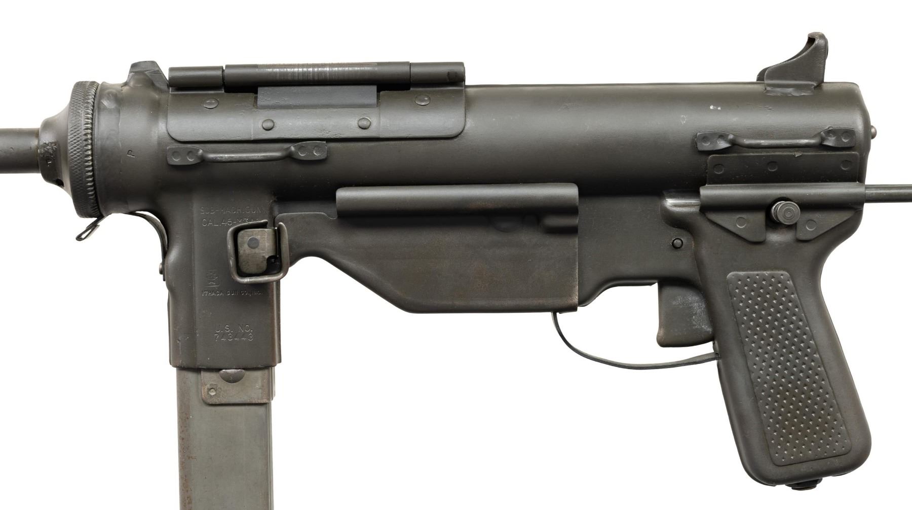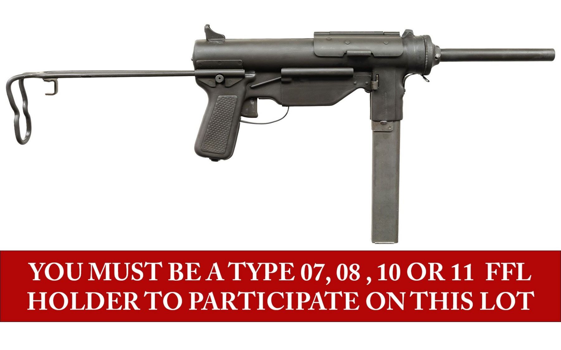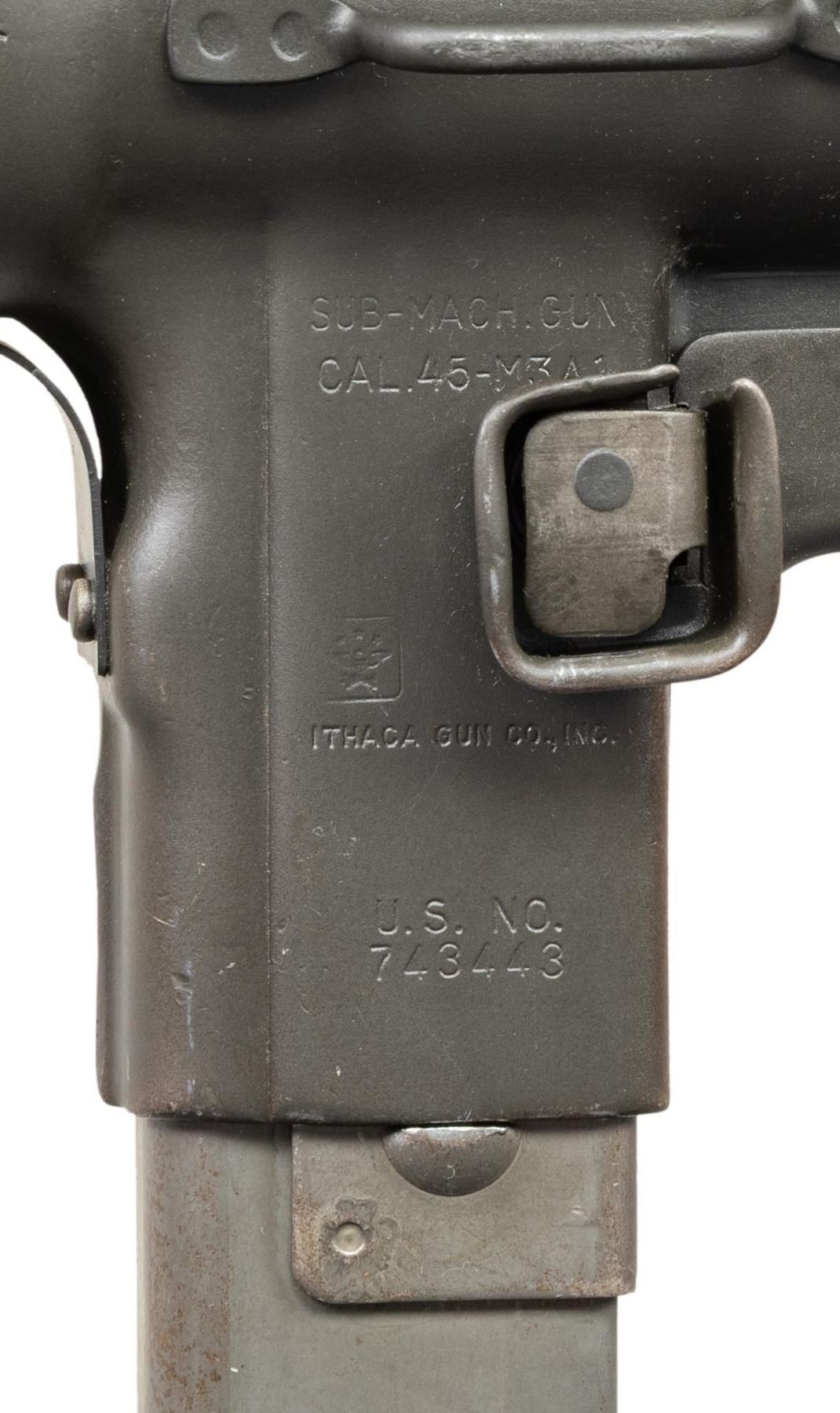 M3A1 GREASE GUN SUBMACHINE GUN. ***BIDDERS INTERESTED IN THIS LOT MUST CURRENTLY HOLD A TYPE 07, 08, 10, OR 11 FFL.*** Cal 45 ACP. S# 743443. Bbl 8". C proof barrel and receiver. Left side of mag well is marked "Sub-mach.gun/cal.45-m3a1/Ithaca Gun Co., Inc./U.S.A./743443". Right side of mag well is marked "Ohio Ordnance Works". MAGS: 1-30 rd. CONDITION: overall very good reparkerized metal finish with a couple of small spots of pitting mostly found around ejection port. Bright shiny bore with nice rifling. POST 1986 DEALER SAMPLE MACHINE GUN WITH NO LAW (DEMO) LETTER REQUIRED TO TRANSFER. RESTRICTED REGISTRATION POSSESSION LIMITED TO CONTINUED COMPLIANCE WITH PROVISIONS OF PUBLIC LAW 99-308. IF YOU ARE AN 07, 08, 10, or 11 FFL/SOT YOU MAY TAKE TRANSFER OF THIS FIREARM UPON APPROVAL OF TRANSFER. PROVENANCE: Military Museum Collection of Shooters Outpost, Hooksett NH. THIS ITEM WILL BE AVAILABLE FOR PREVIEW BY APPOINTMENT AT THE SHOOTERS OUTPOST MUSEUM IN HOOKSETT, NH. TO SET UP AN APPOINTMENT, PLEASE CALL 207-453-2114. (50-1889/ZAL). MODERN CLASS III. $3,000-5,000.