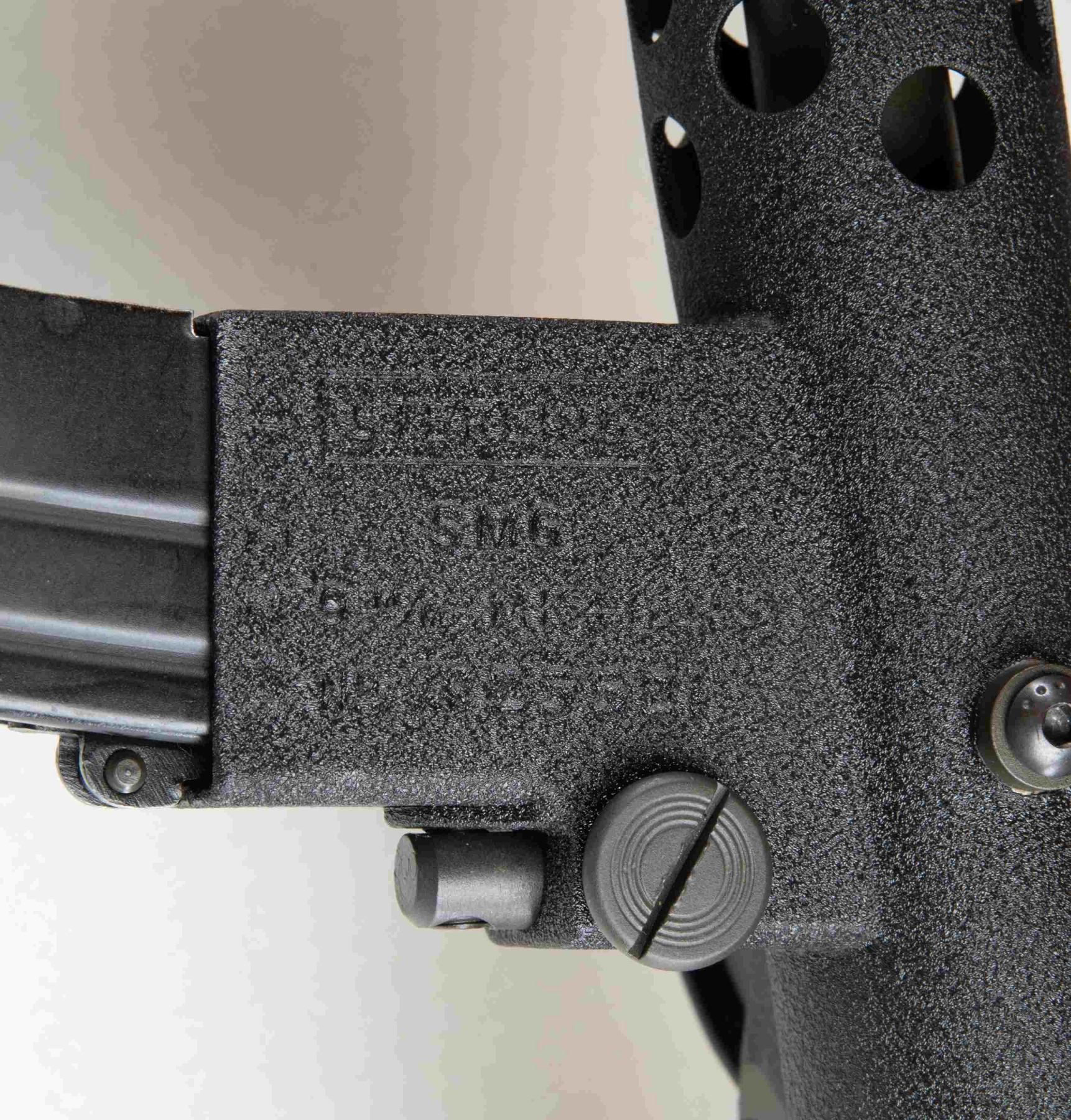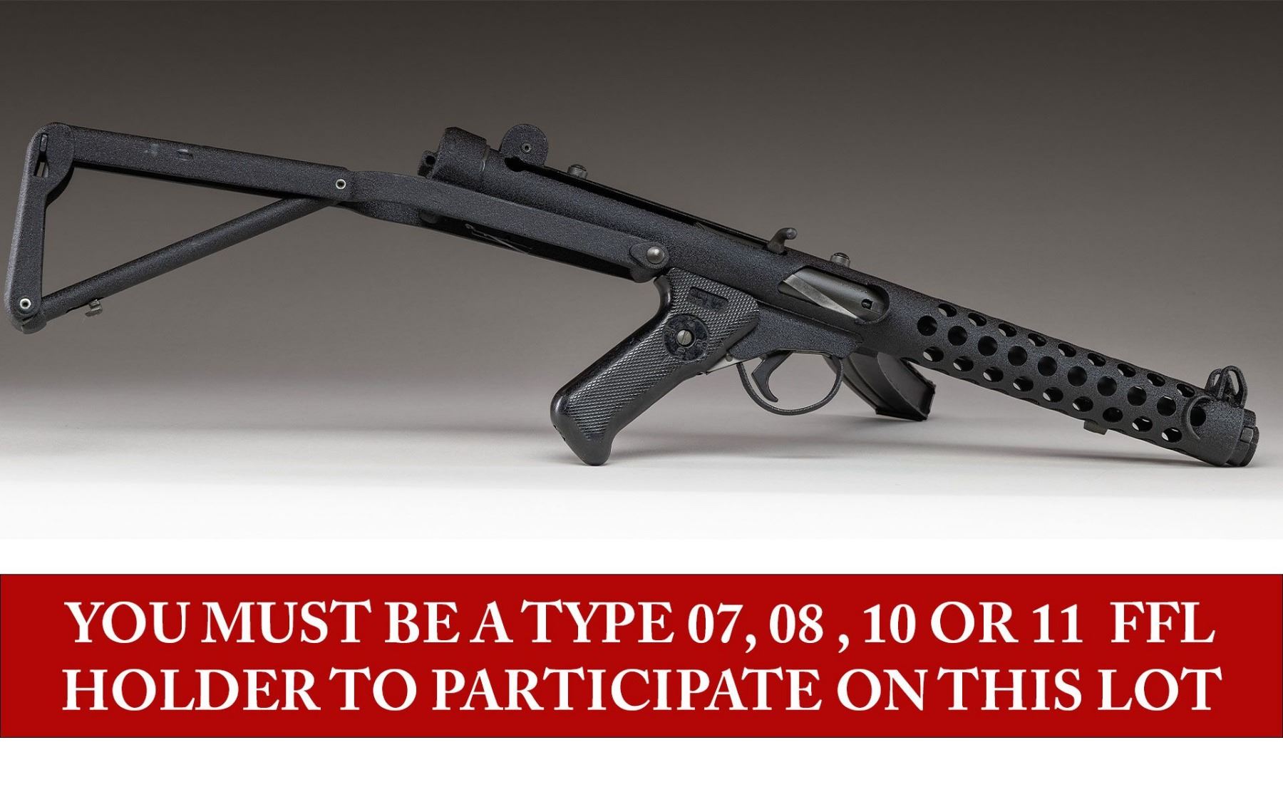 SUBMACHINE GUN. ***BIDDERS INTERESTED IN THIS LOT MUST CURRENTLY HOLD A TYPE 07, 08, 10, OR 11 FFL.*** Cal. 9mm Para. S# JLM-A2011P. Bbl. 8". Top of mag well is marked "STERLING / SMG / 9m/m MK 1 / No KR25521". Left side of tube is marked "JLM & SONS / Manchester NH / MKIV JLM-A2011P". A, R, & S right hand selector. Folding stock. Checkered composite pistol grip. MAGS: 1-34rd. CONDITION: overall near excellent black wrinkle or powdered type reapplied finish. Pistol grip shows scattered mild handling marks. Bright shiny bore with sharp rifling. Bolt shows minimal signs of cycling. Mechanically sound when cycled by hand. POST 1986 DEALER SAMPLE MACHINE GUN WITH NO LAW (DEMO) LETTER REQUIRED TO TRANSFER. RESTRICTED REGISTRATION POSSESSION LIMITED TO CONTINUED COMPLIANCE WITH PROVISIONS OF PUBLIC LAW 99-308. IF YOU ARE AN 07, 08, 10, or 11 FFL/SOT YOU MAY TAKE TRANSFER OF THIS FIREARM UPON APPROVAL OF TRANSFER. PROVENANCE: Military Museum Collection of Shooters Outpost, Hooksett NH. THIS ITEM WILL BE AVAILABLE FOR PREVIEW BY APPOINTMENT AT THE SHOOTERS OUTPOST MUSEUM IN HOOKSETT, NH. TO SET UP AN APPOINTMENT, PLEASE CALL 207-453-2114. (50-1865/ZAL). MODERN CLASS III. $1,200-1,800.