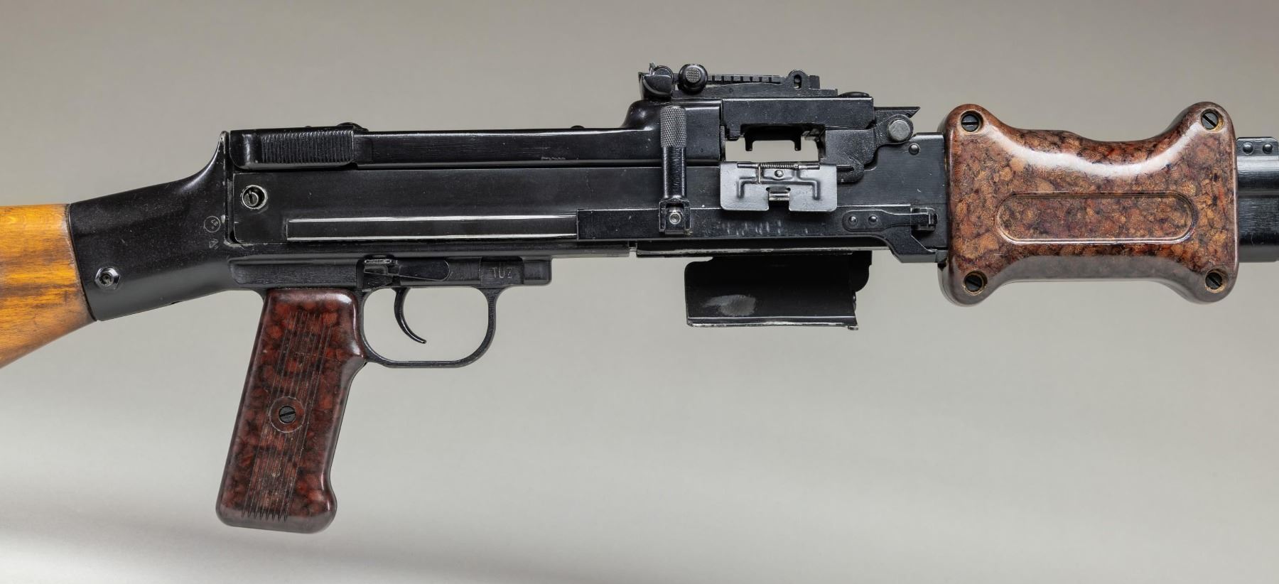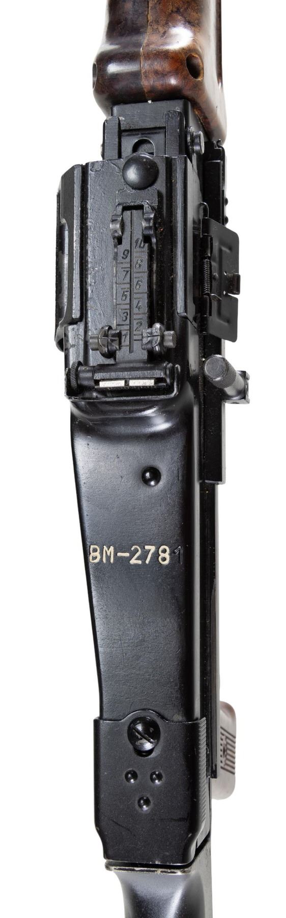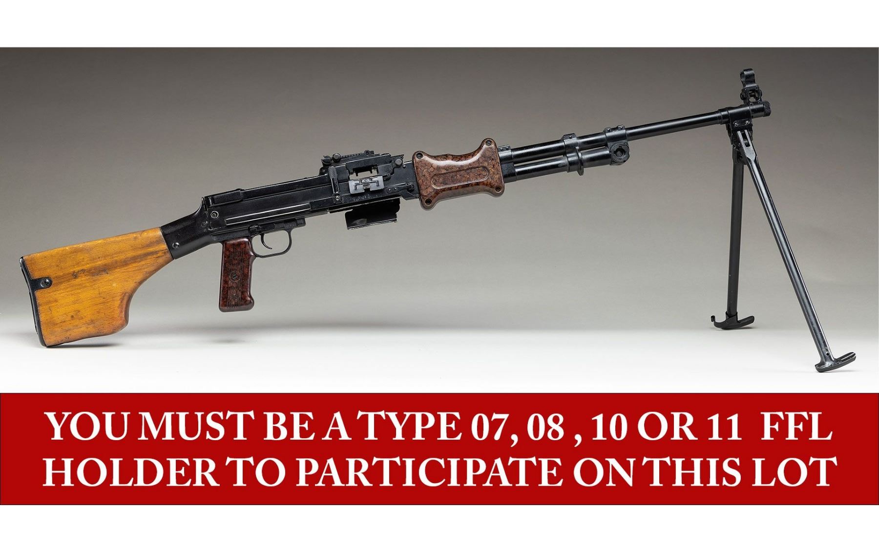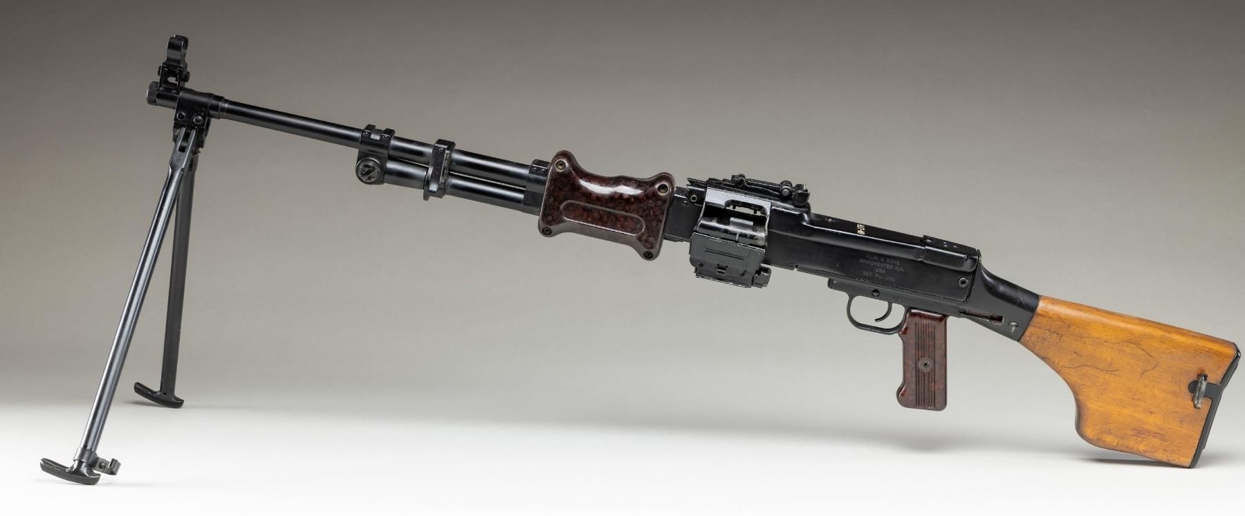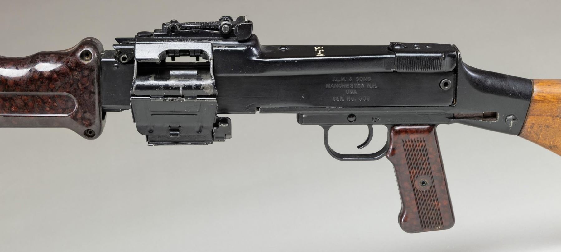 MACHINE GUN. ***BIDDERS INTERESTED IN THIS LOT MUST CURRENTLY HOLD A TYPE 07, 08, 10, OR 11 FFL.*** Cal. 7.62x39. S# 008. Bbl 20". Protected post front sight. Rear sight graduated to 1000 meters. All external parts except the receiver have matching serial number. BM-2781. Composite 2 piece hand guard and pistol grip. Hard wood stock with compartmentalized butt plate. Left side of the receiver is marked "J.LM. & Sons/ Manchester N.H./USA". CONDITION: overall very good with flaking finish on top cover and feeding mechanism assembly. Scattered light handling mark. Furniture show mild handling marks and light scratches. Bright bore with sharp rifling. POST 1986 DEALER SAMPLE MACHINE GUN WITH NO LAW (DEMO) LETTER REQUIRED TO TRANSFER. RESTRICTED REGISTRATION POSSESSION LIMITED TO CONTINUED COMPLIANCE WITH PROVISIONS OF PUBLIC LAW 99-308. IF YOU ARE AN 07, 08, 10, or 11 FFL/SOT YOU MAY TAKE TRANSFER OF THIS FIREARM UPON APPROVAL OF TRANSFER. PROVENANCE: Military Museum Collection of Shooters Outpost, Hooksett NH. THIS ITEM WILL BE AVAILABLE FOR PREVIEW BY APPOINTMENT AT THE SHOOTERS OUTPOST MUSEUM IN HOOKSETT, NH. TO SET UP AN APPOINTMENT, PLEASE CALL 207-453-2114. (50-1852/ZAL). MODERN. CLASS III. $3,500-5,500.